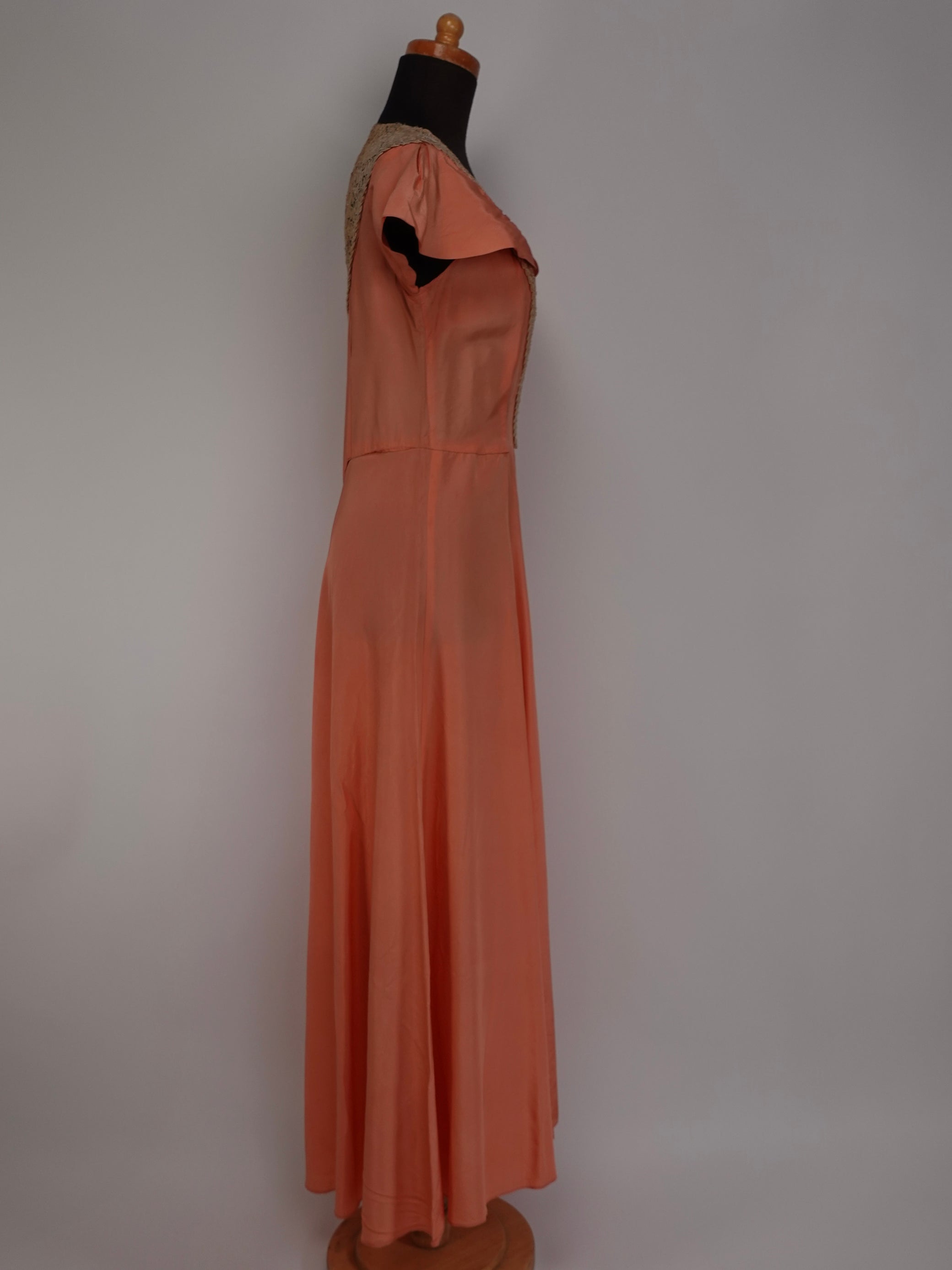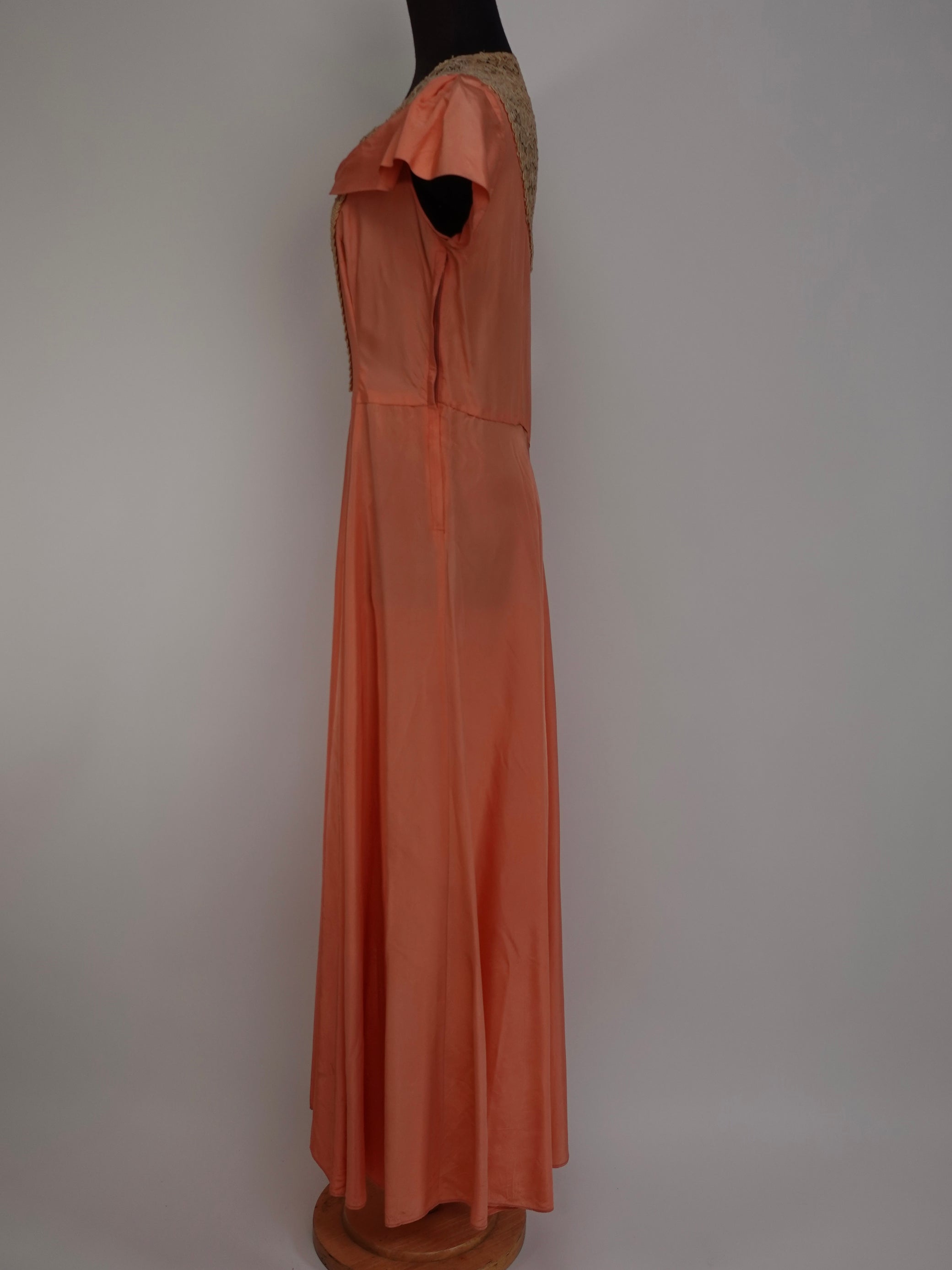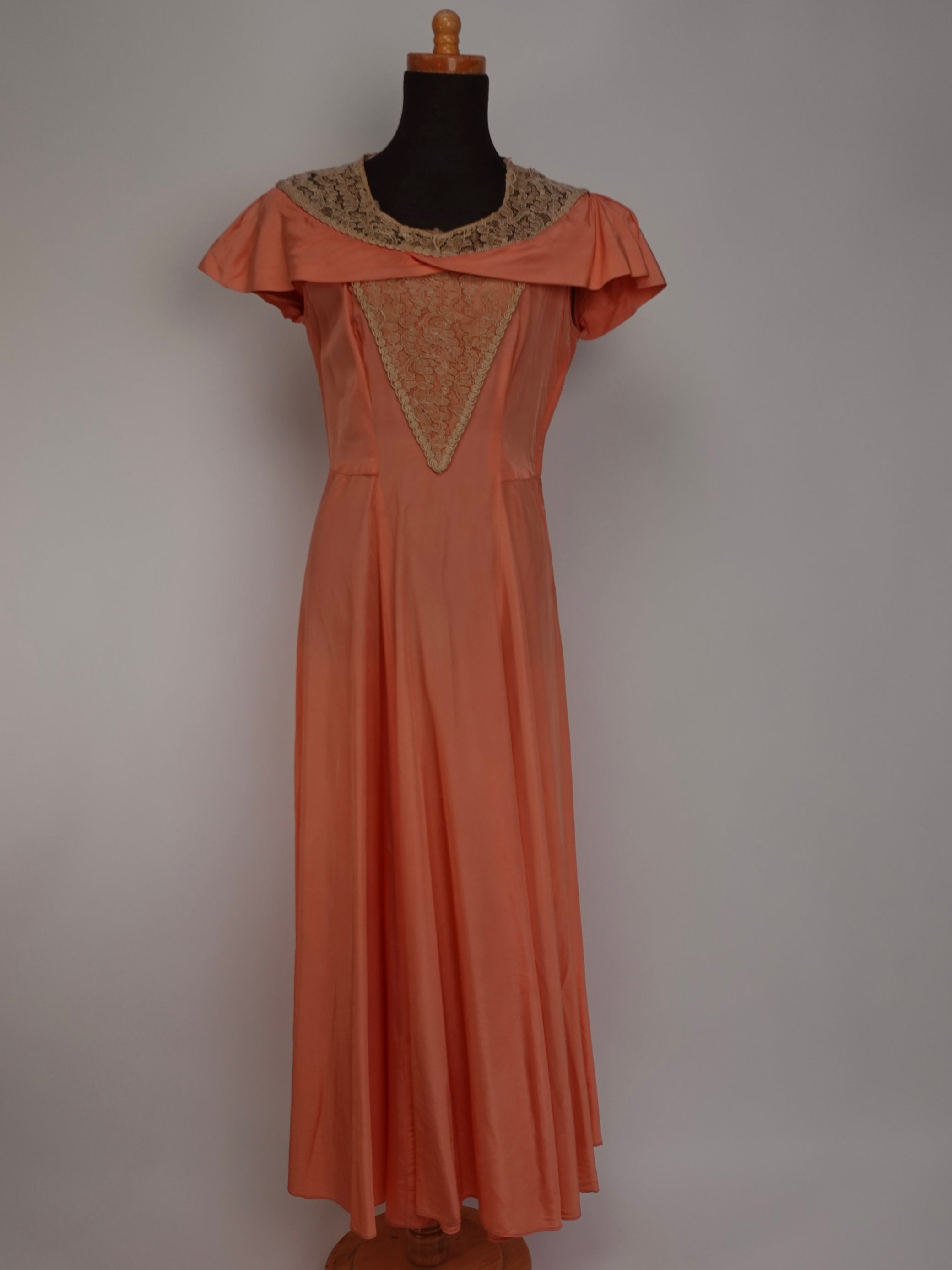 Elegant special occasion, 1930's full length dress. Neckline features draped lace insert and capped sleeves. The lace insert is repeated in the bodice forming a flattering V-line to accentuate the waist. Skirt is full and also full length. Flaws in photos but overall good condition. SHOULDERS: 34" BUST: 37" WAIST: 30" HIPS: 25" LENGTH: 56"