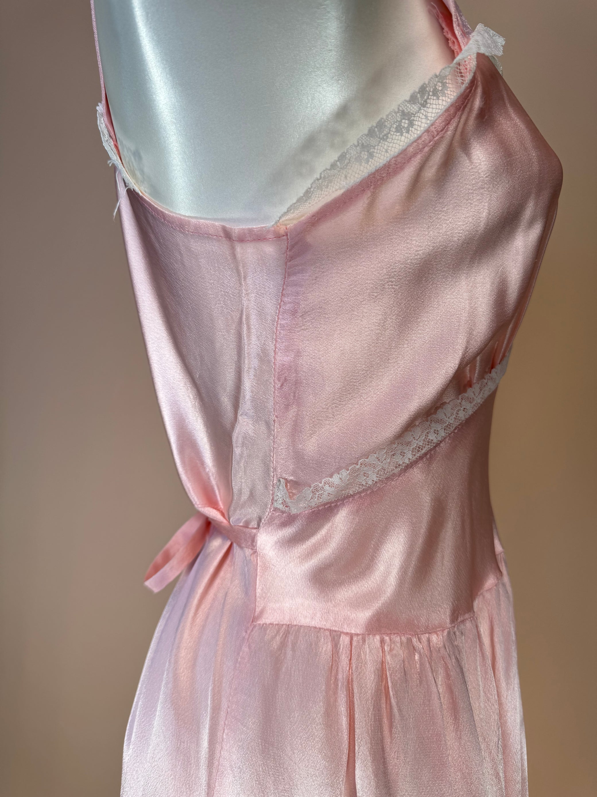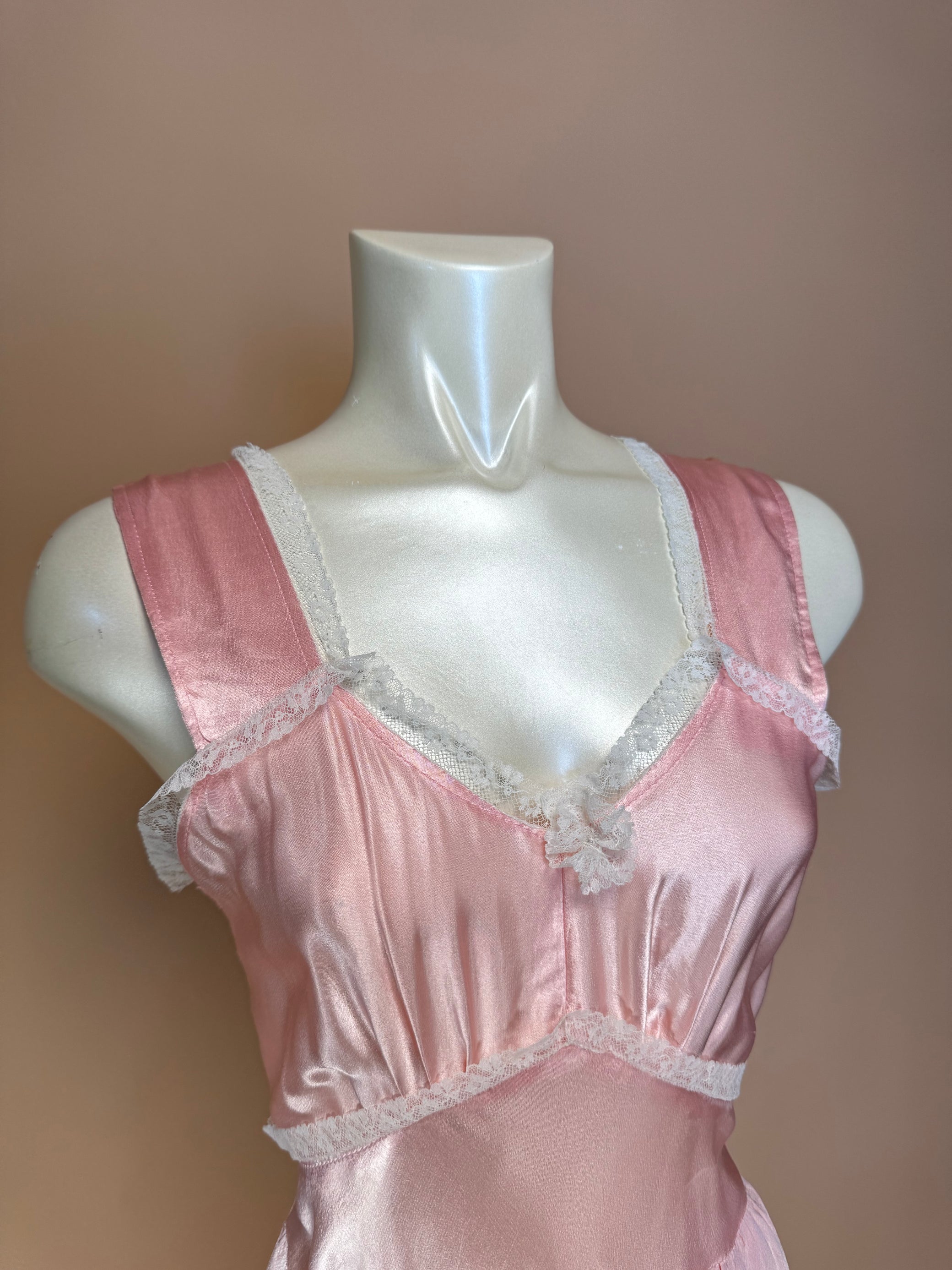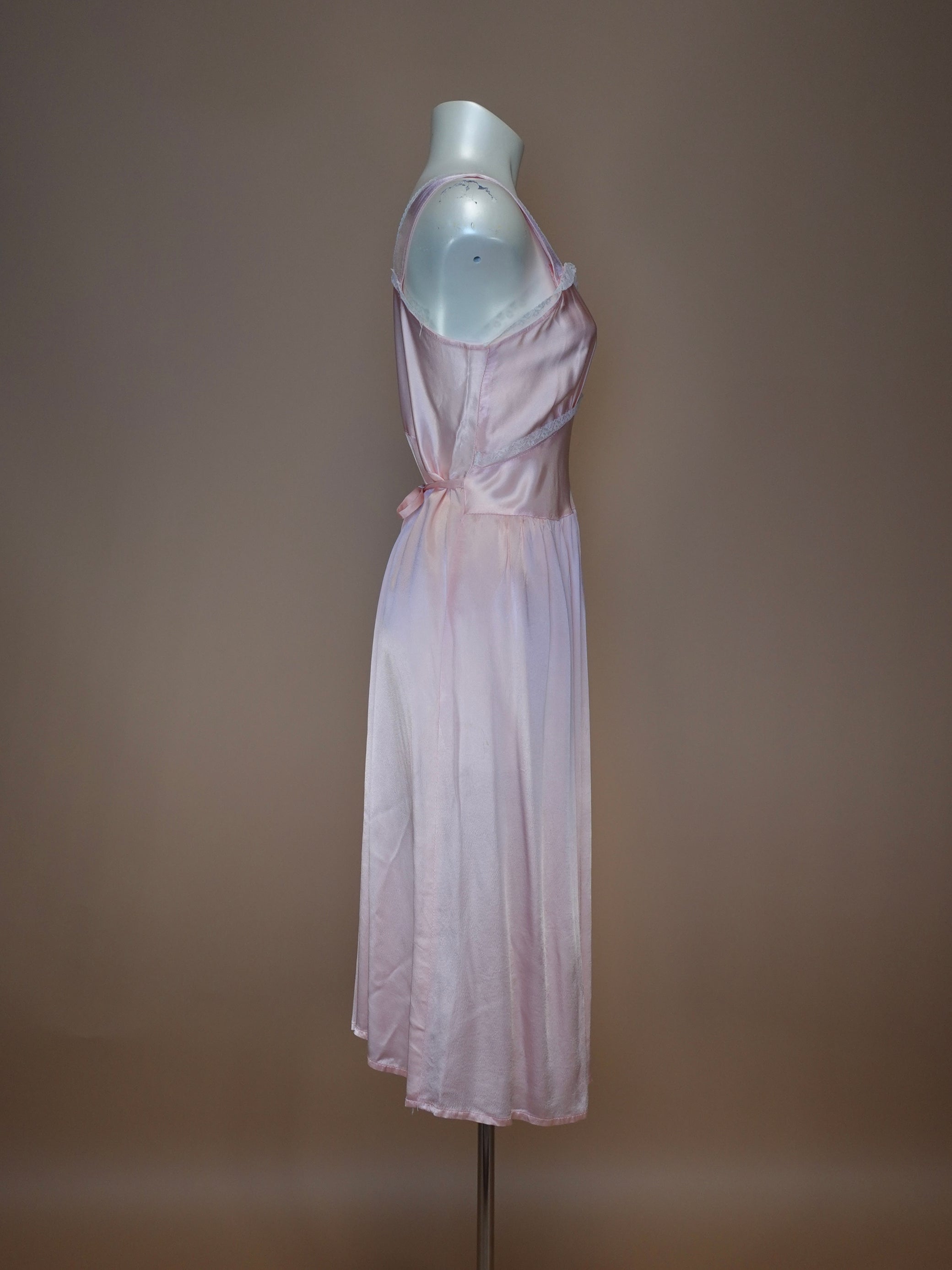 Vintage 1940s - Baby Pink Satin Silk Night Gown With Lace Bow & Bust Detailing