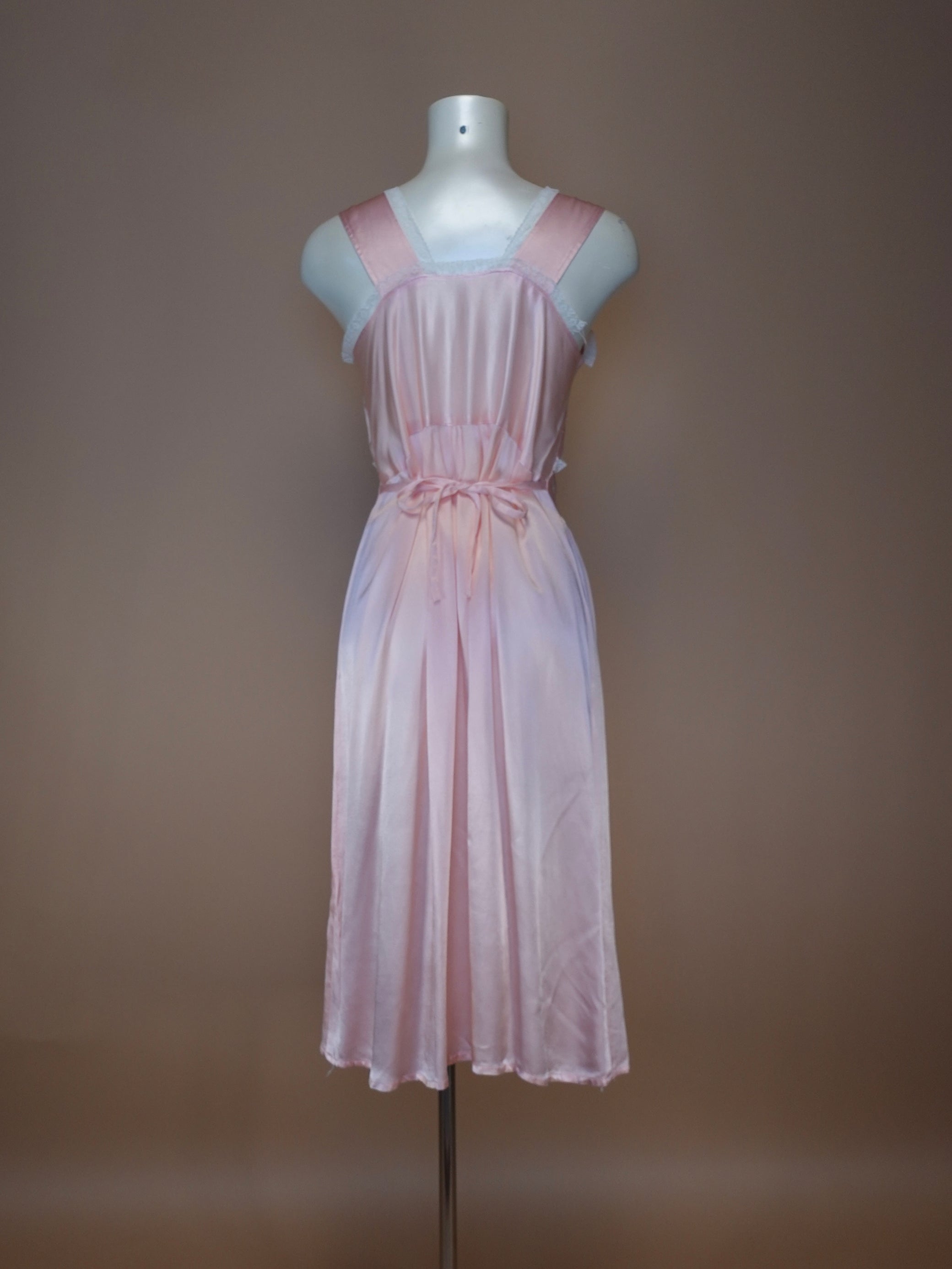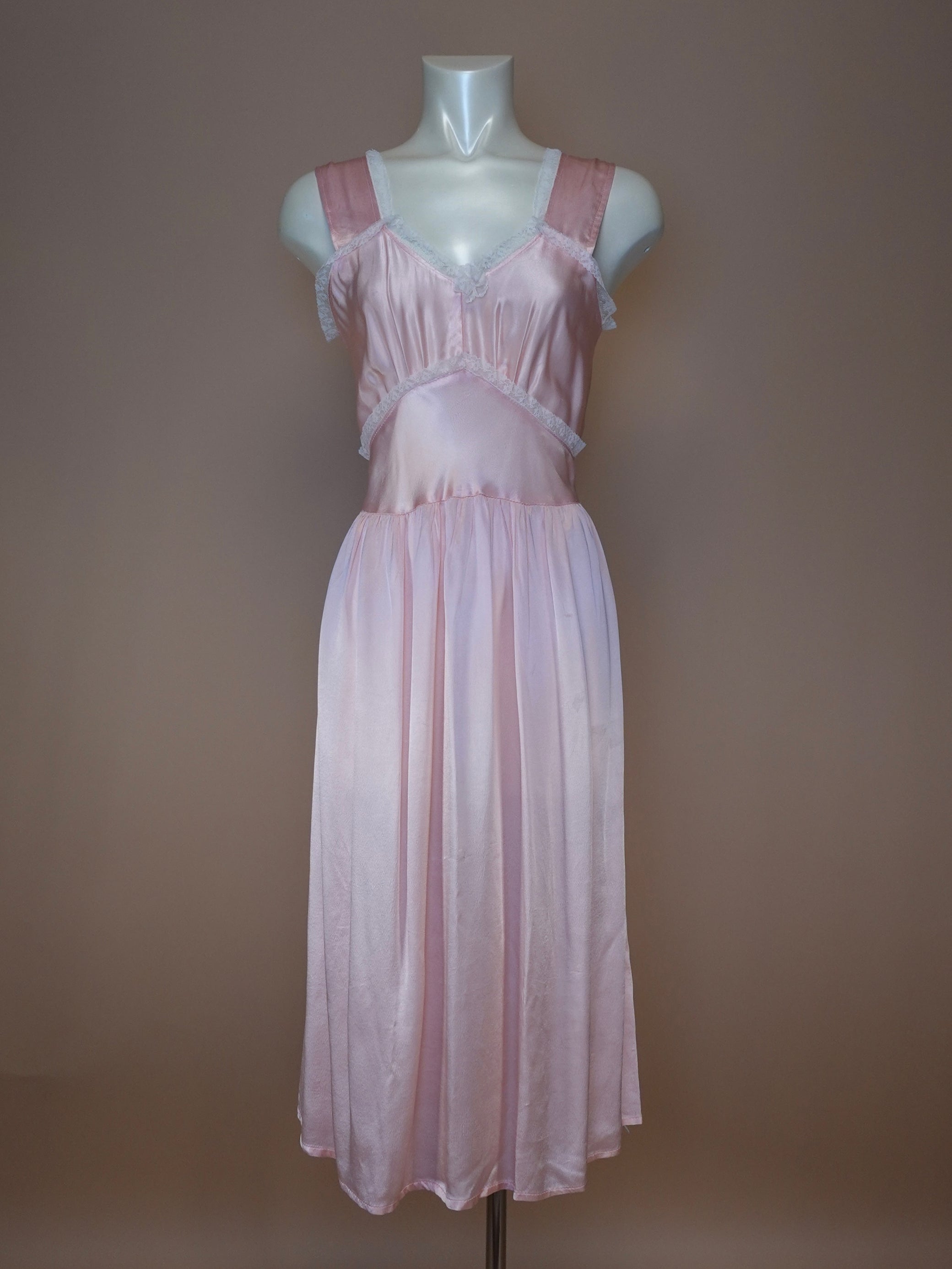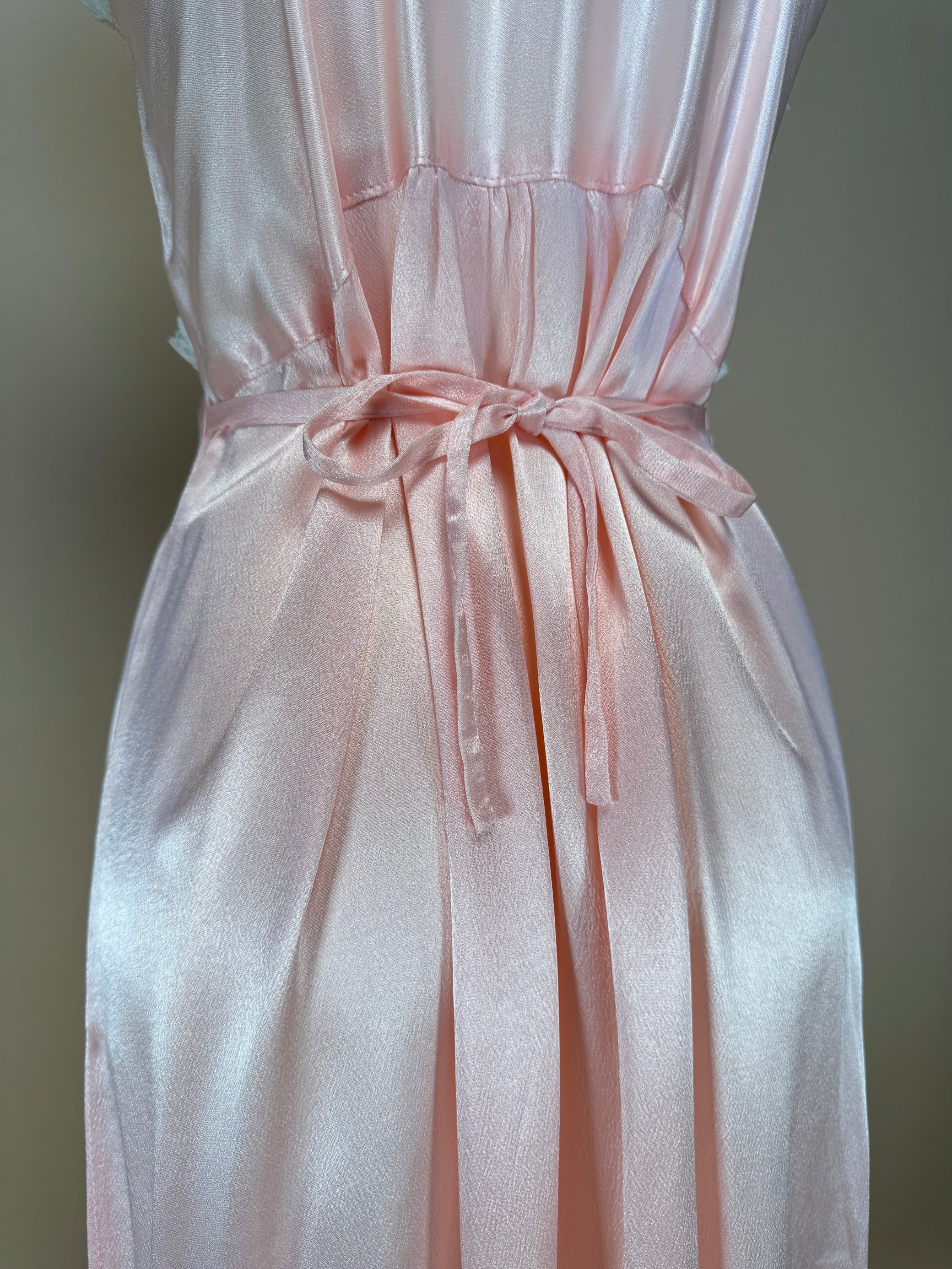 Vintage 1940s - Baby Pink Satin Silk Night Gown With Lace Bow & Bust Detailing