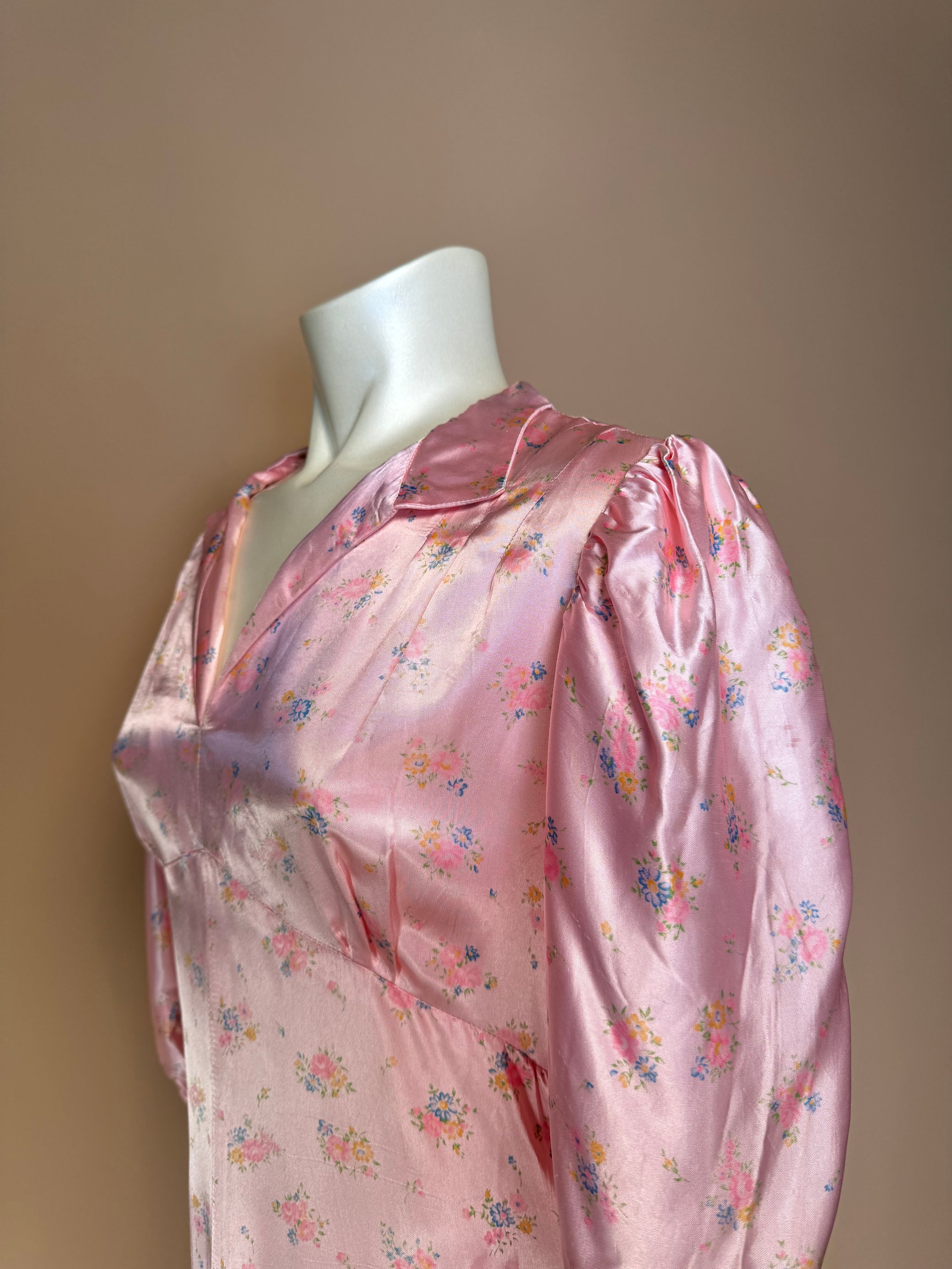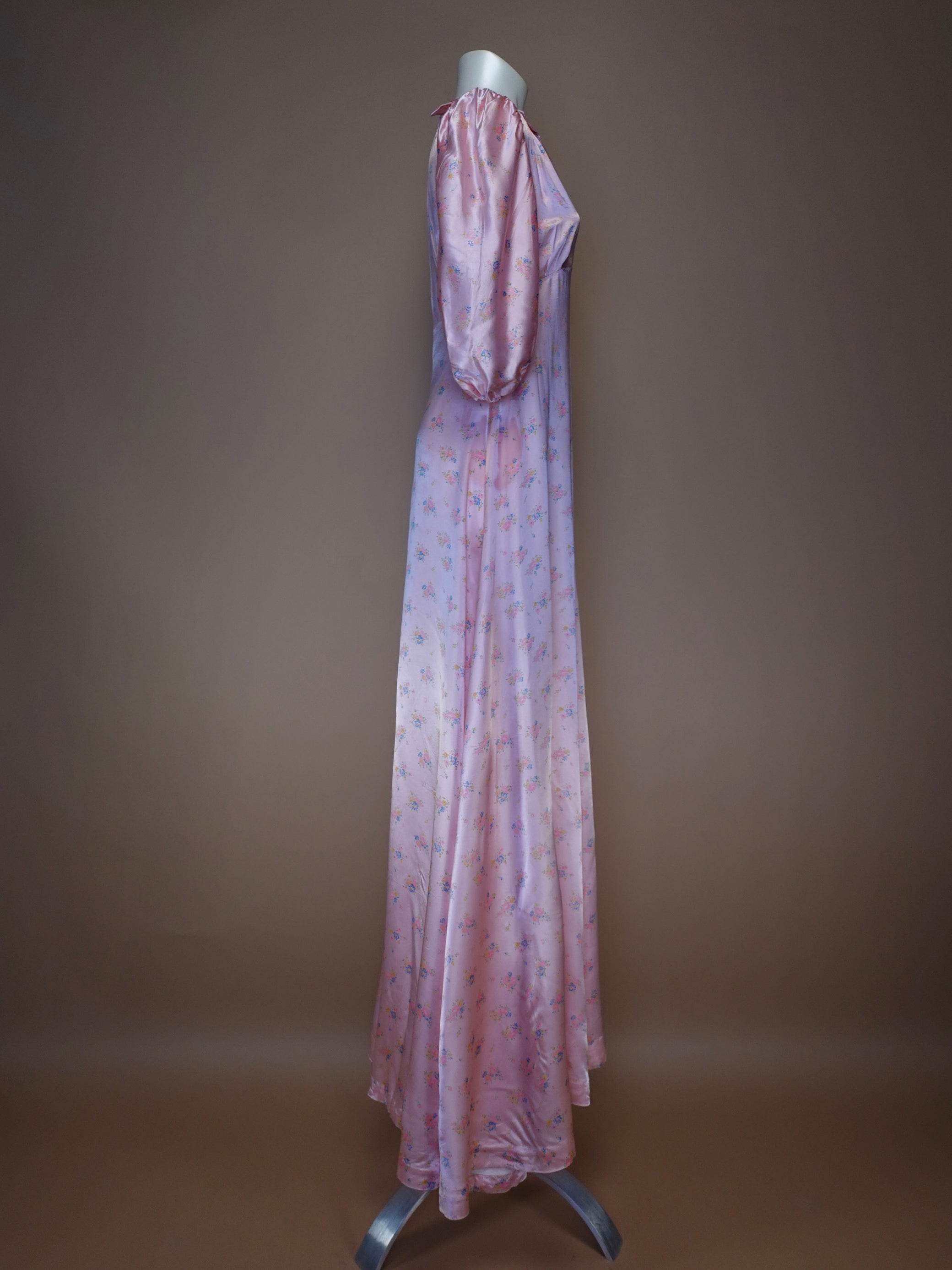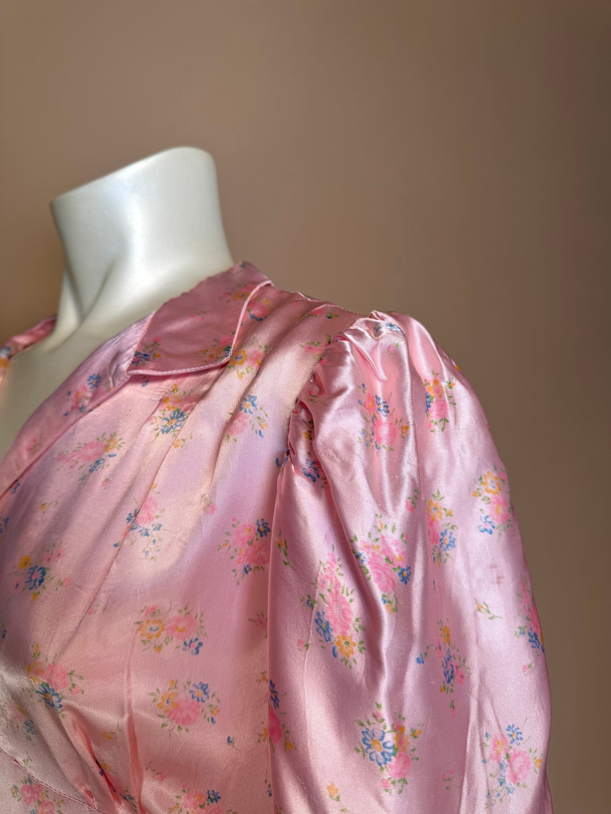 Vintage 1940s - Pink Floral Silk Puffed Sleeve Night Gown