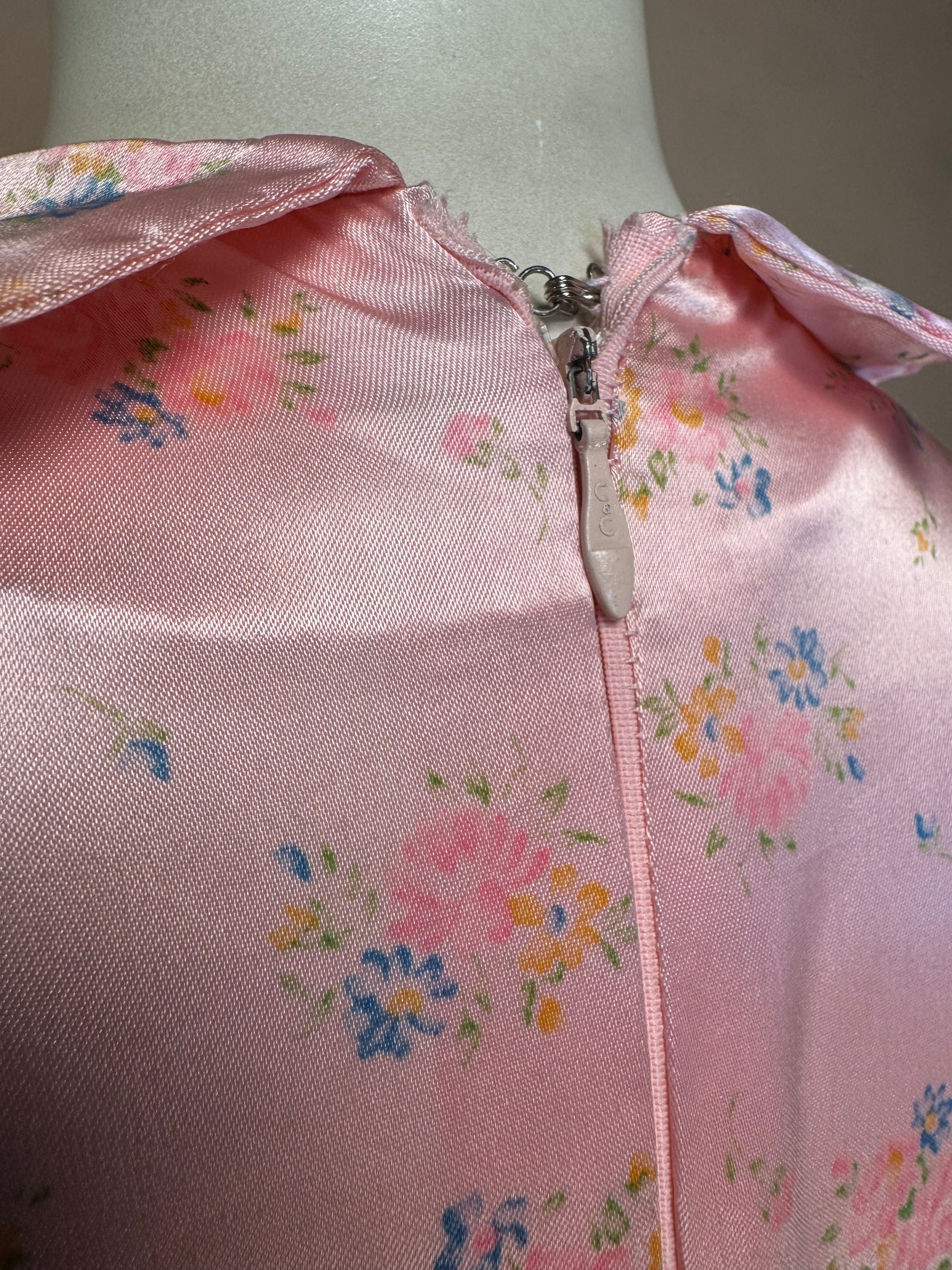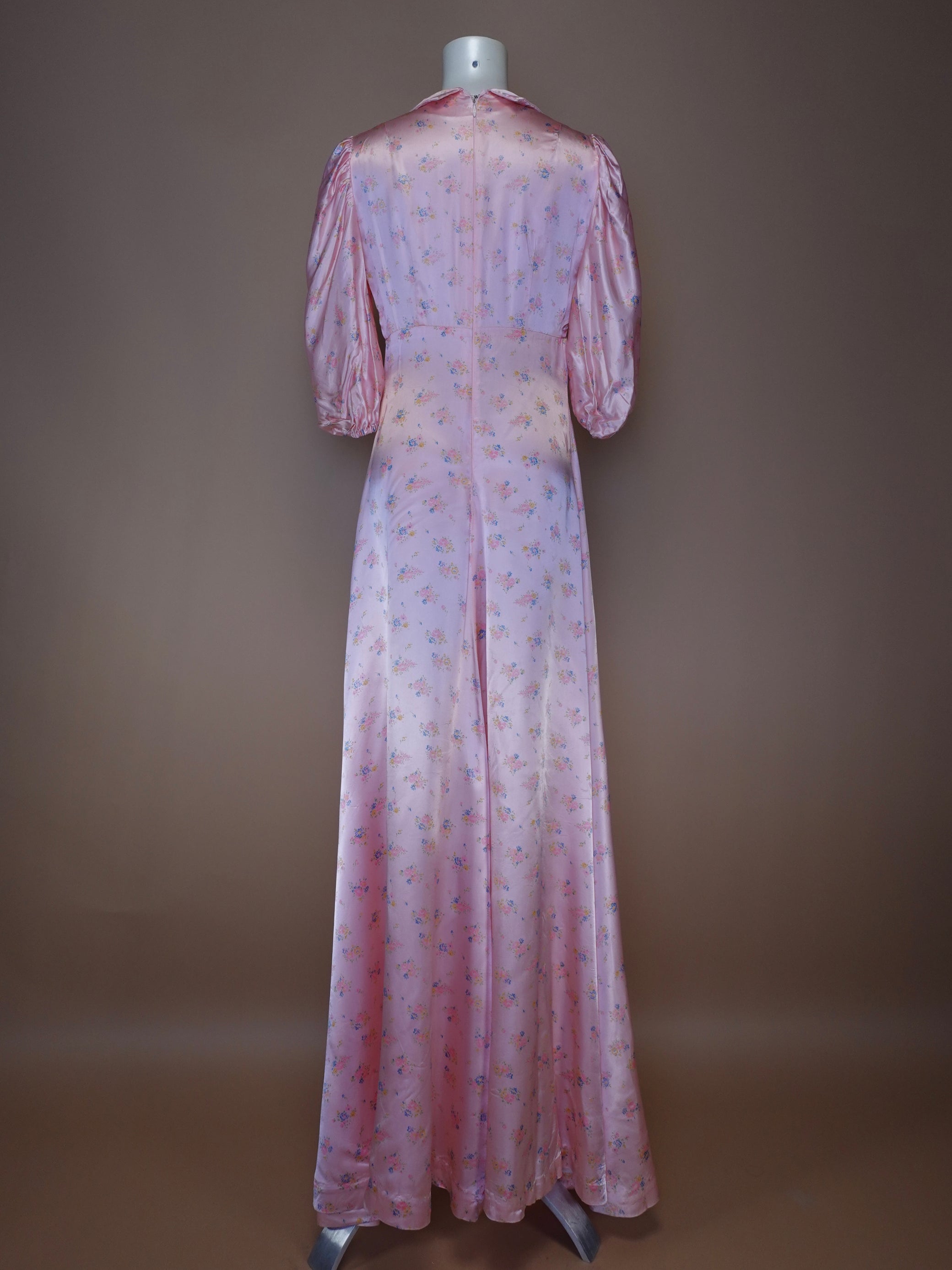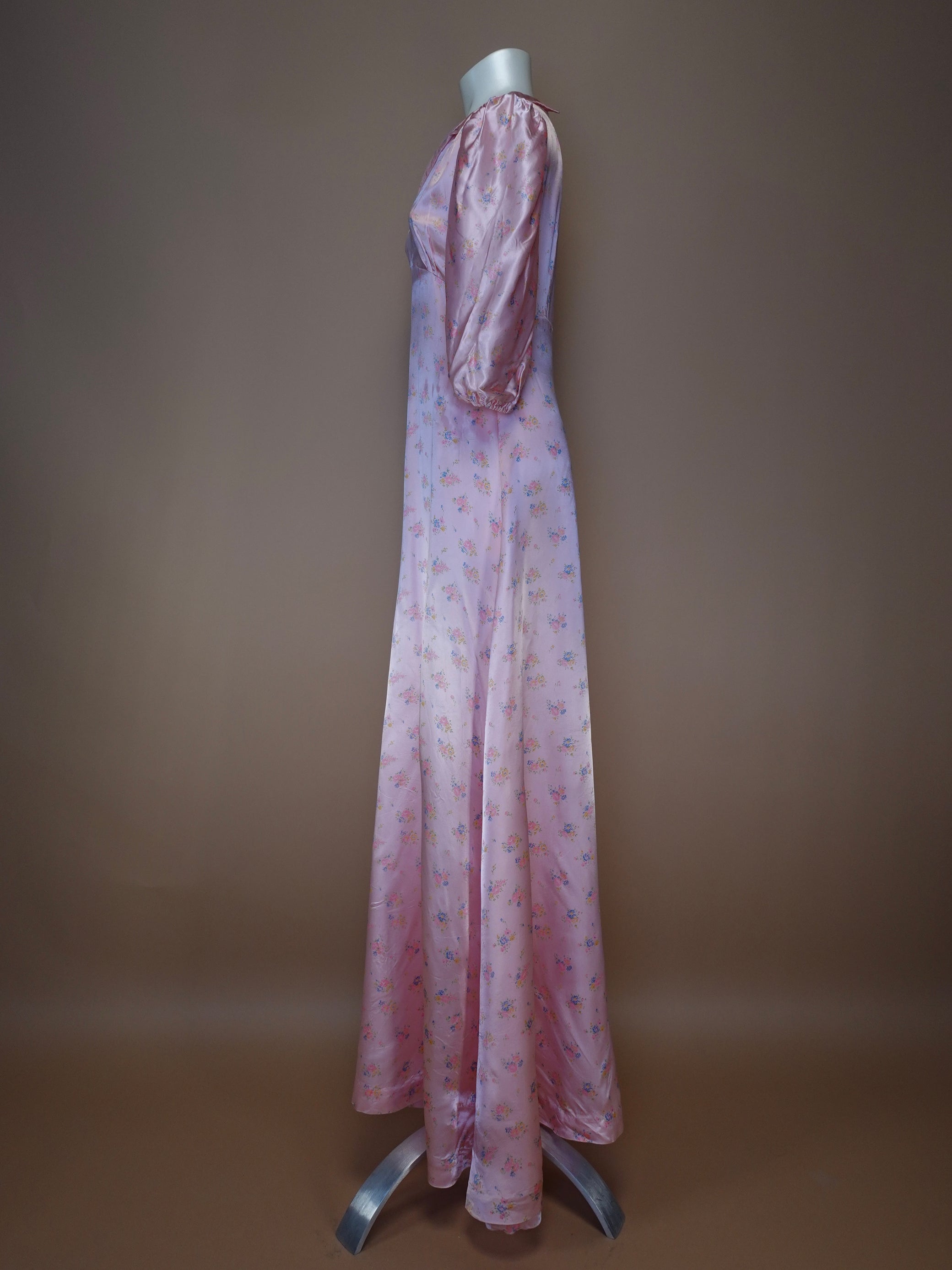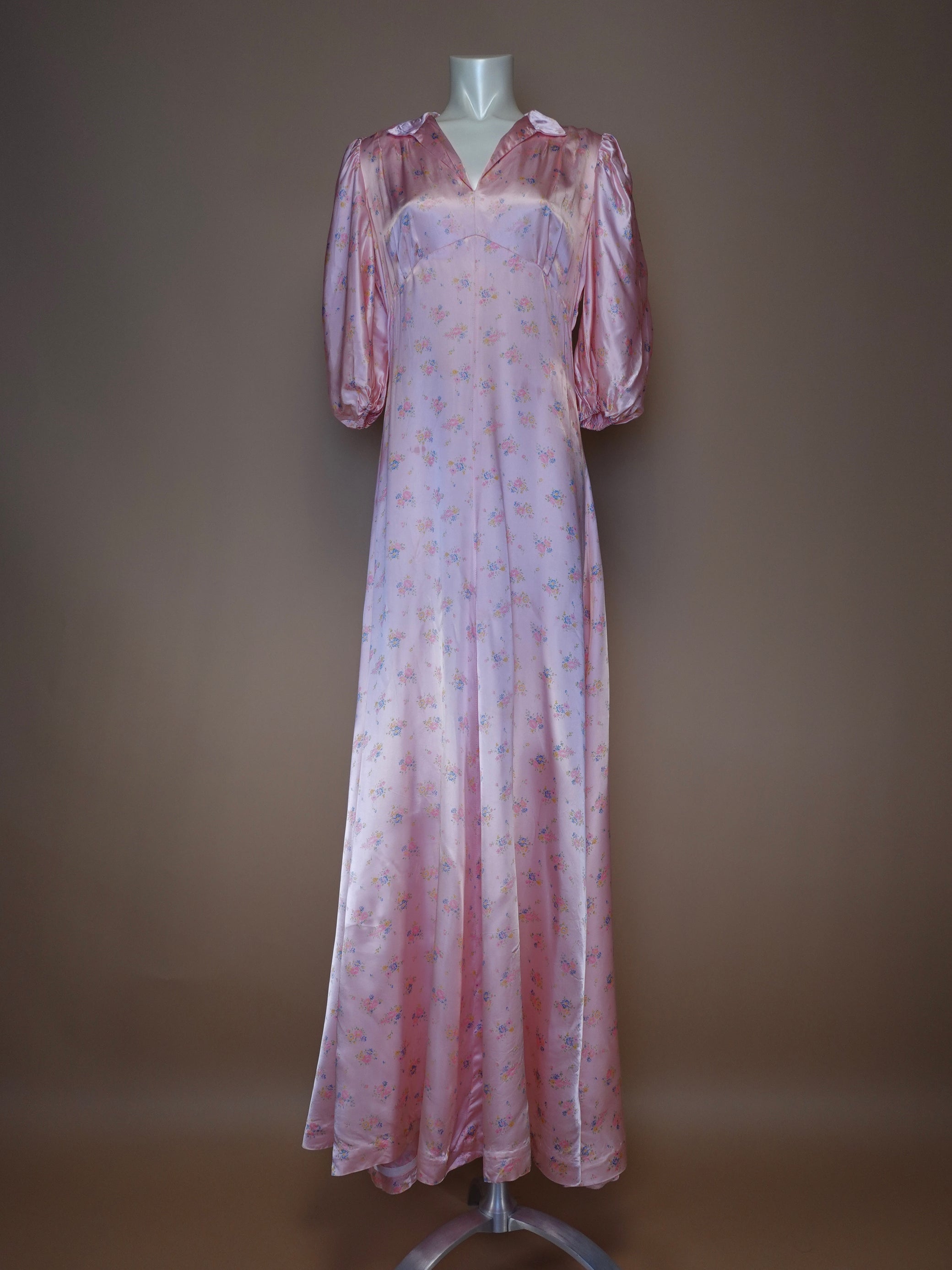 Vintage 1940s - Pink Floral Silk Puffed Sleeve Night Gown