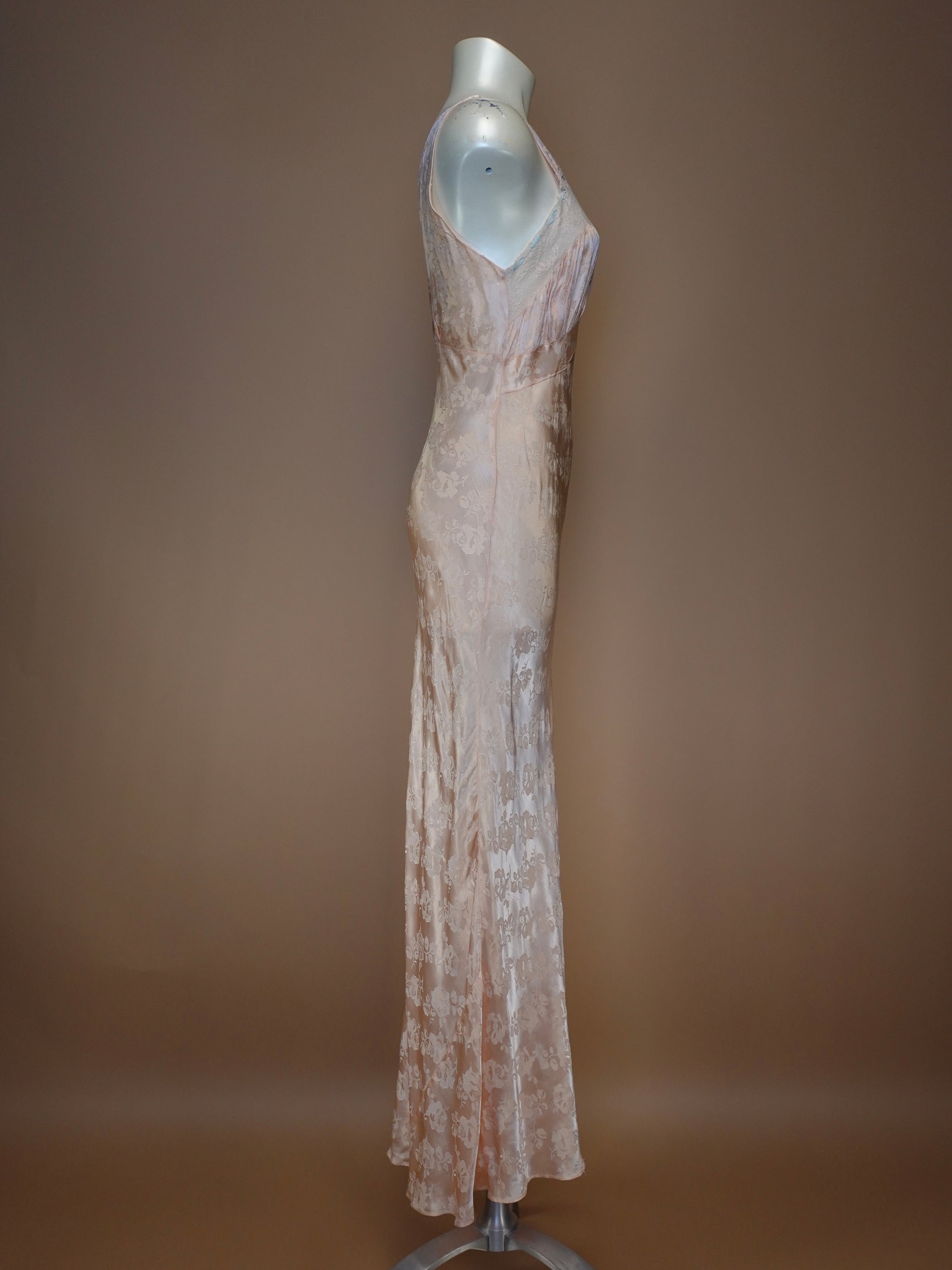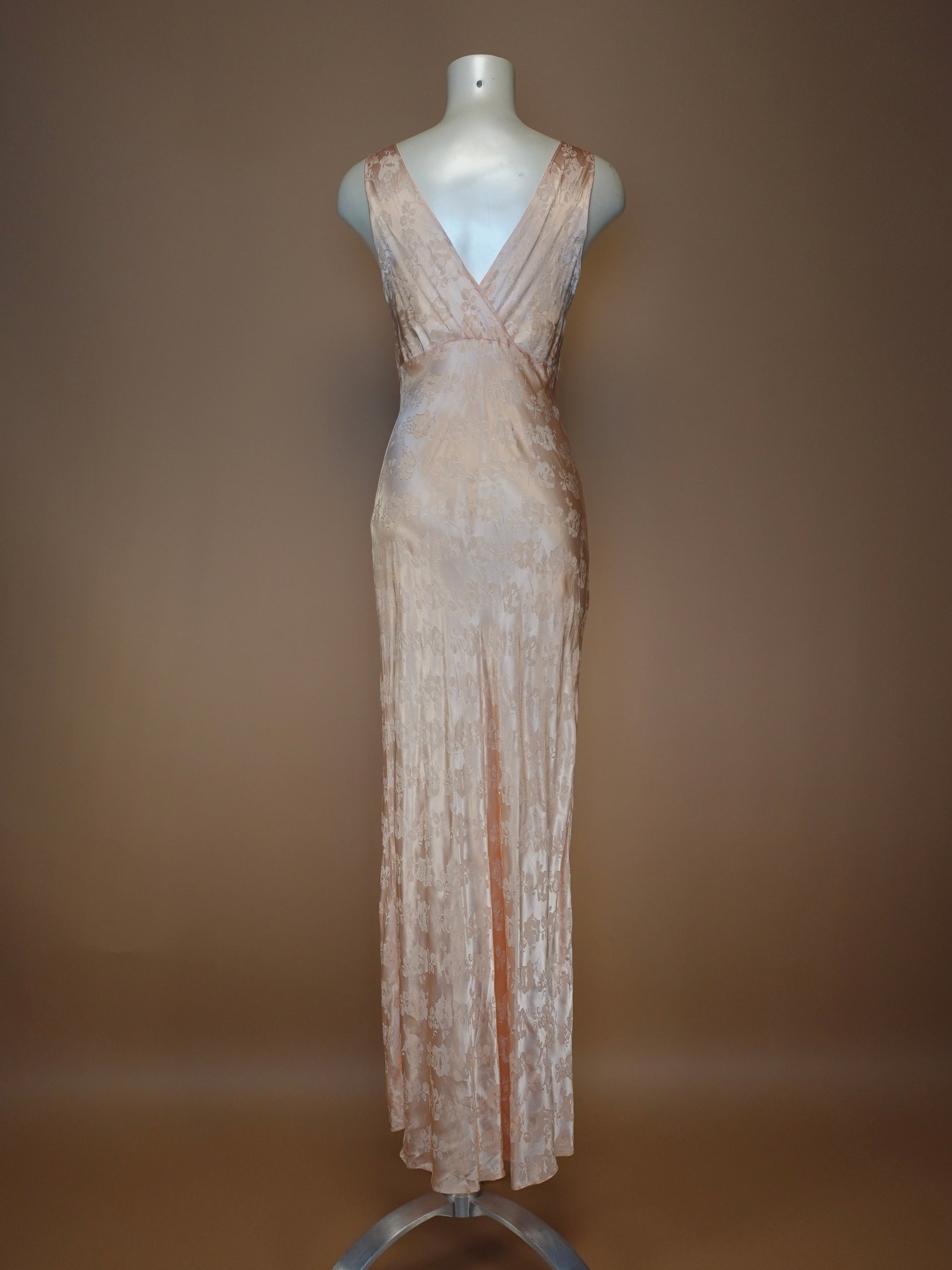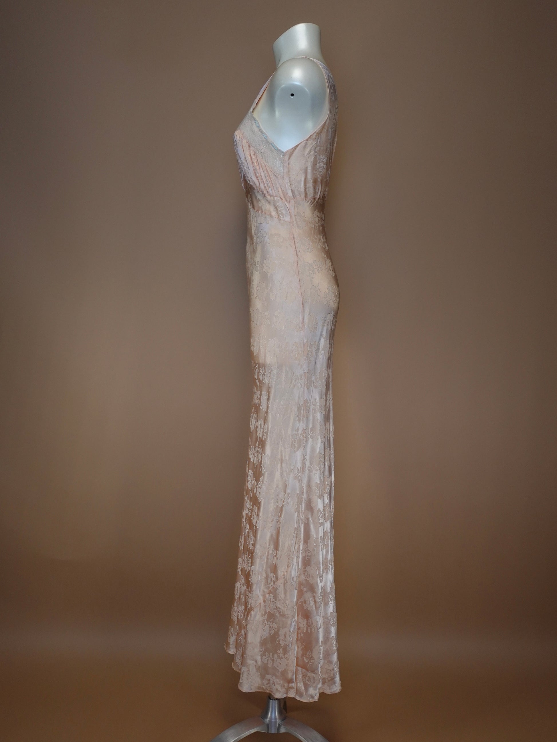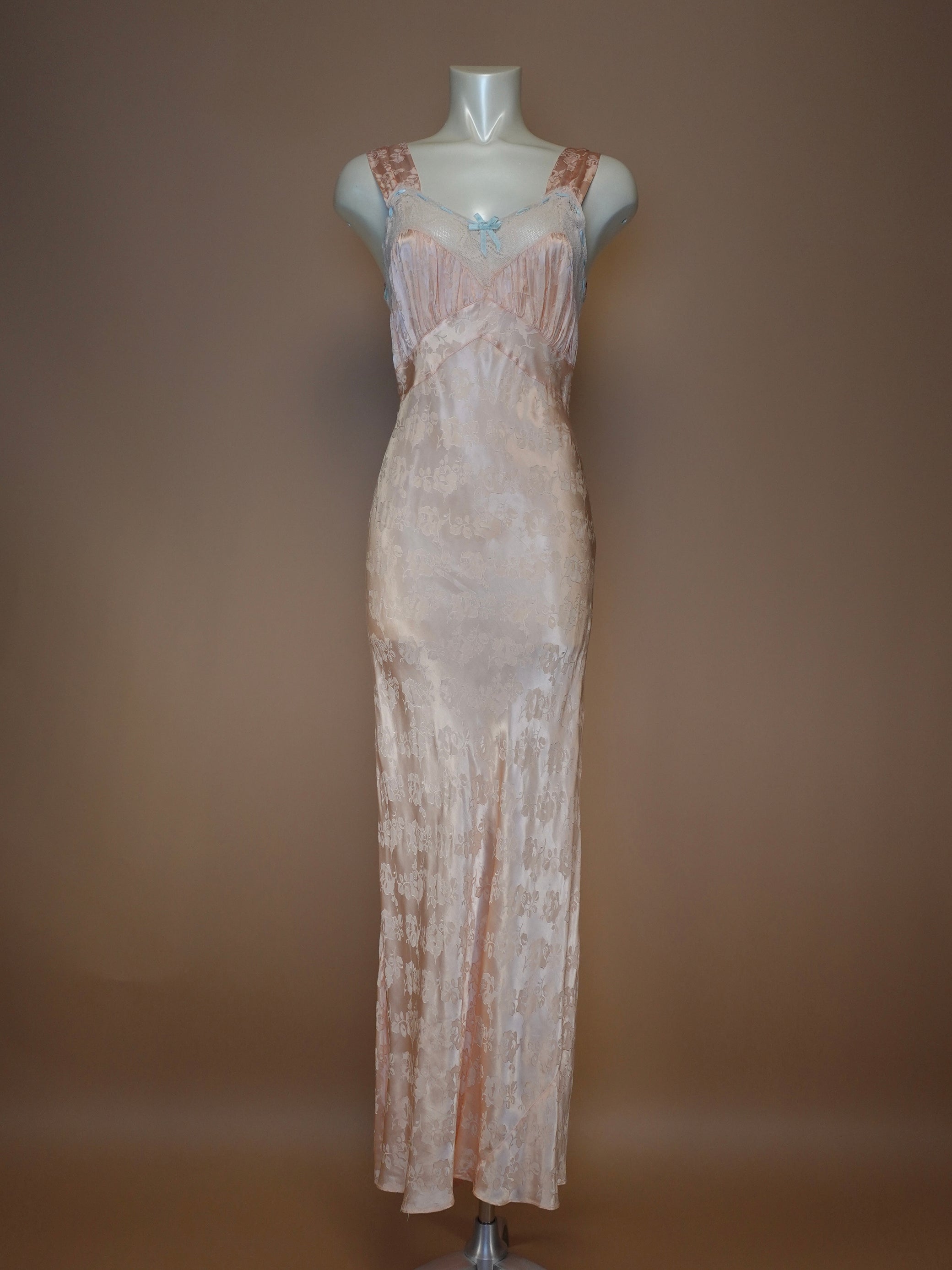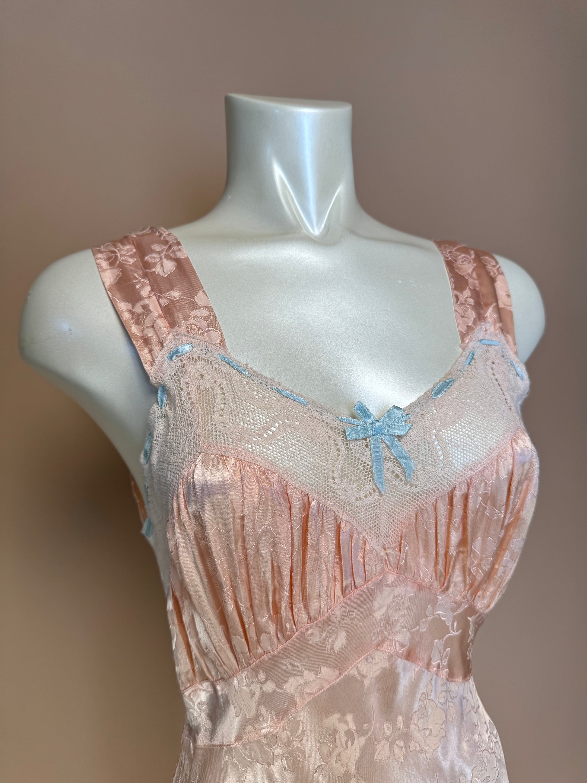 1940S - PINK SATIN SILK NIGHT GOWN WITH EMBOSSED ROSES PATTERN/LACE BUST DETAILING