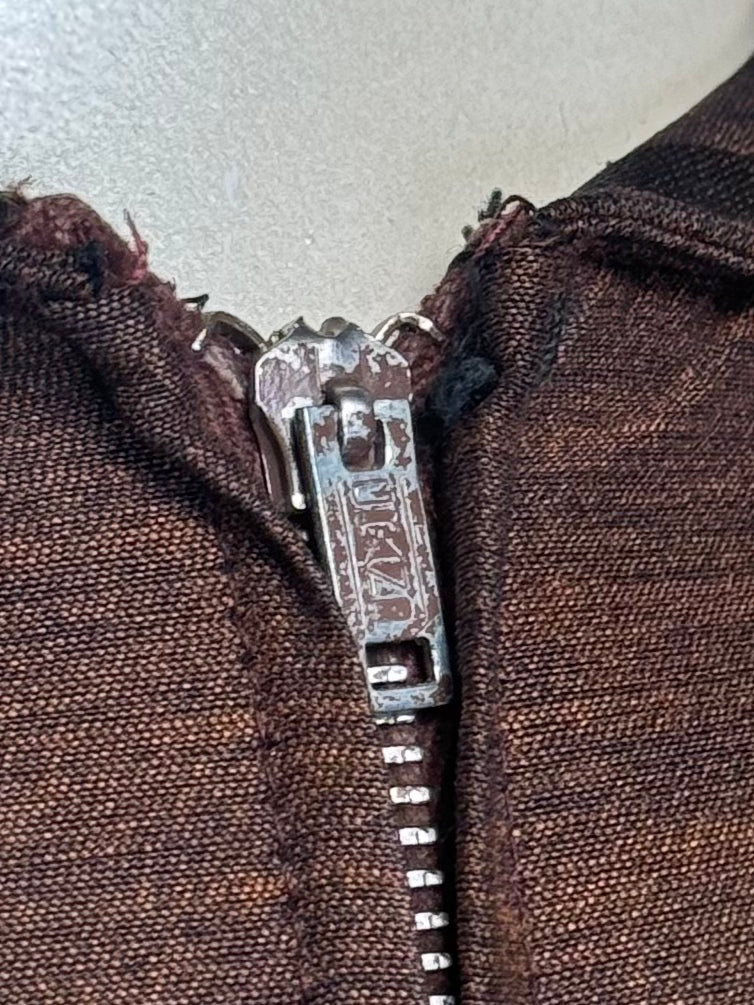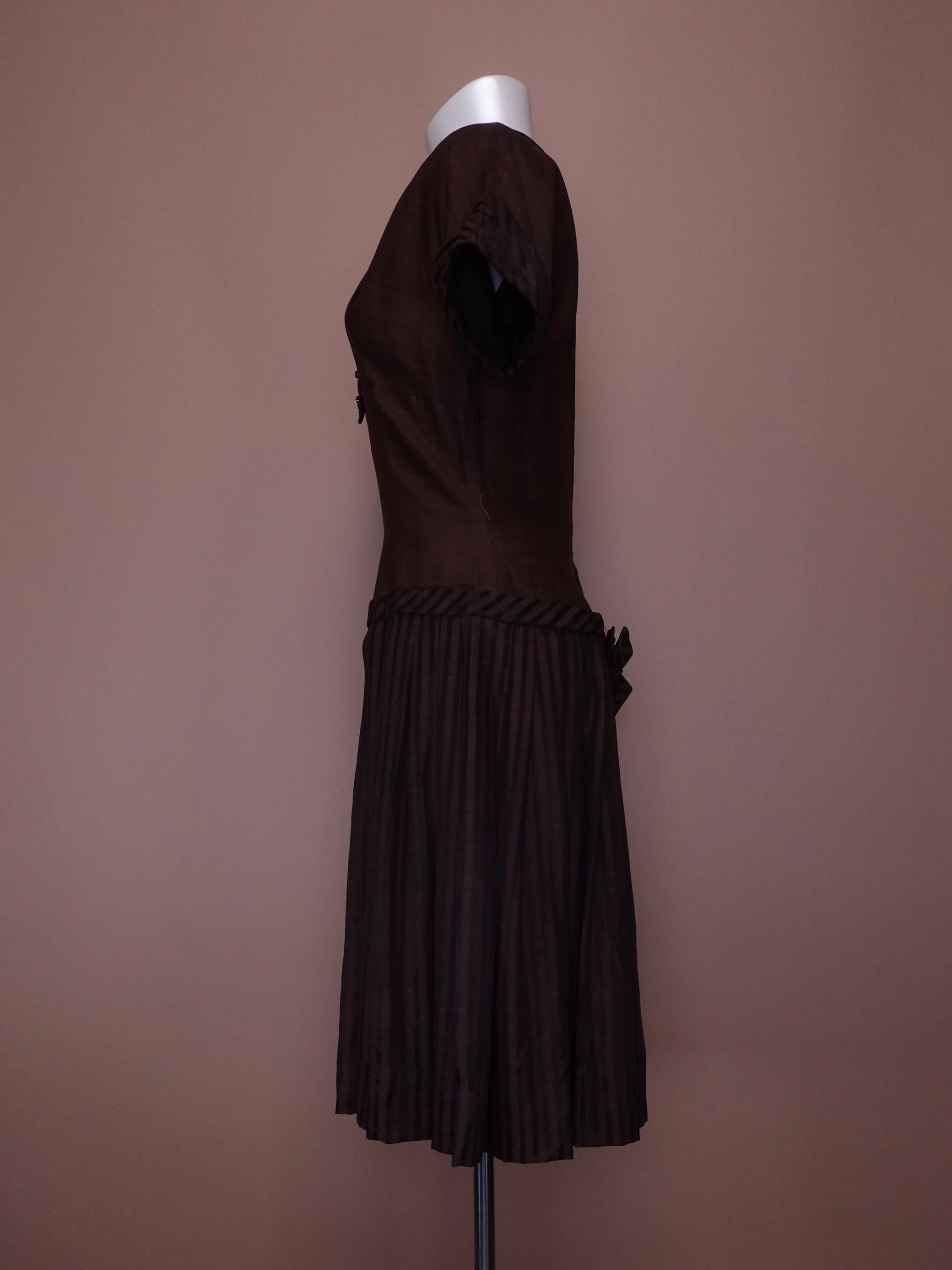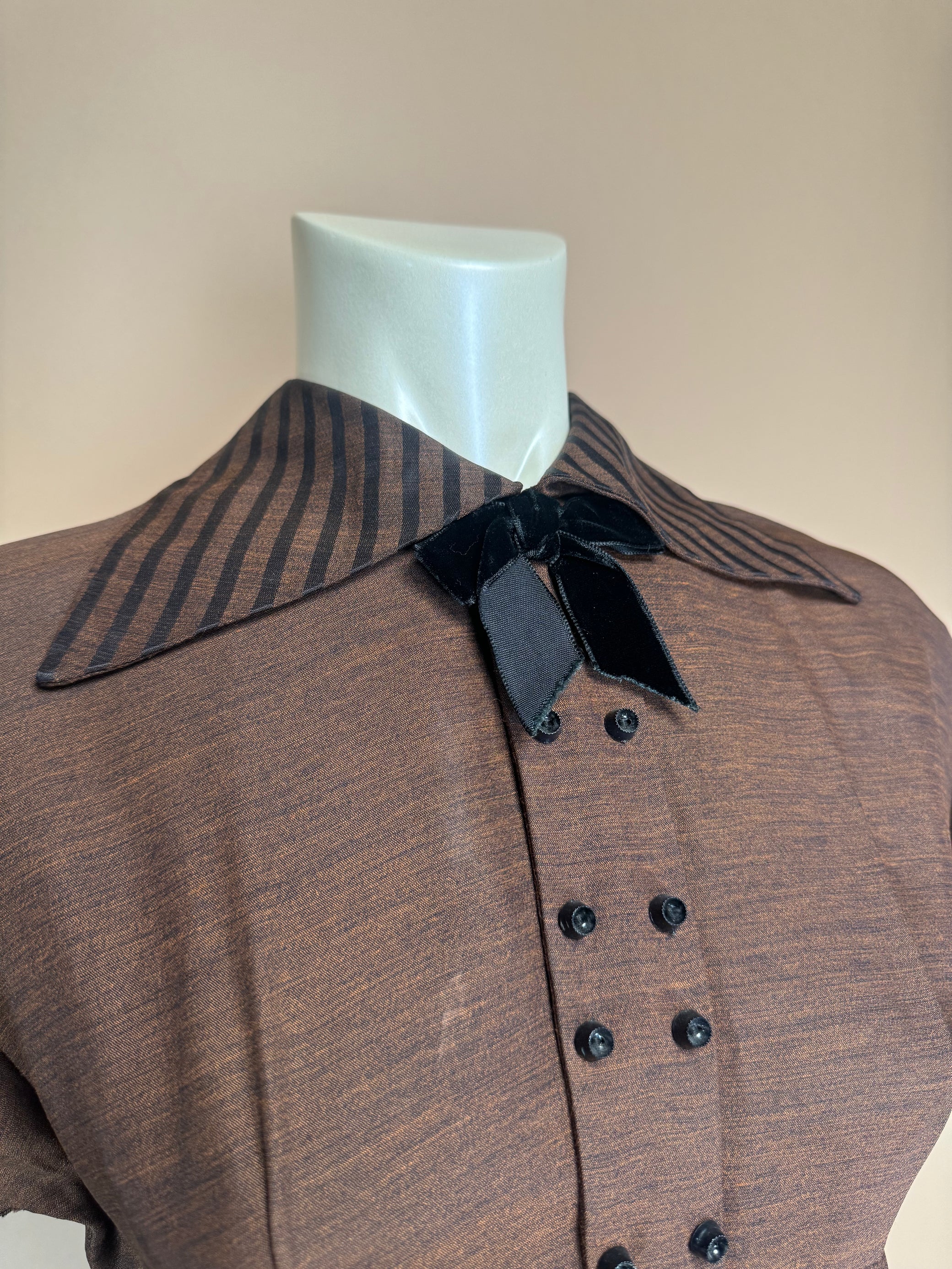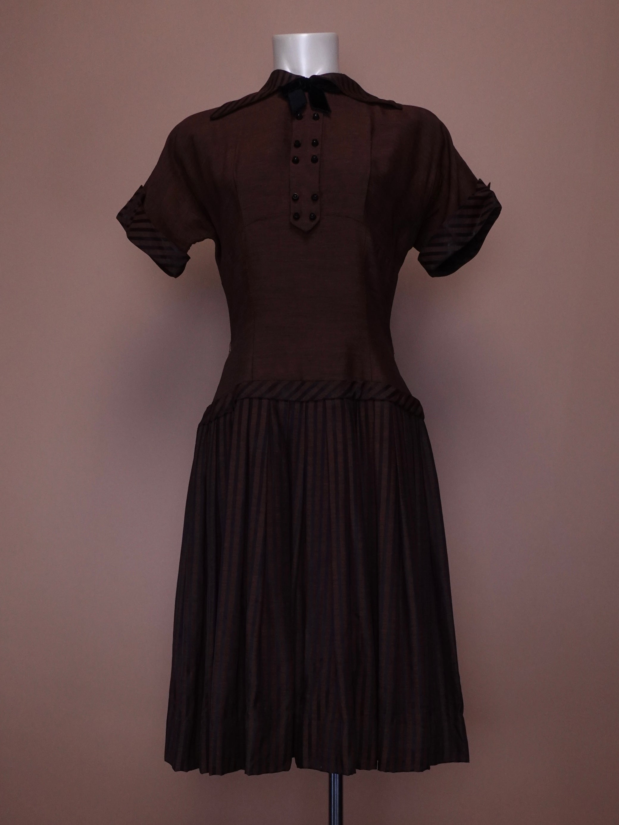 Brown and black striped dress circa 1940s-50s. Dagger collared with mock tie sudsed with buttons. Striped trim and skirt with drop waist and fitted rib. Zips up the back. Under bust seam with darting. Very tailored. Short sleeved. Good condition.