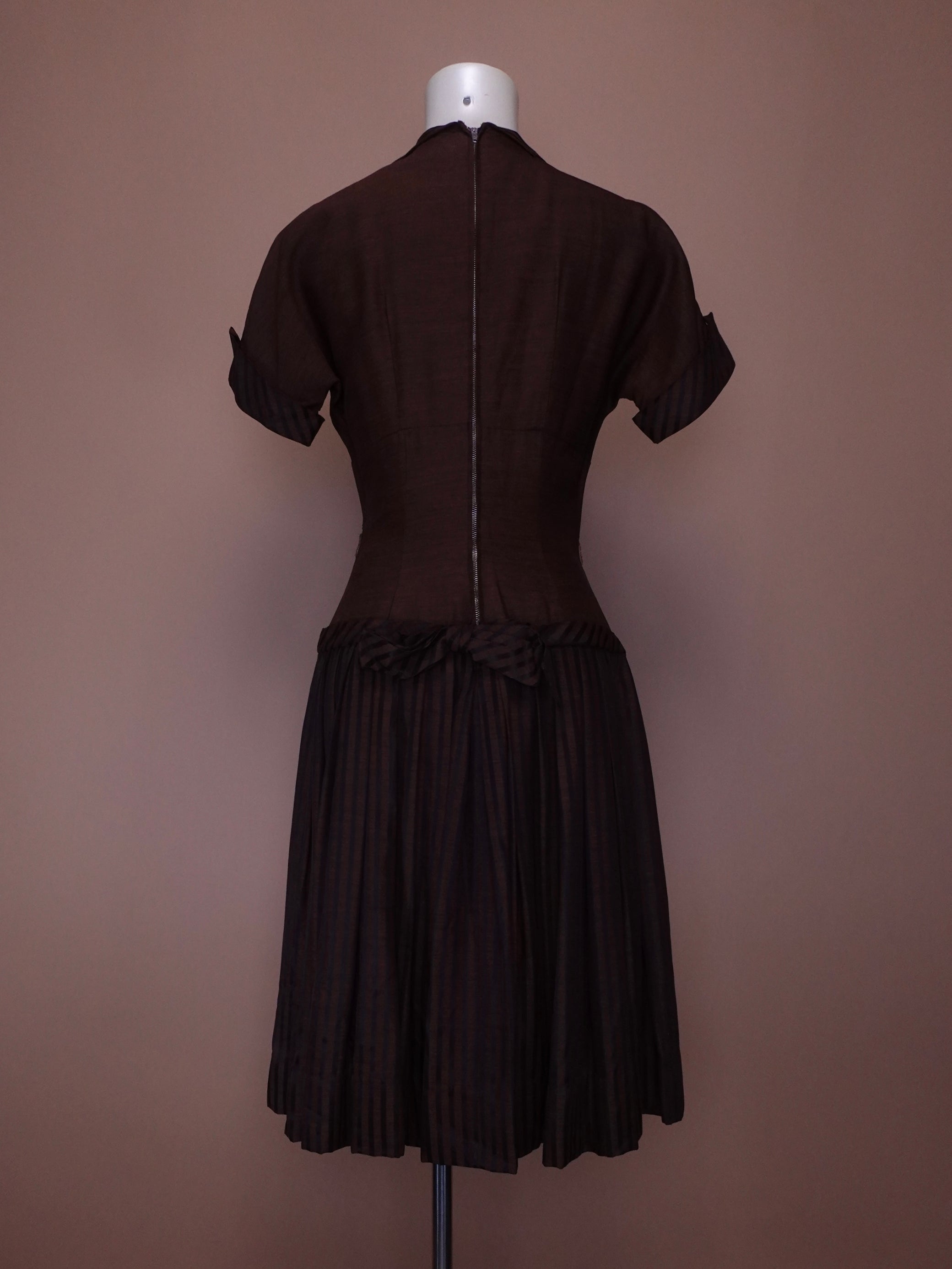 1950s - Brown and Black Stripe Dress with Bow Collar
