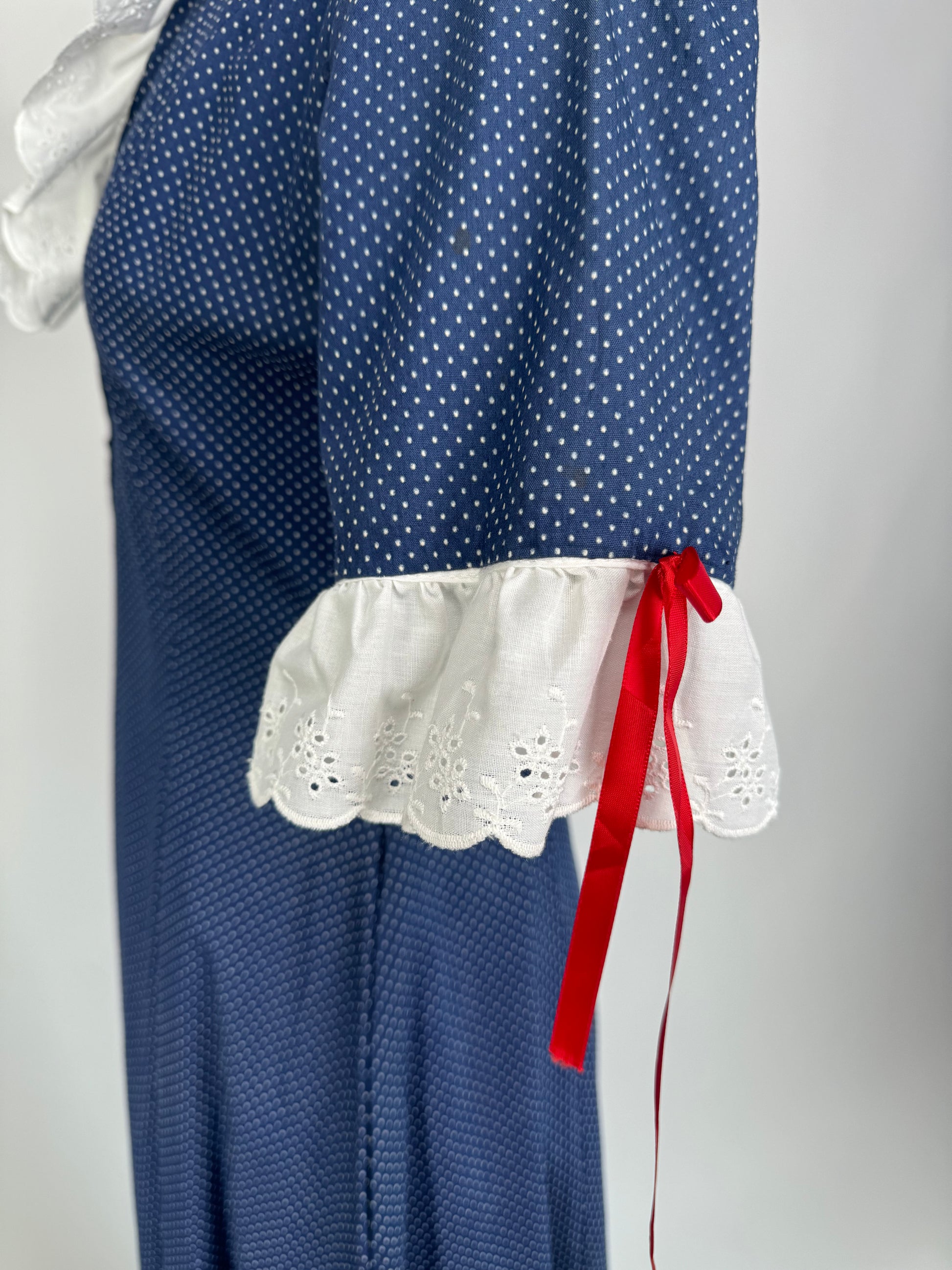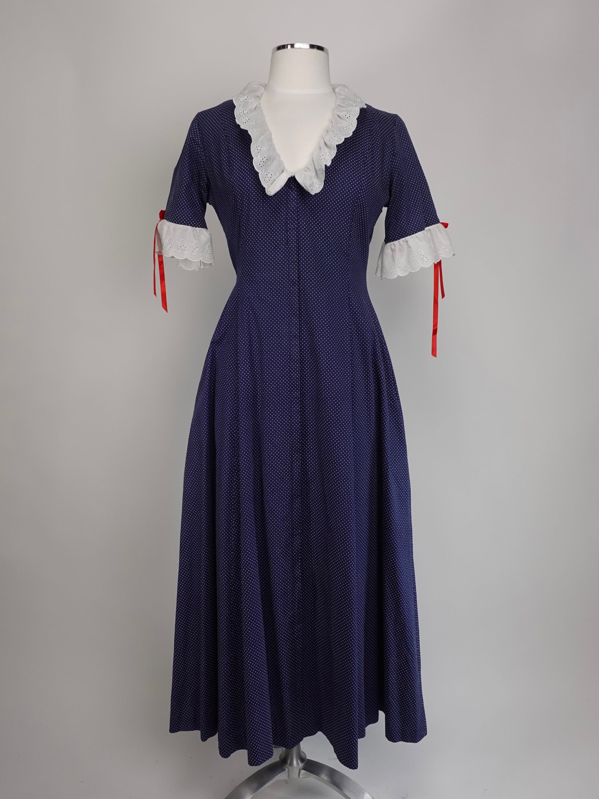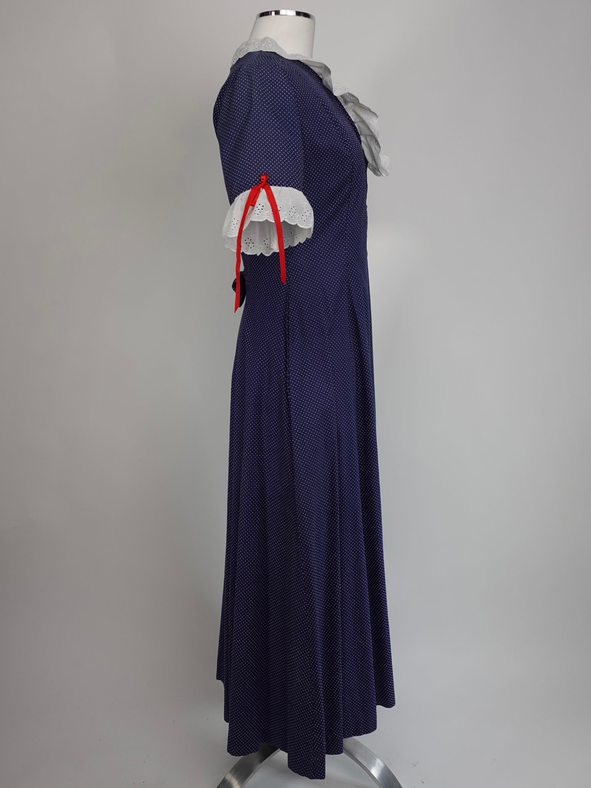 1940S - BLUE SWISS DOTS LACE TRIM MAXI DRESS