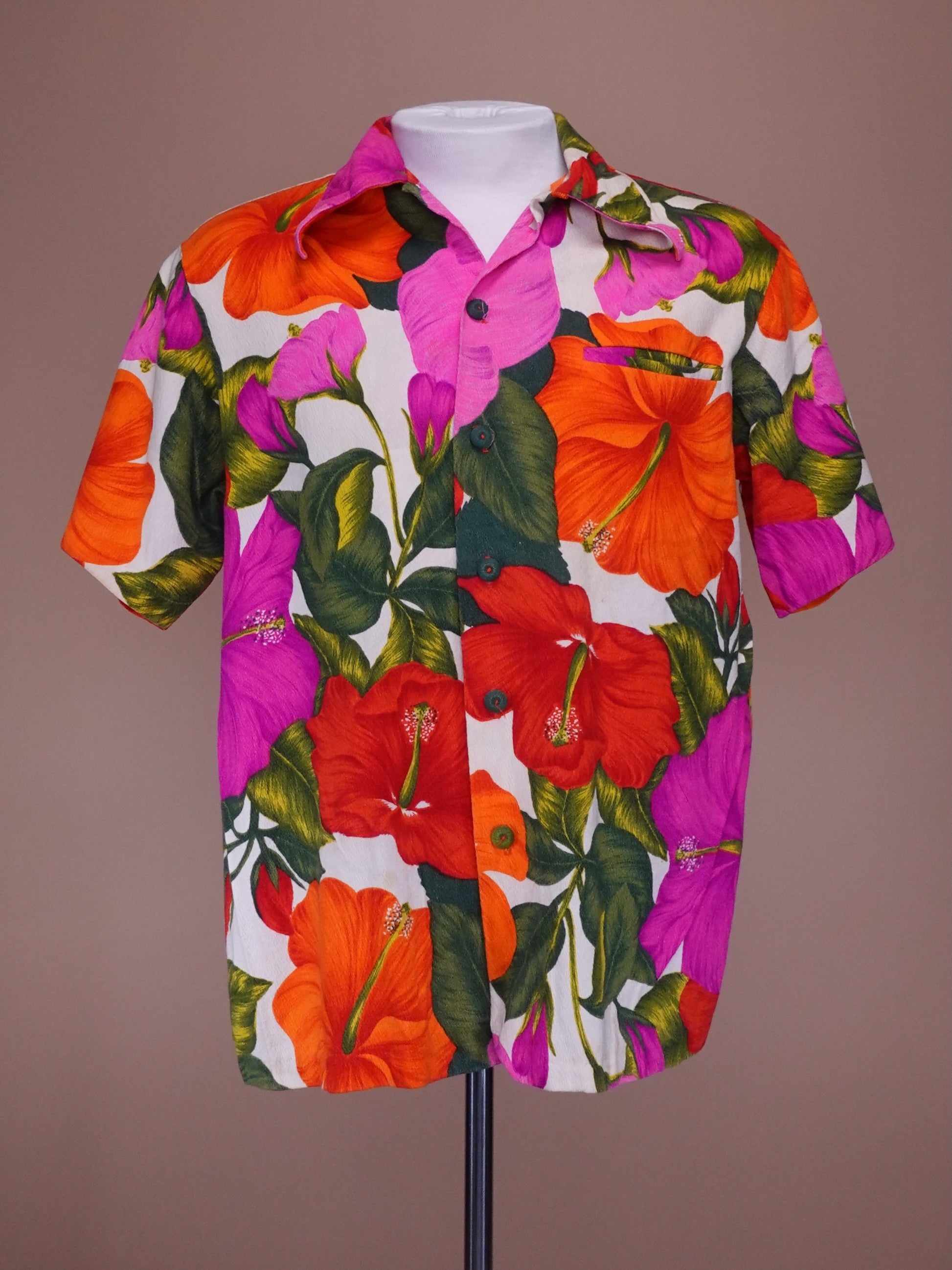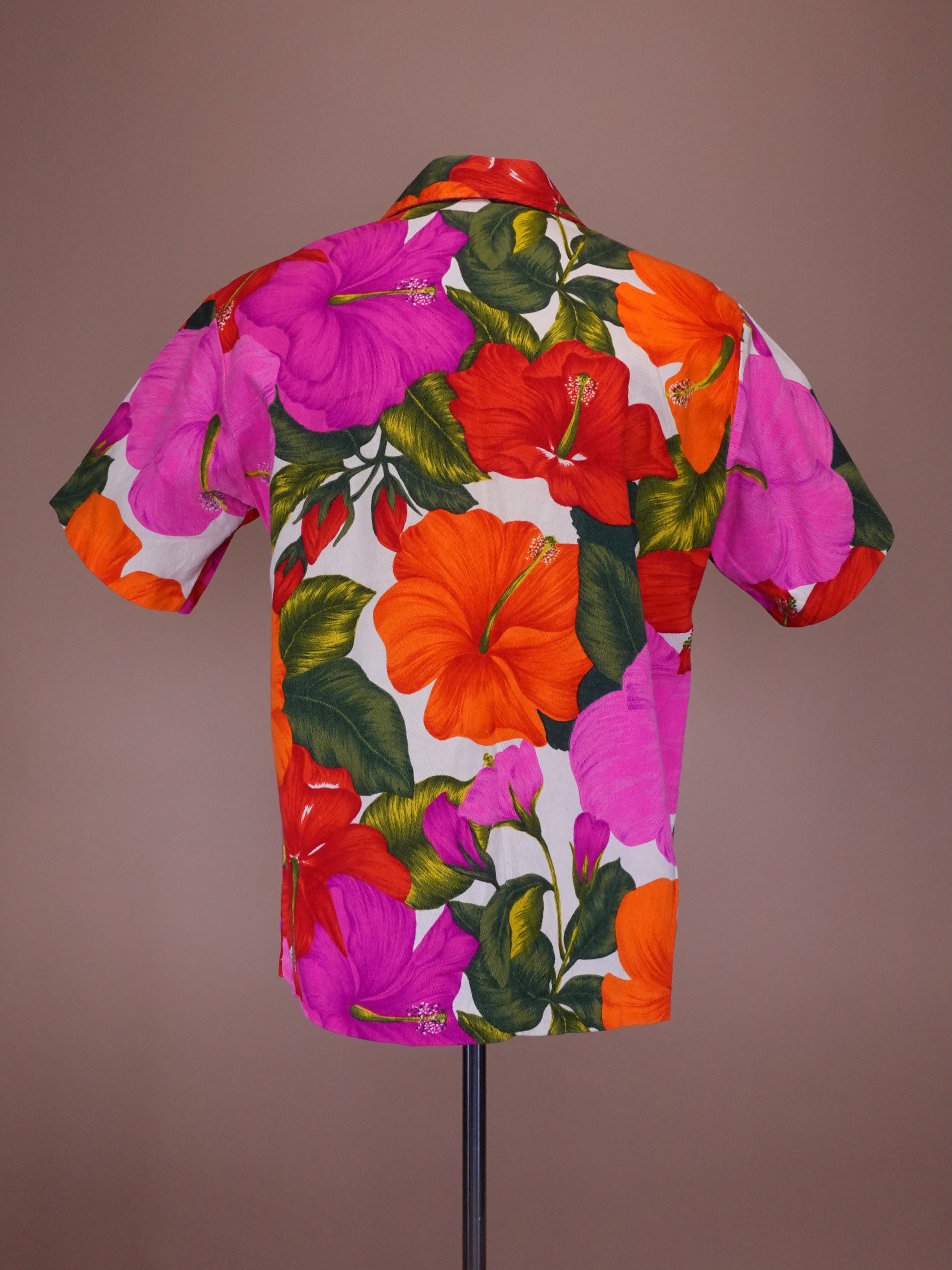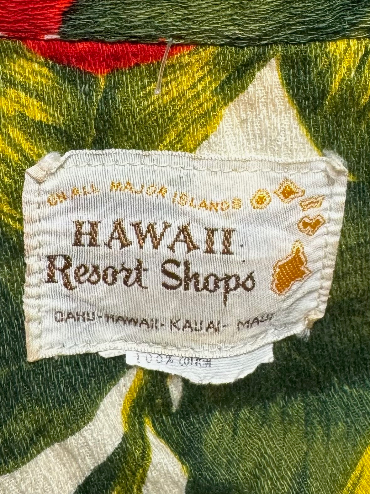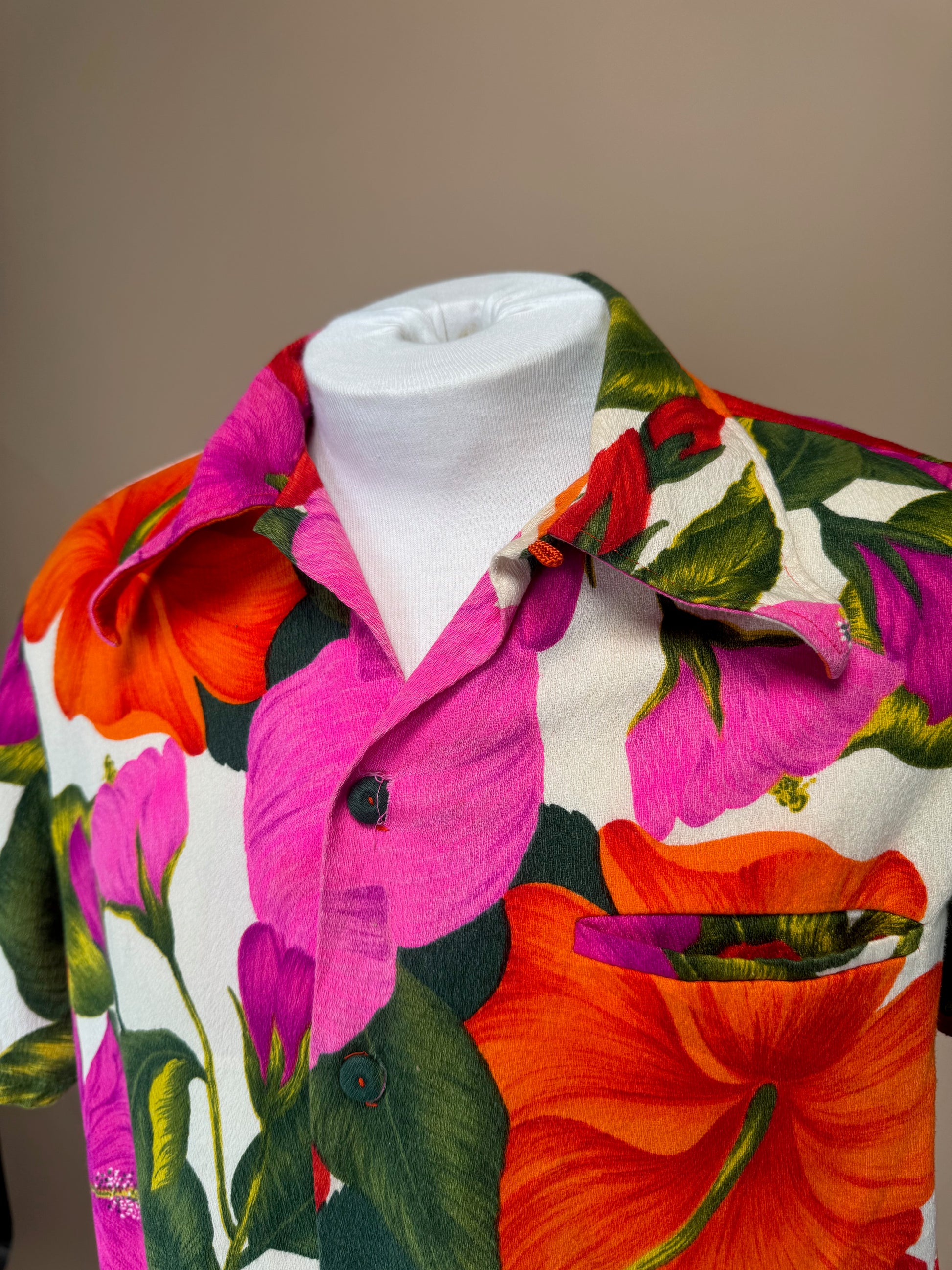 1960s - Hawaii Resort Shops Pink/Orange/Green Bar Cloth Hawaiian Shirt