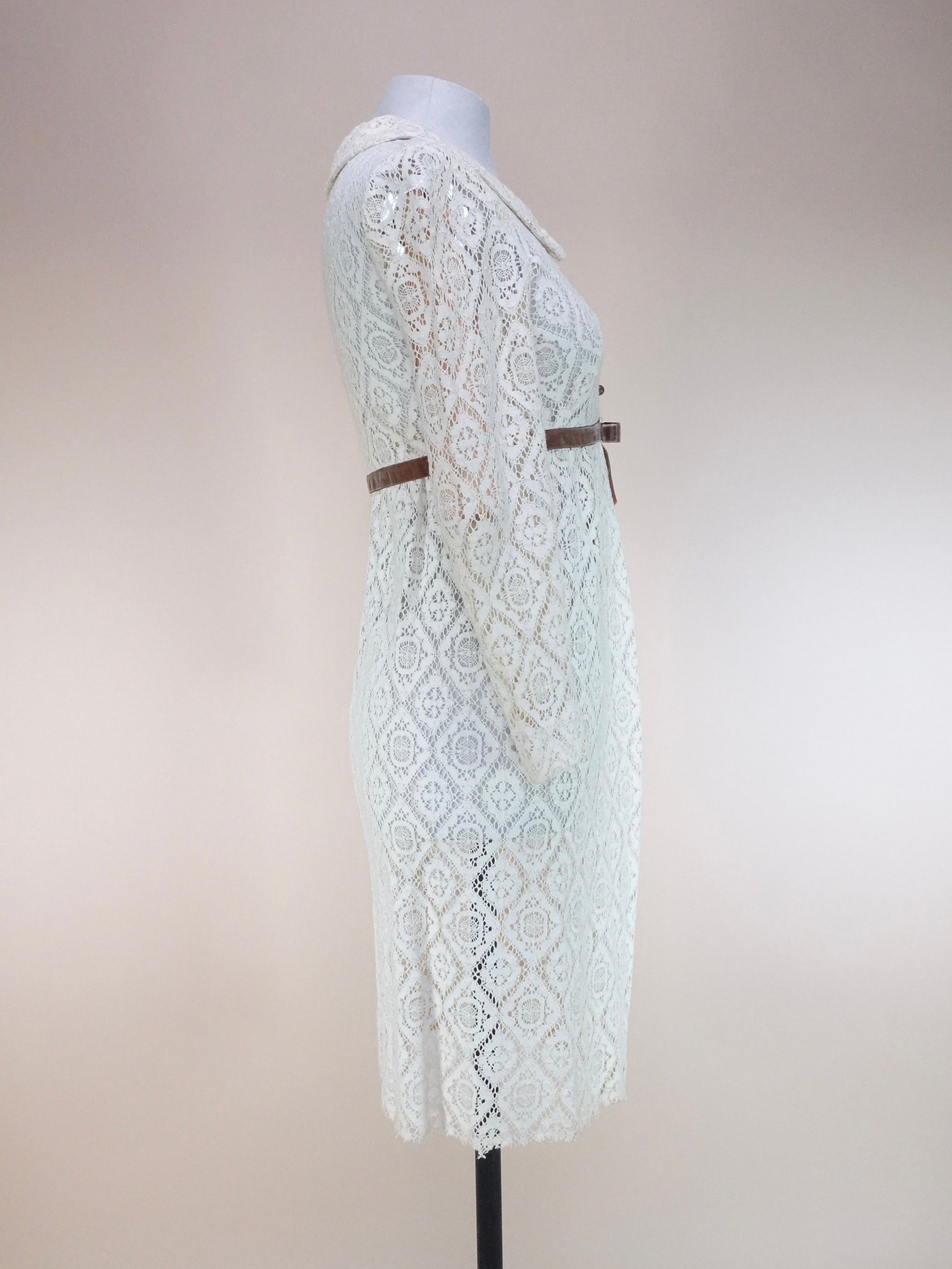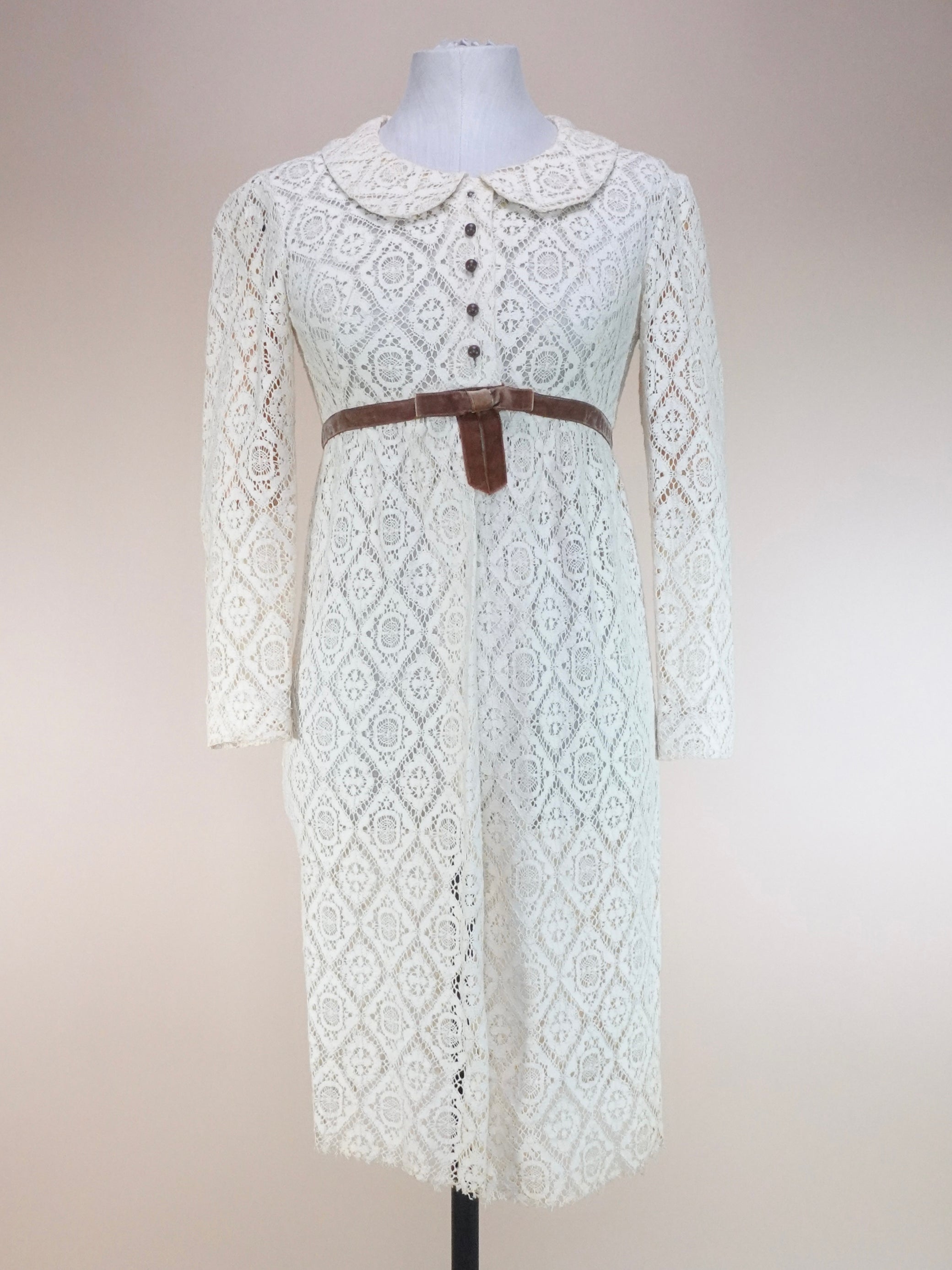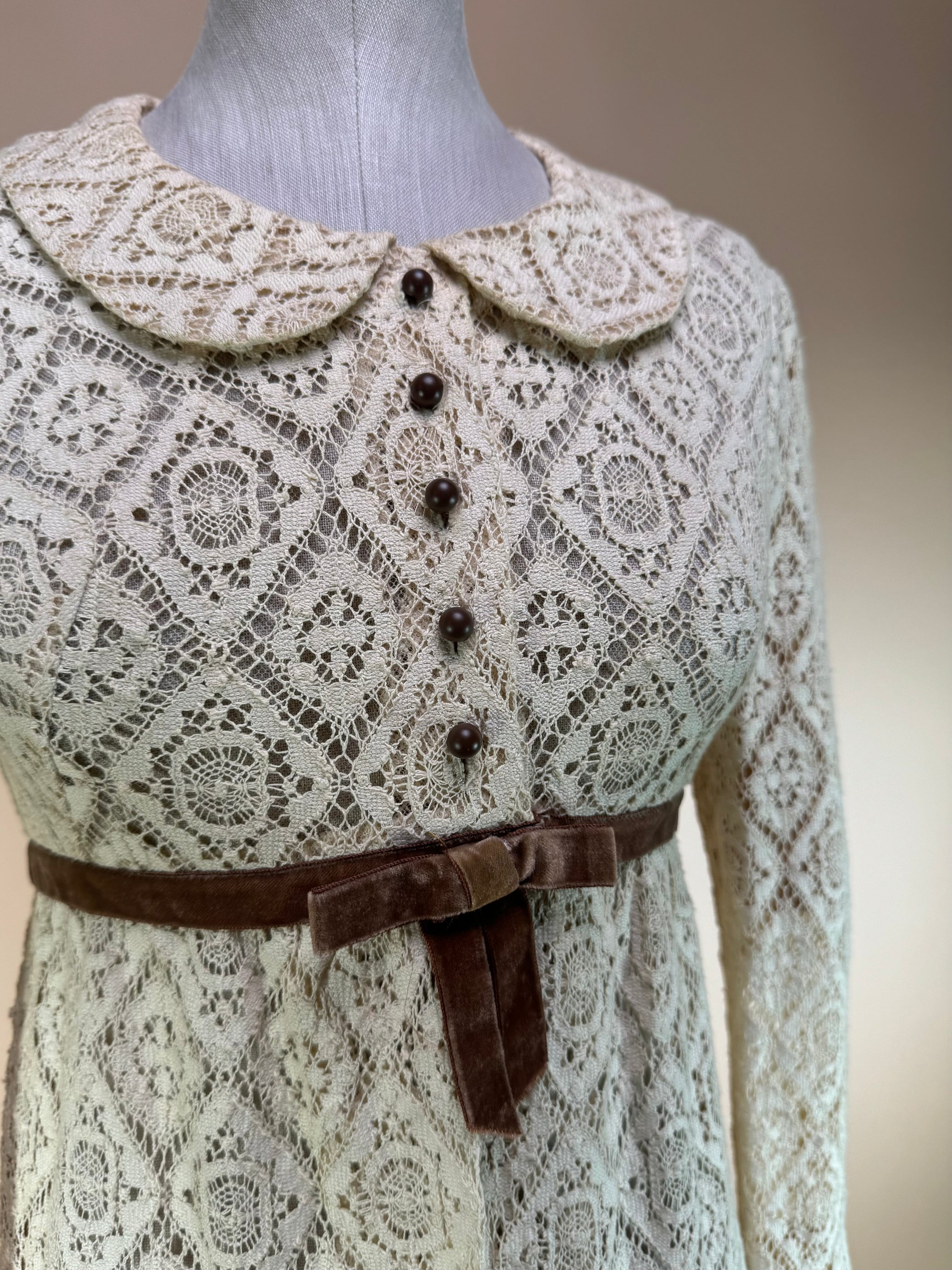 1960s - Made In London Open Front Lace Dress With Velvet Waist Ribbon Detailing