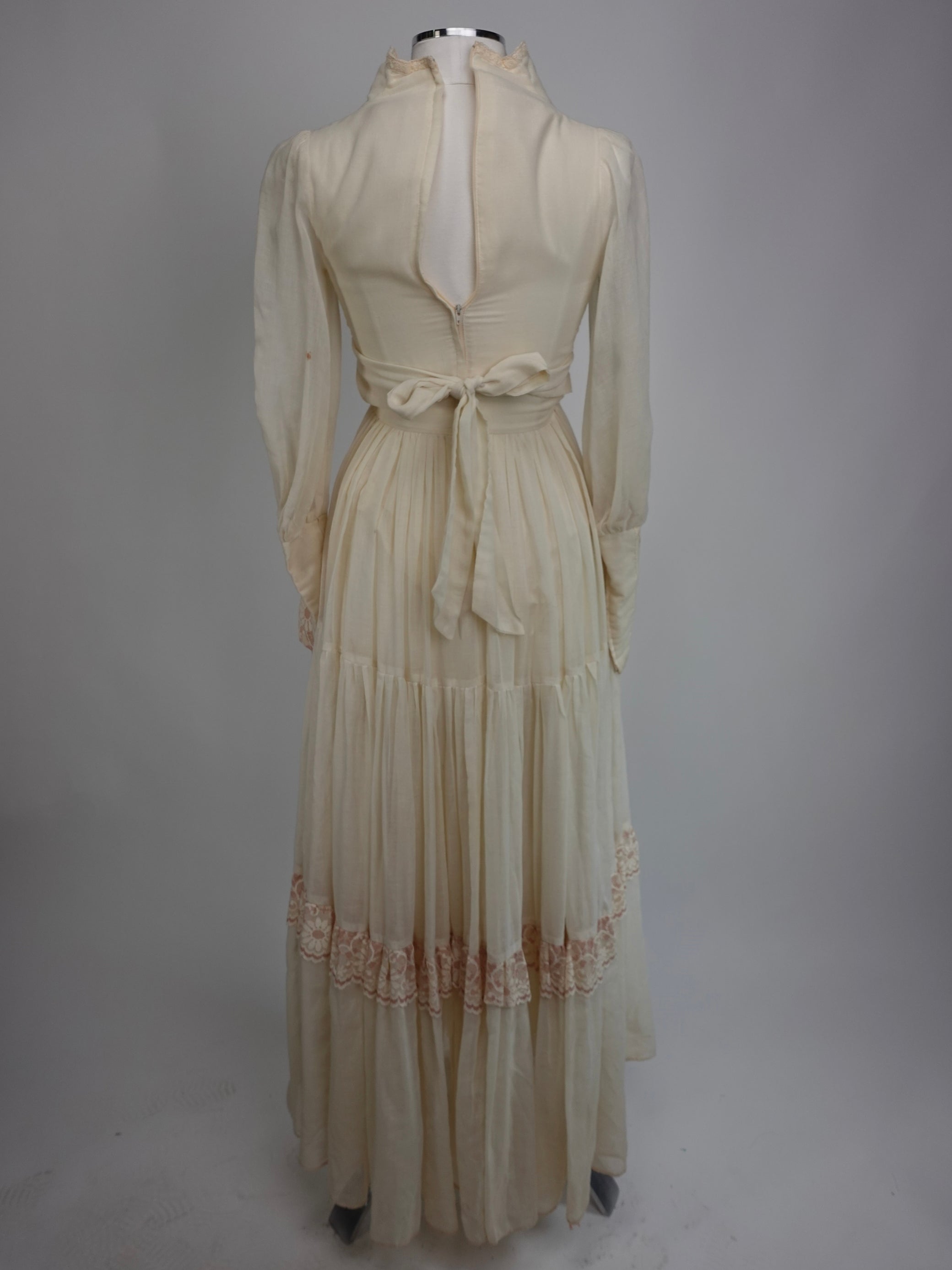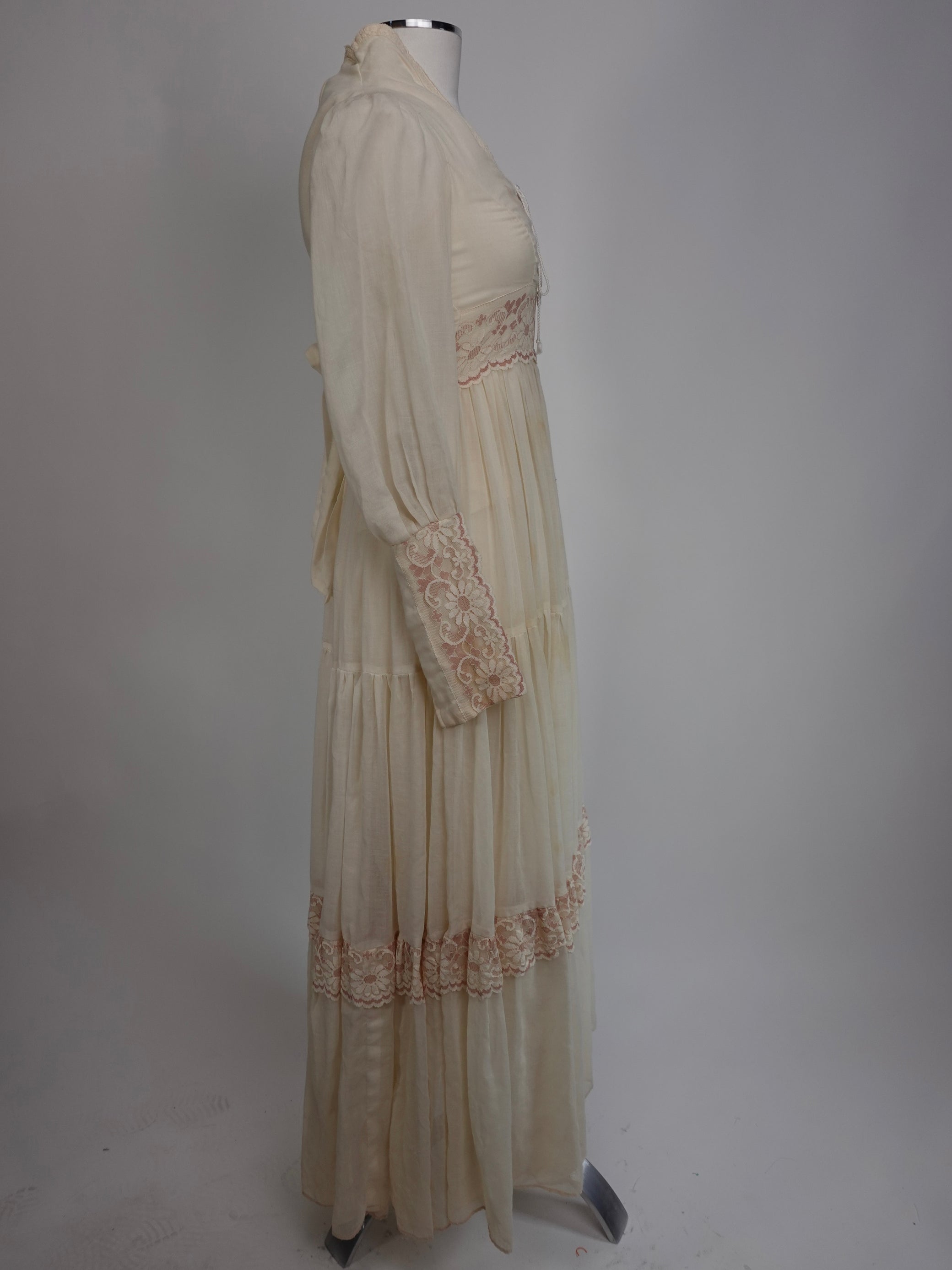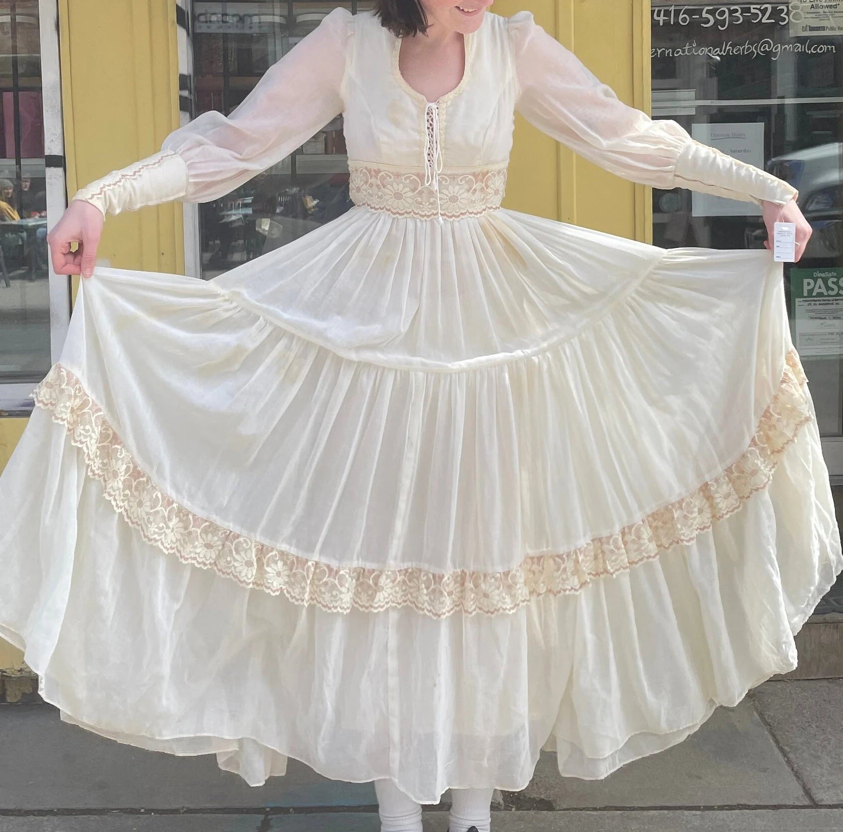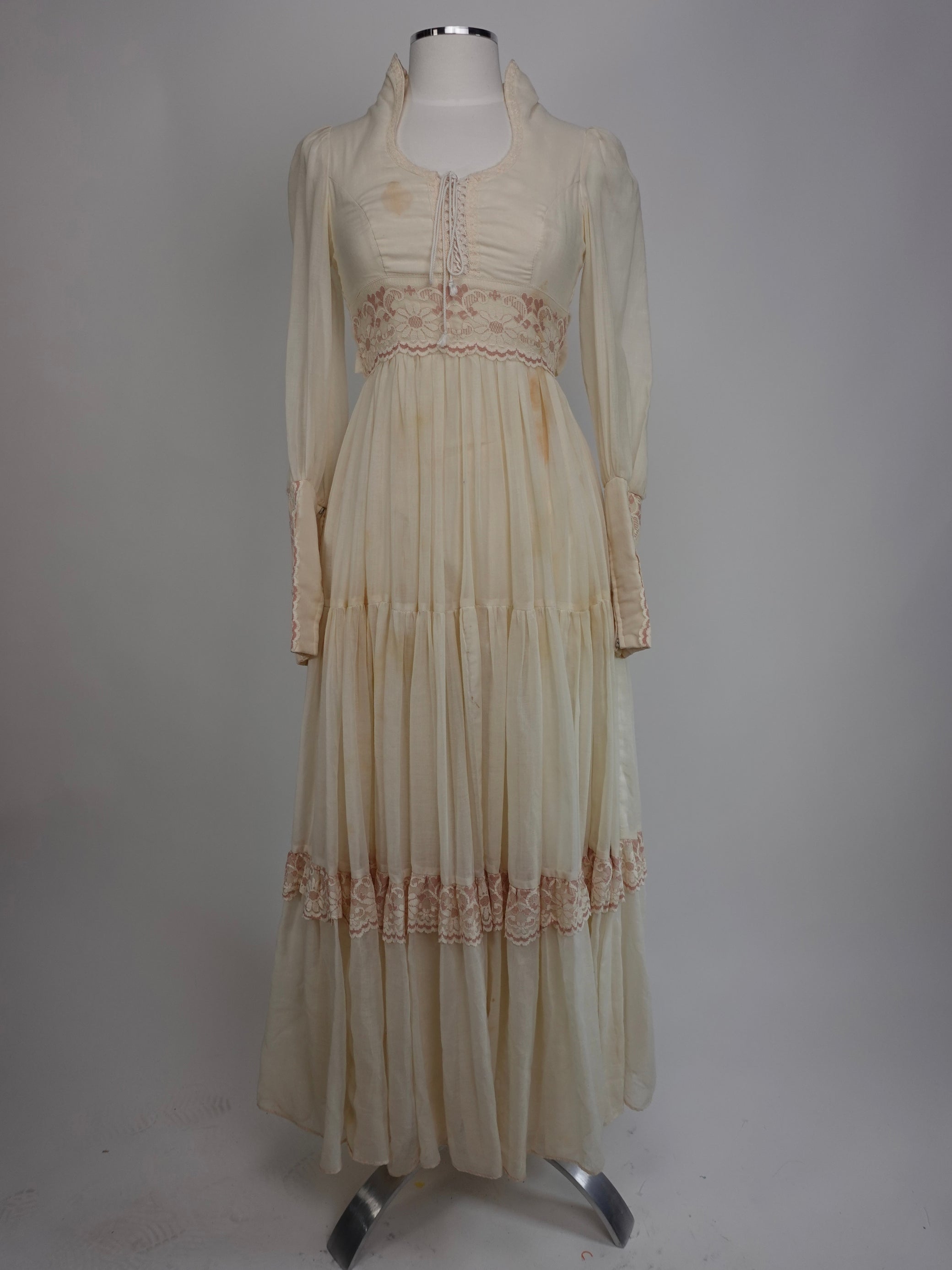 Vintage 70s Gunne Sax dress. Lace up bodice. Zipper closure up back with tie. Zipped cuff. Lace sash. There is a few stain as pictured in the last one.