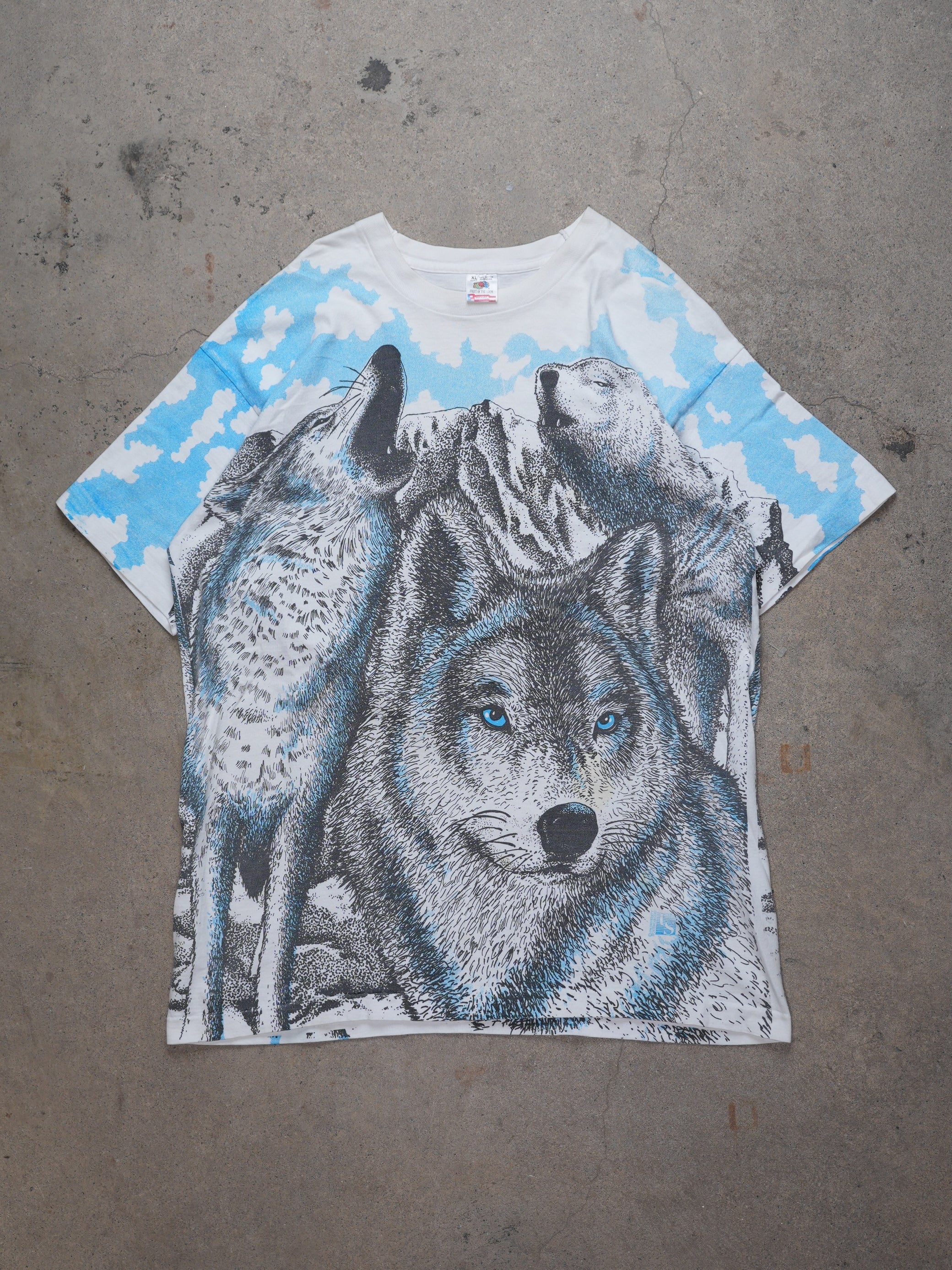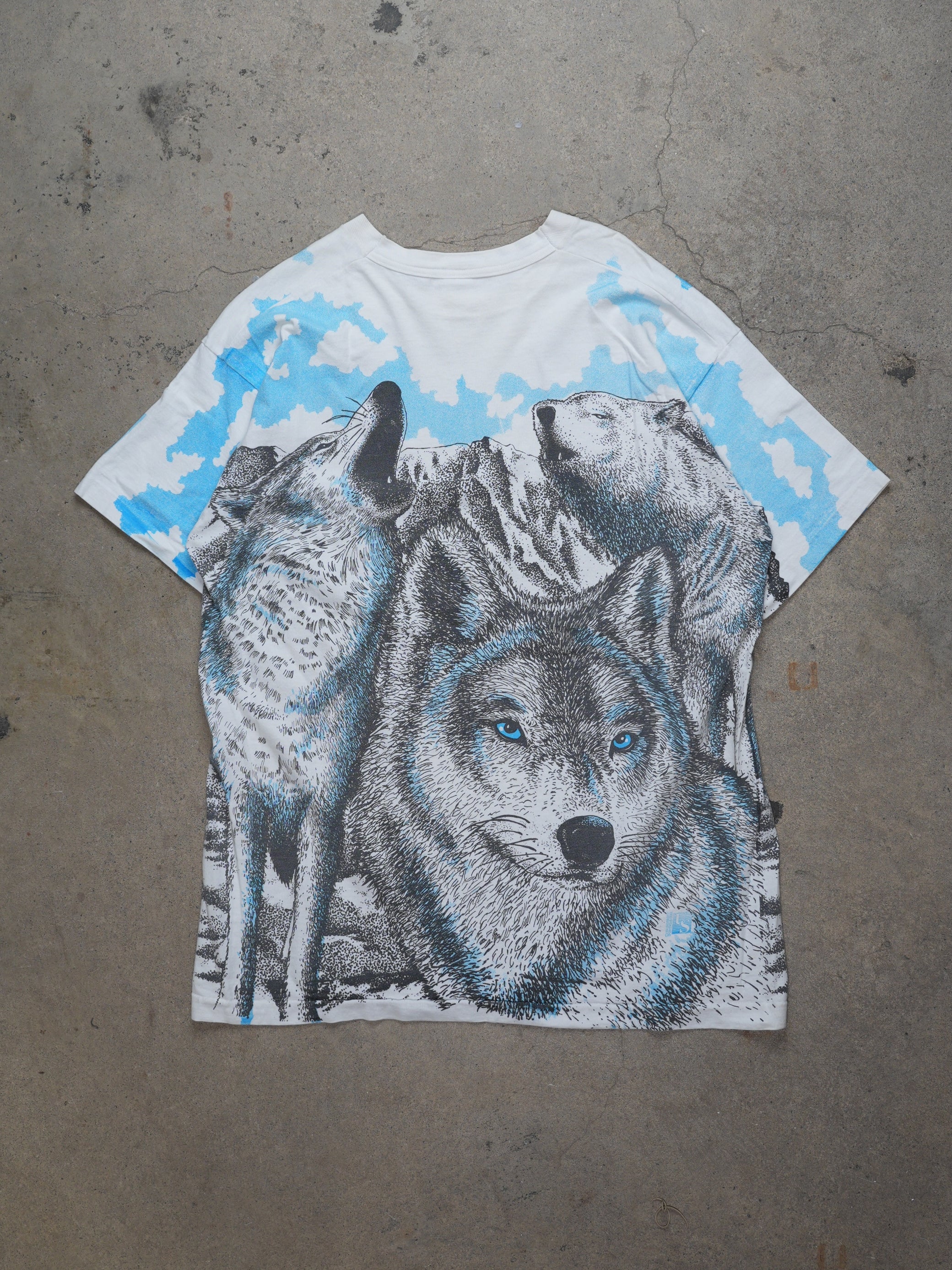 1990S - Wolf Graphic All Over Print T-Shirt, M, white and blue, unique and rare wolf graphic print all over, a must-have for vintage lovers and streetwear enthusiasts.