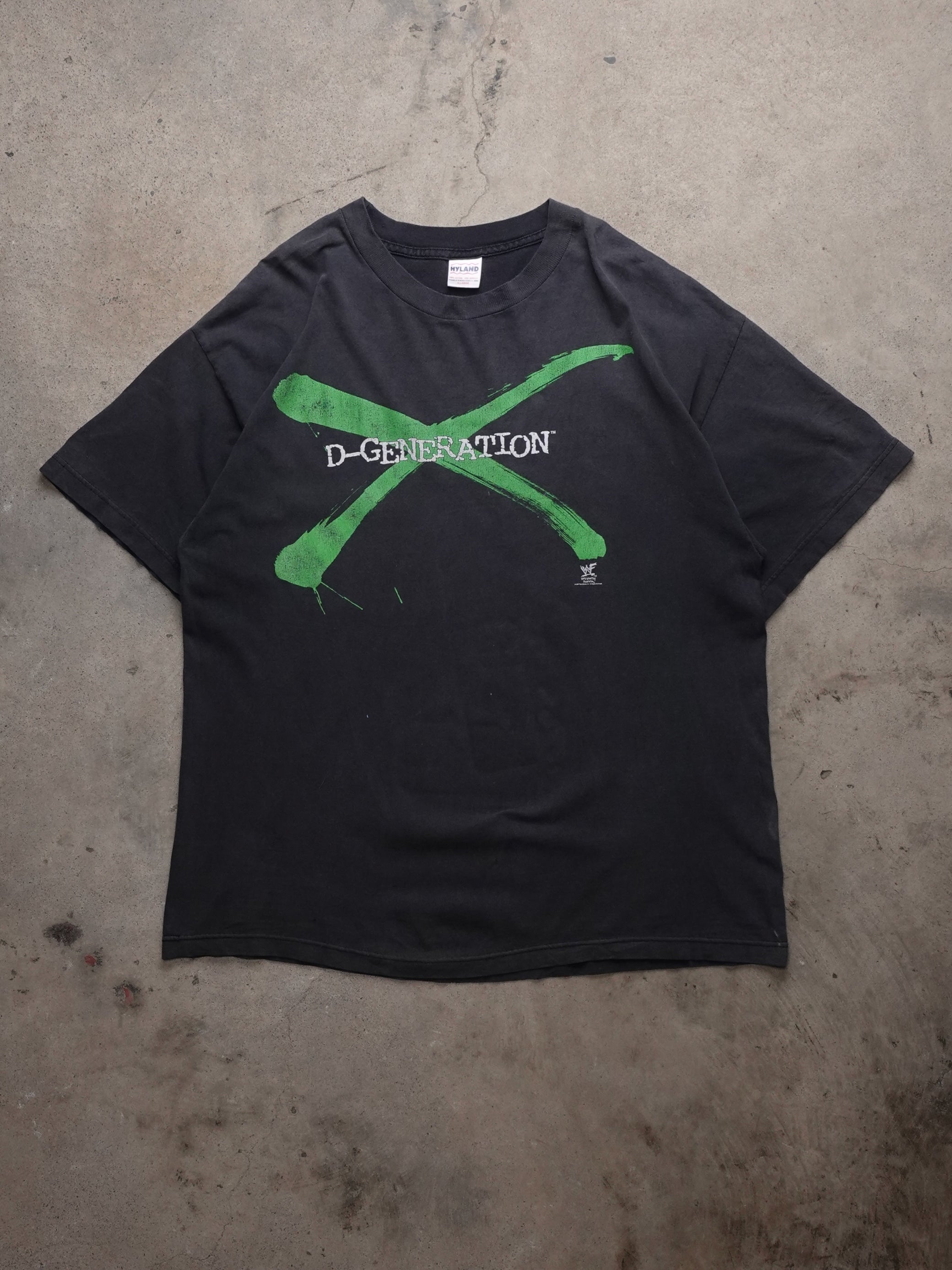 A classic vintage WWF D-Generation X t-shirt, perfect for wrestling fans and collectors. - Era & Style: Iconic 1990s wrestling memorabilia with a bold graphic design. - Brand & Material: Made by Hyland, crafted from 100% cotton for comfort and durability. - Fit & Features: Regular fit with a striking front and back graphic print. - Ideal Use Cases: Great for casual wear or as a statement piece in a vintage collection.