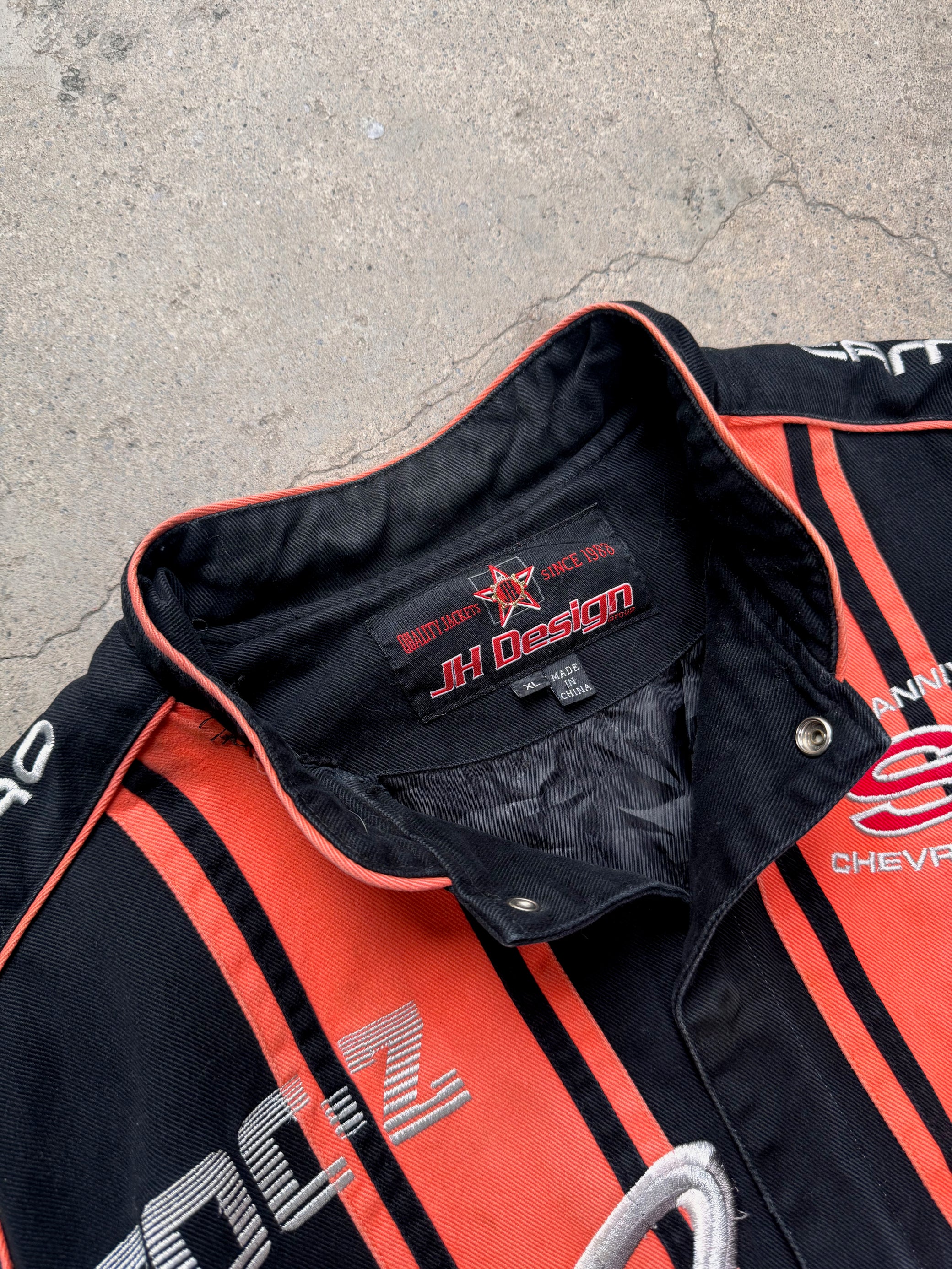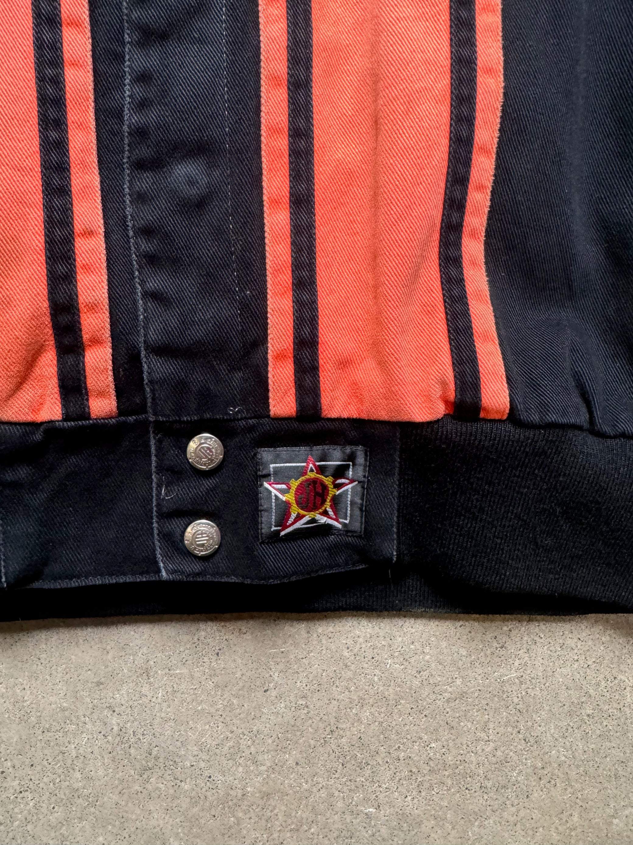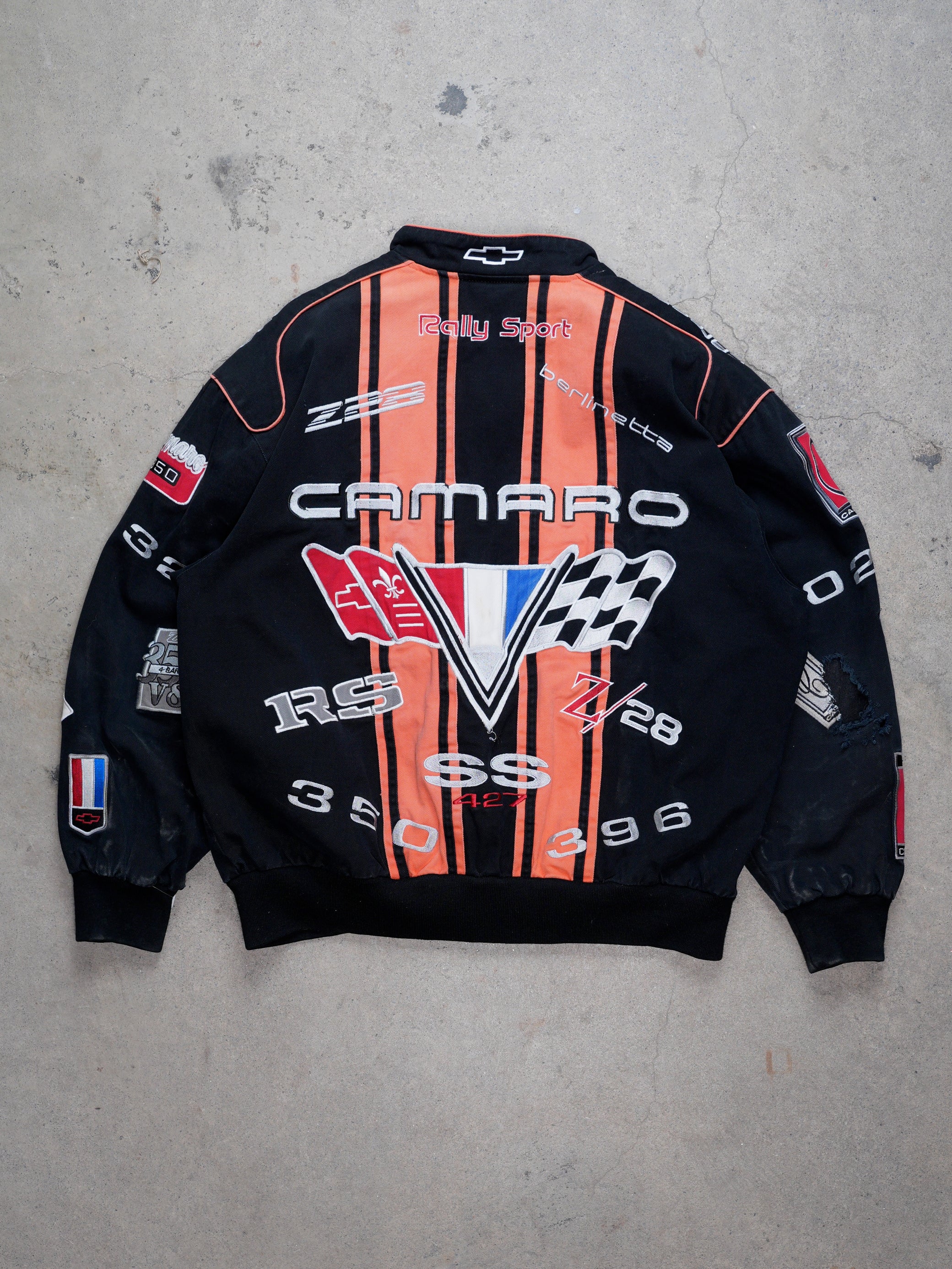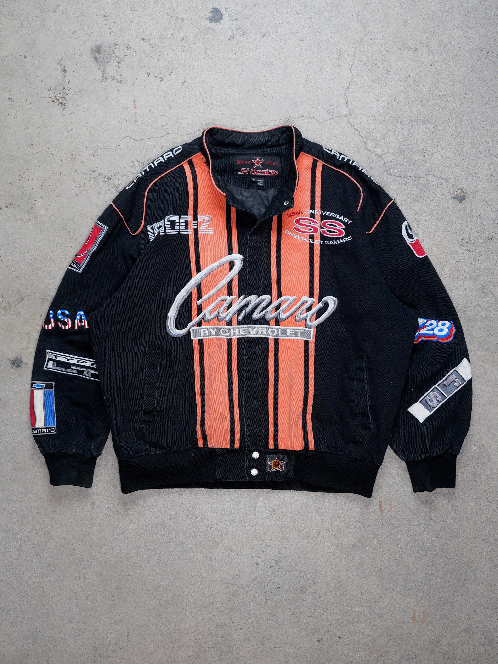 This rare JH DESIGNS Camaro Racing Jacket is a must-have for any collector. Its sleek black design with vibrant orange stripes will make a statement. Perfect for casual or sporty looks, this XL jacket is made of synthetic material and features a bold logo on the front.