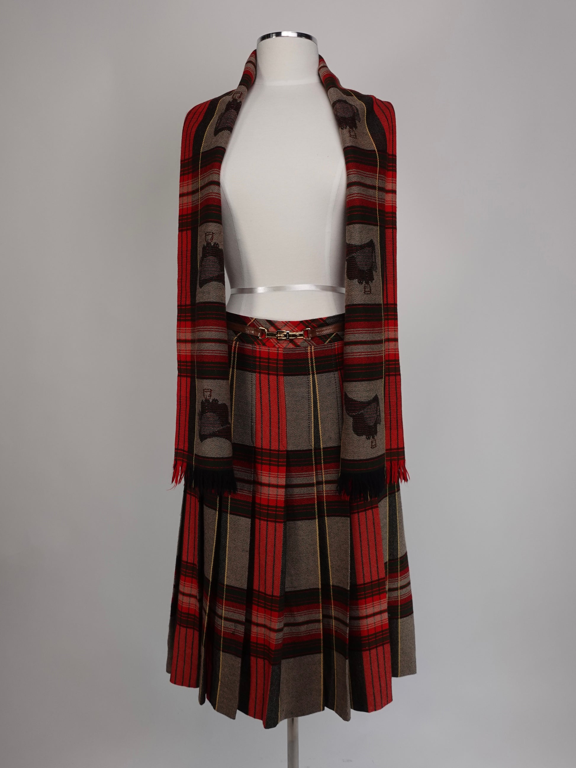 PLEATED WITH EMBELLISHED WAIST BAND WITH ICONIC GOLD CELINE STAMPED BELT BUCKEL MATCHING SCARF FEATURES SADLE WITH STIRRUPS SKIRT MEASUREMENTS WAIST: 29" HIP: 33.5" LENGTH: 30"