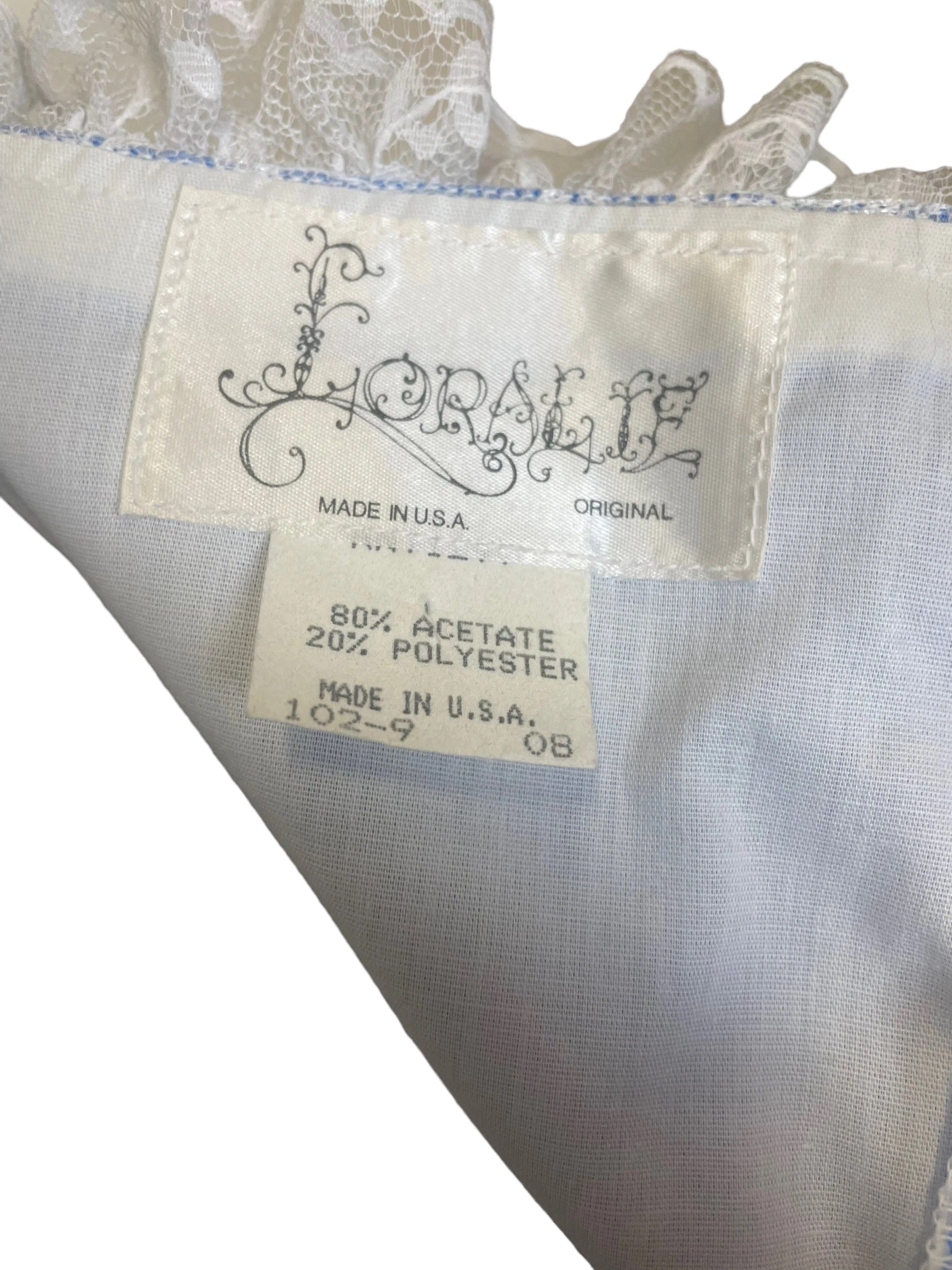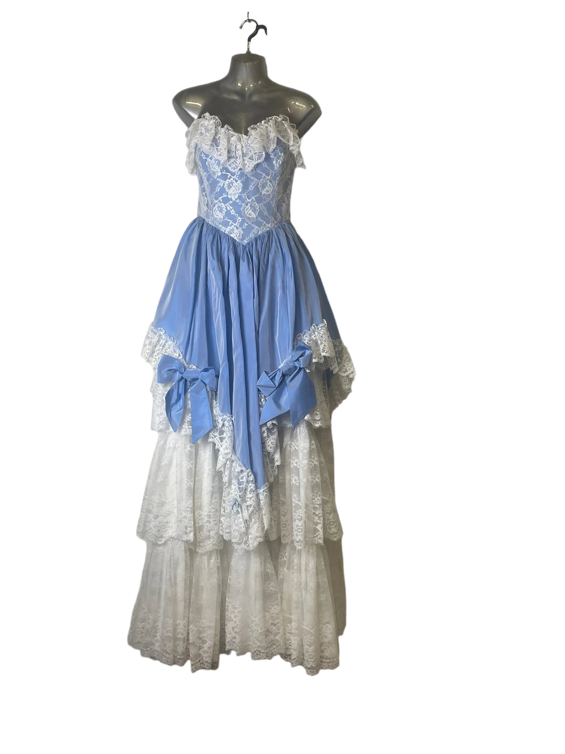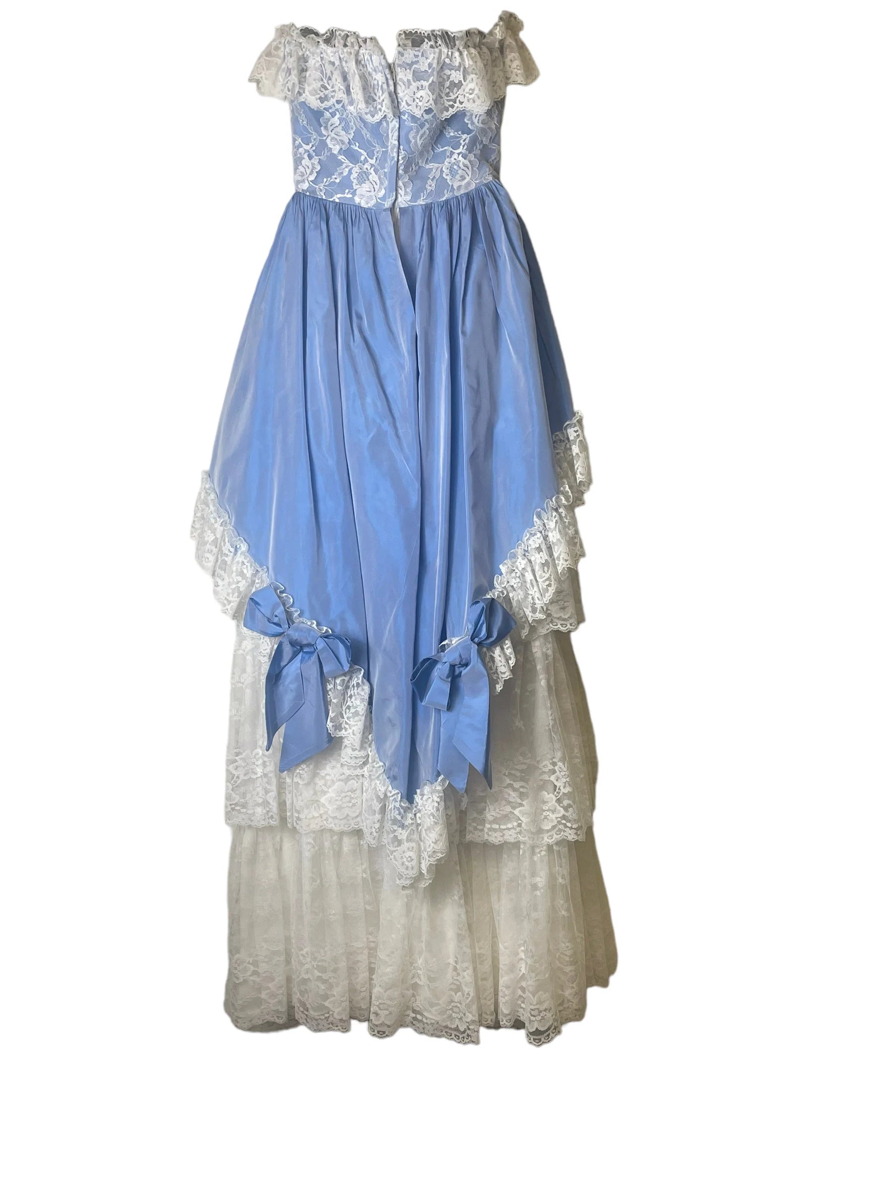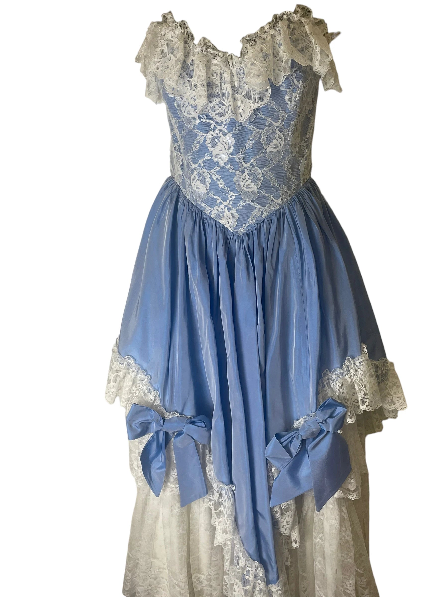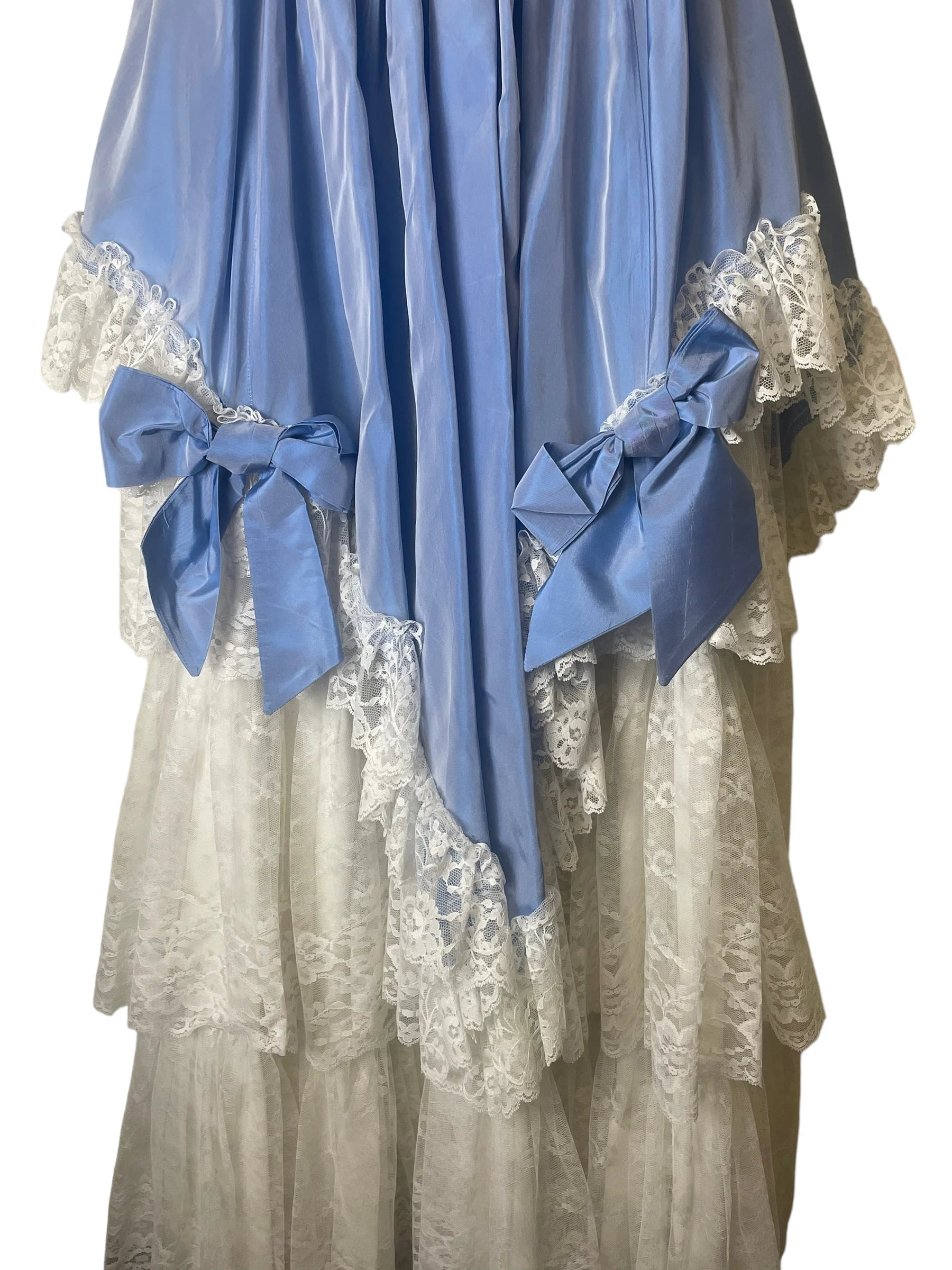 Prom dress from 1970s in blue taffeta and white lace. Big bows on skirt with pointed detail apron style. Cinderella costume! In very good condition with some minor flaws pictured.