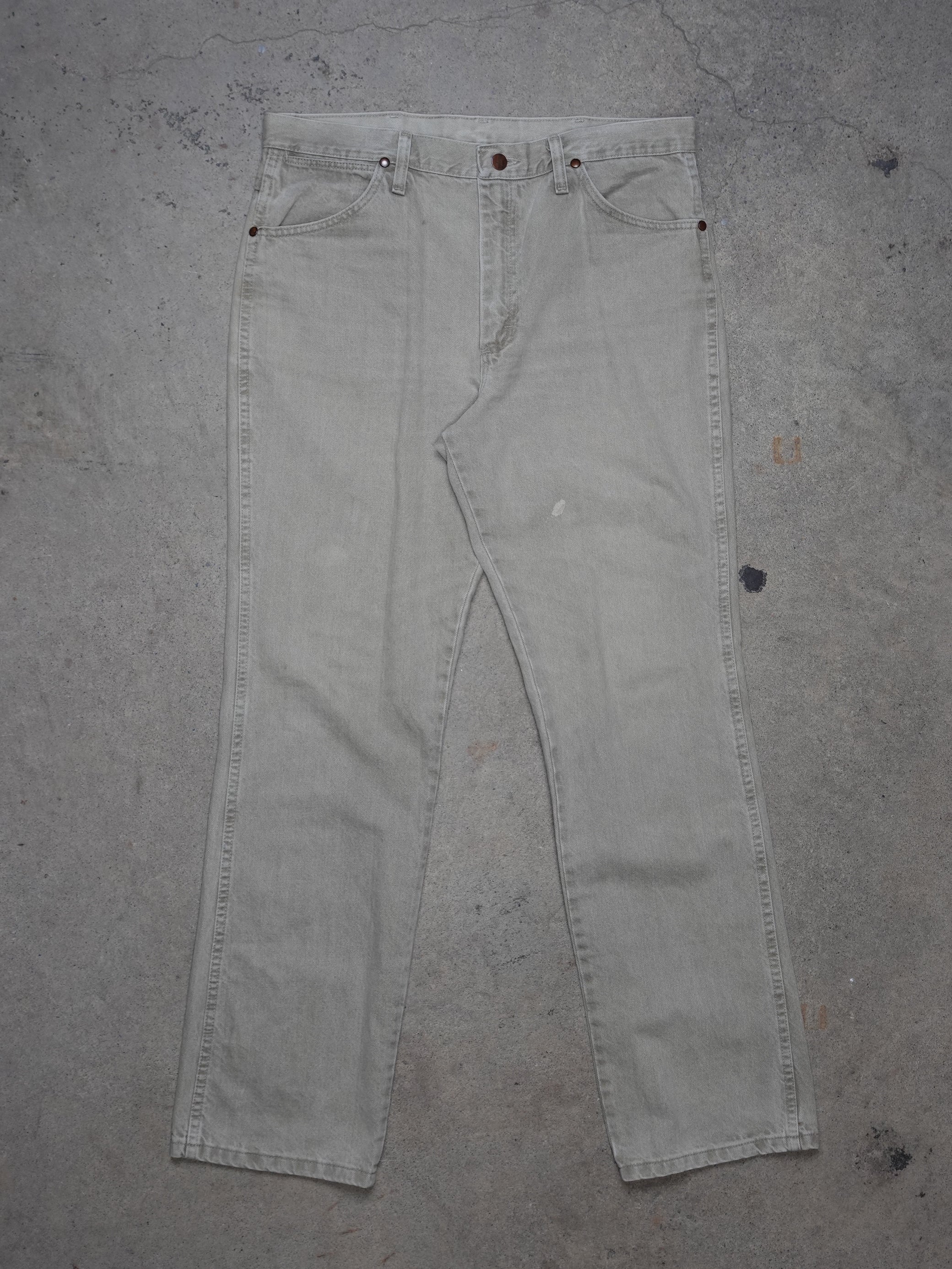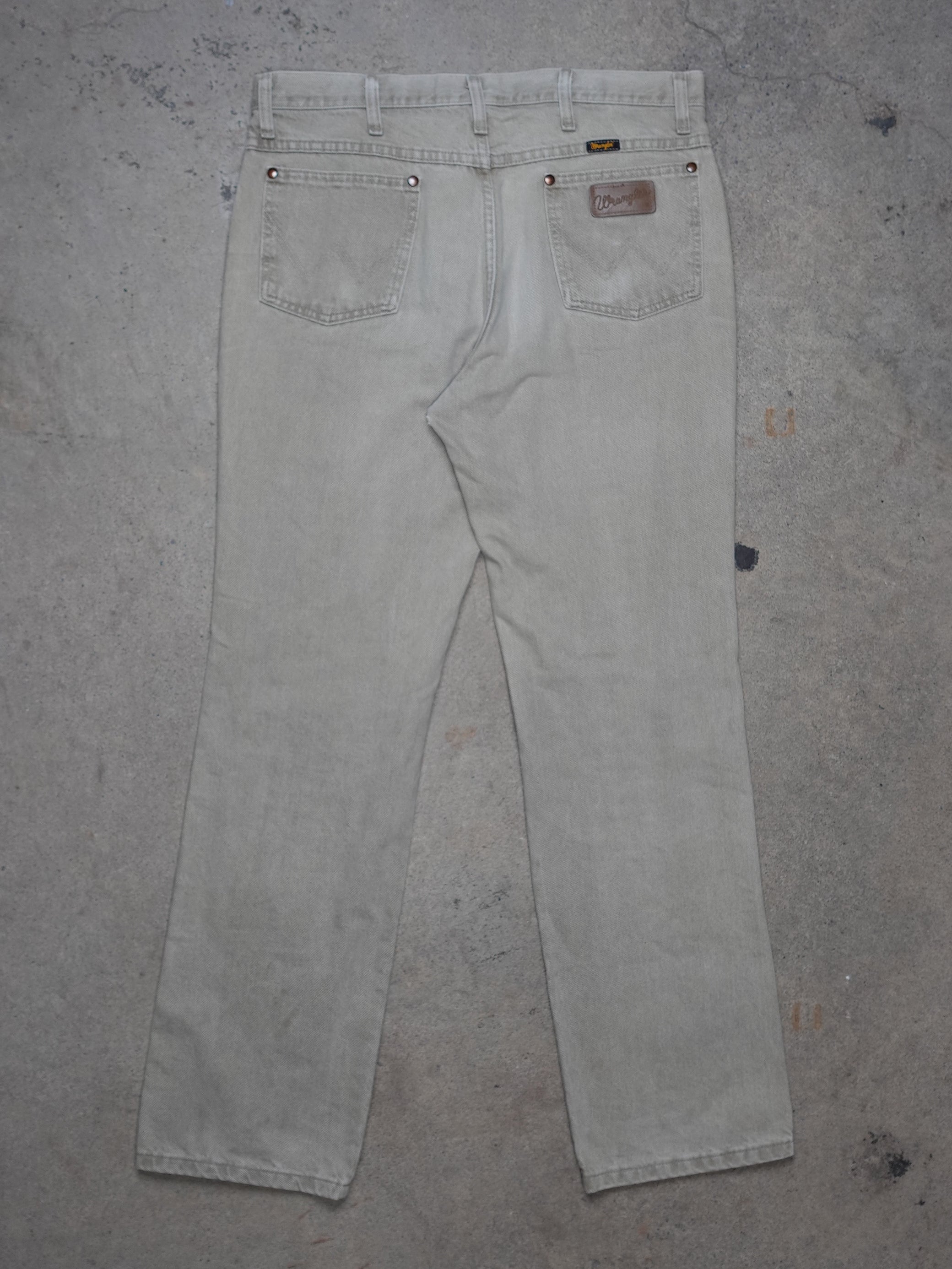 Unique faded denim jeans in light gray color, medium size. Made of soft suede material for a casual, one of a kind look. No branding or specific era.