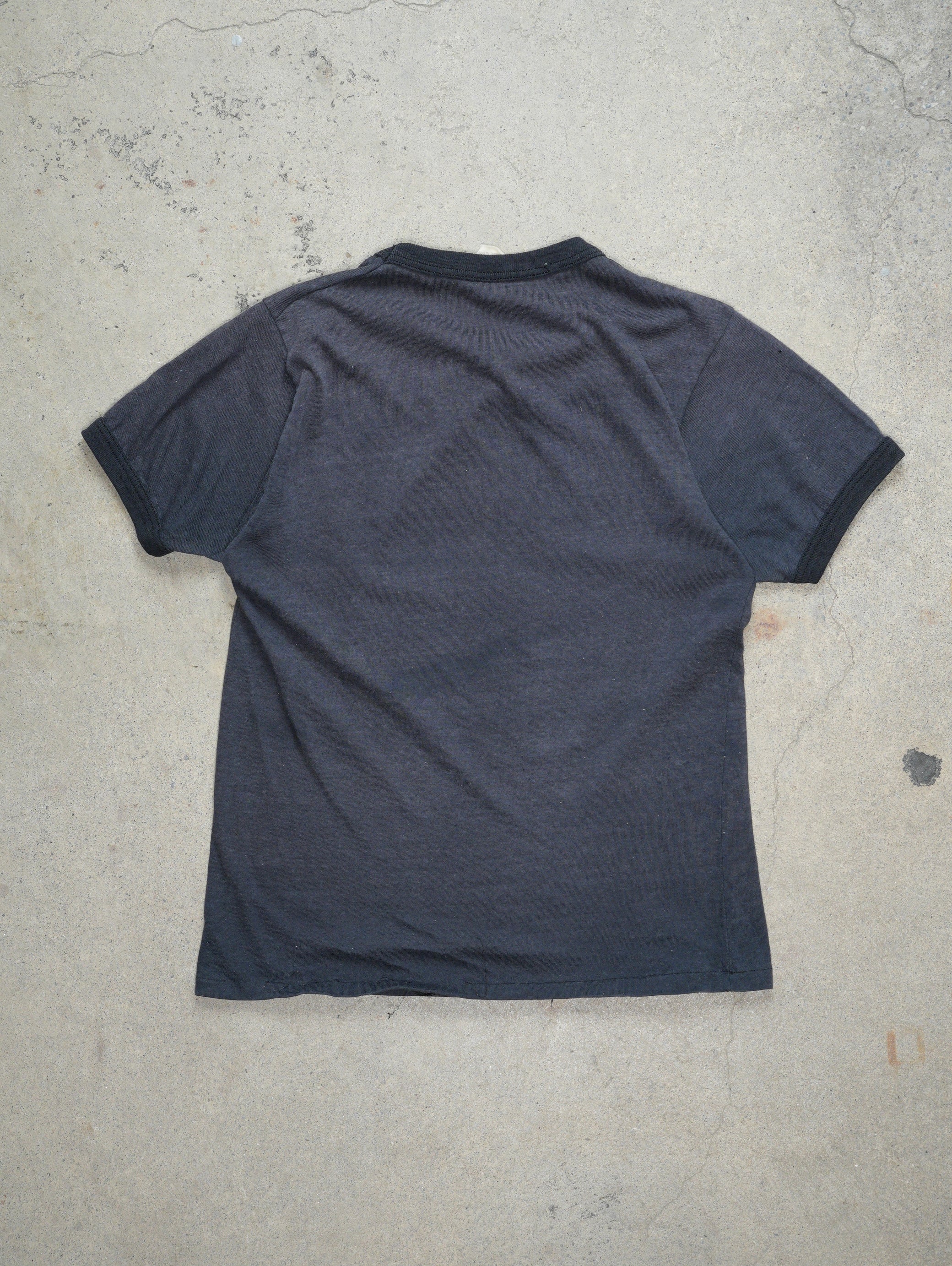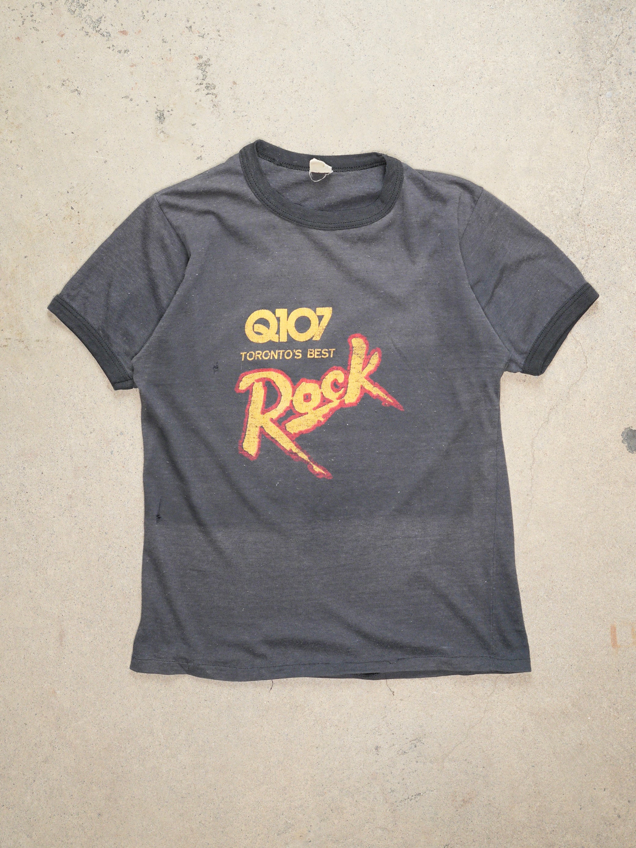 Vintage A WEAR Q107 Toronto's Best Rock T-Shirt from the 70s in charcoal color. Made of soft cotton with a crew neckline, short sleeves, and casual fit. Perfect for any rock fan.