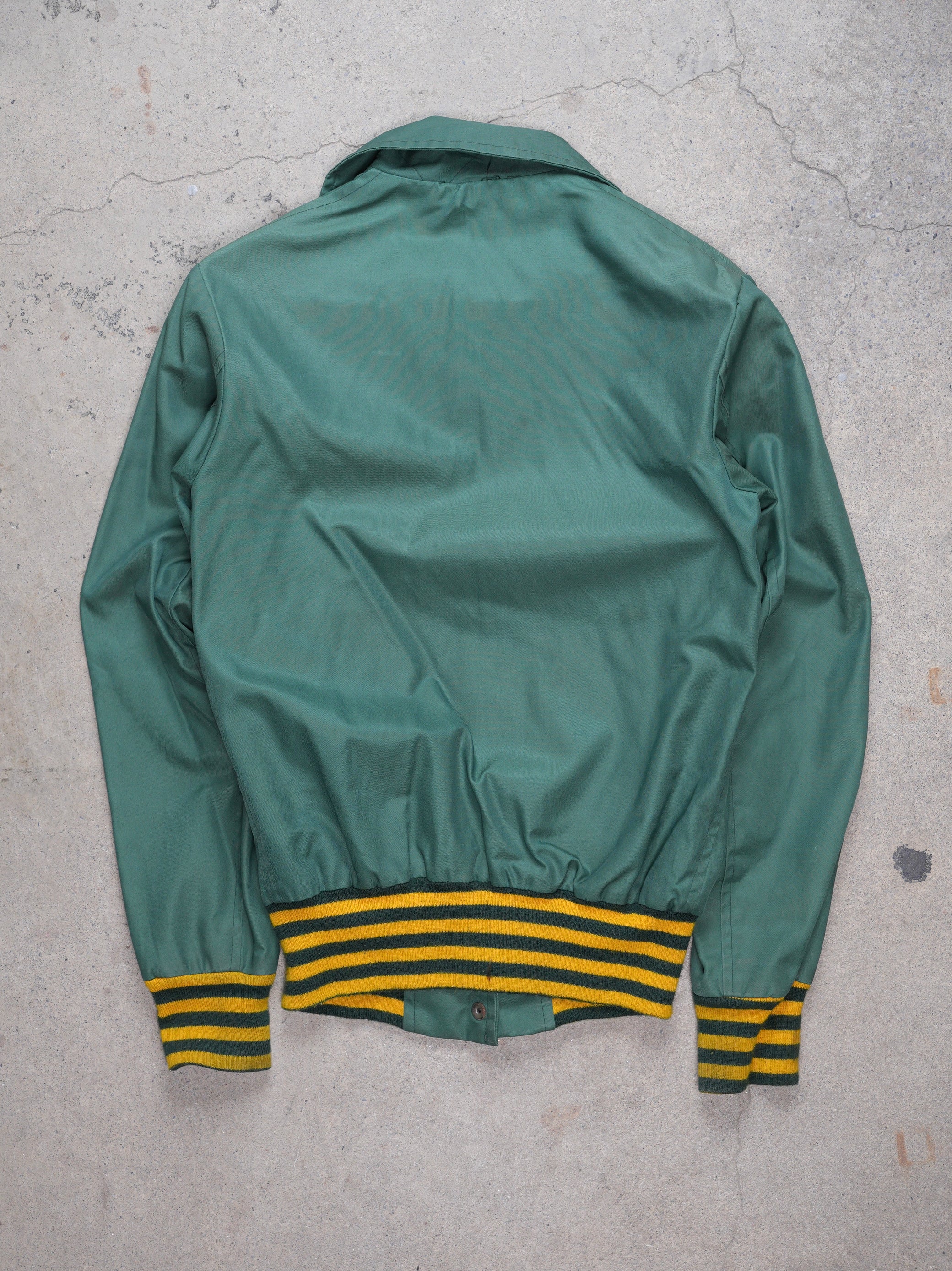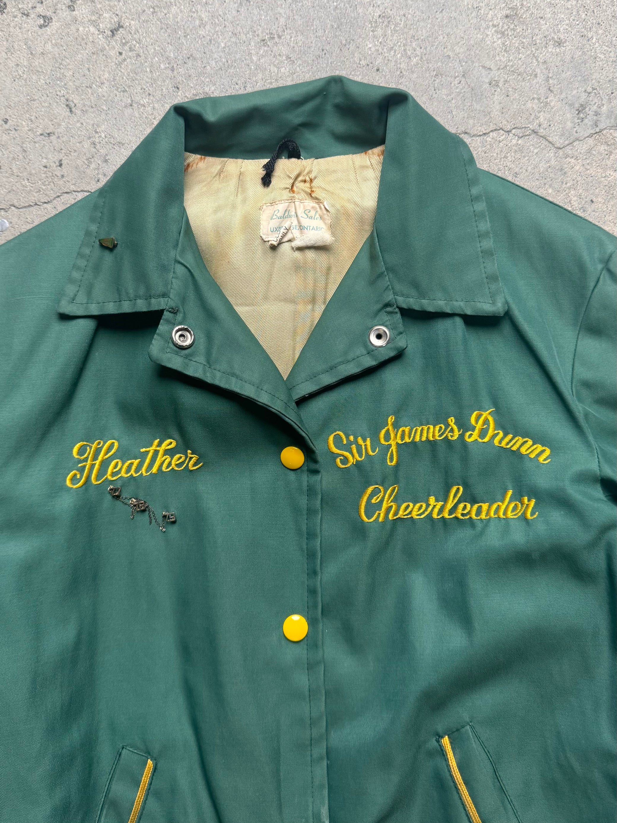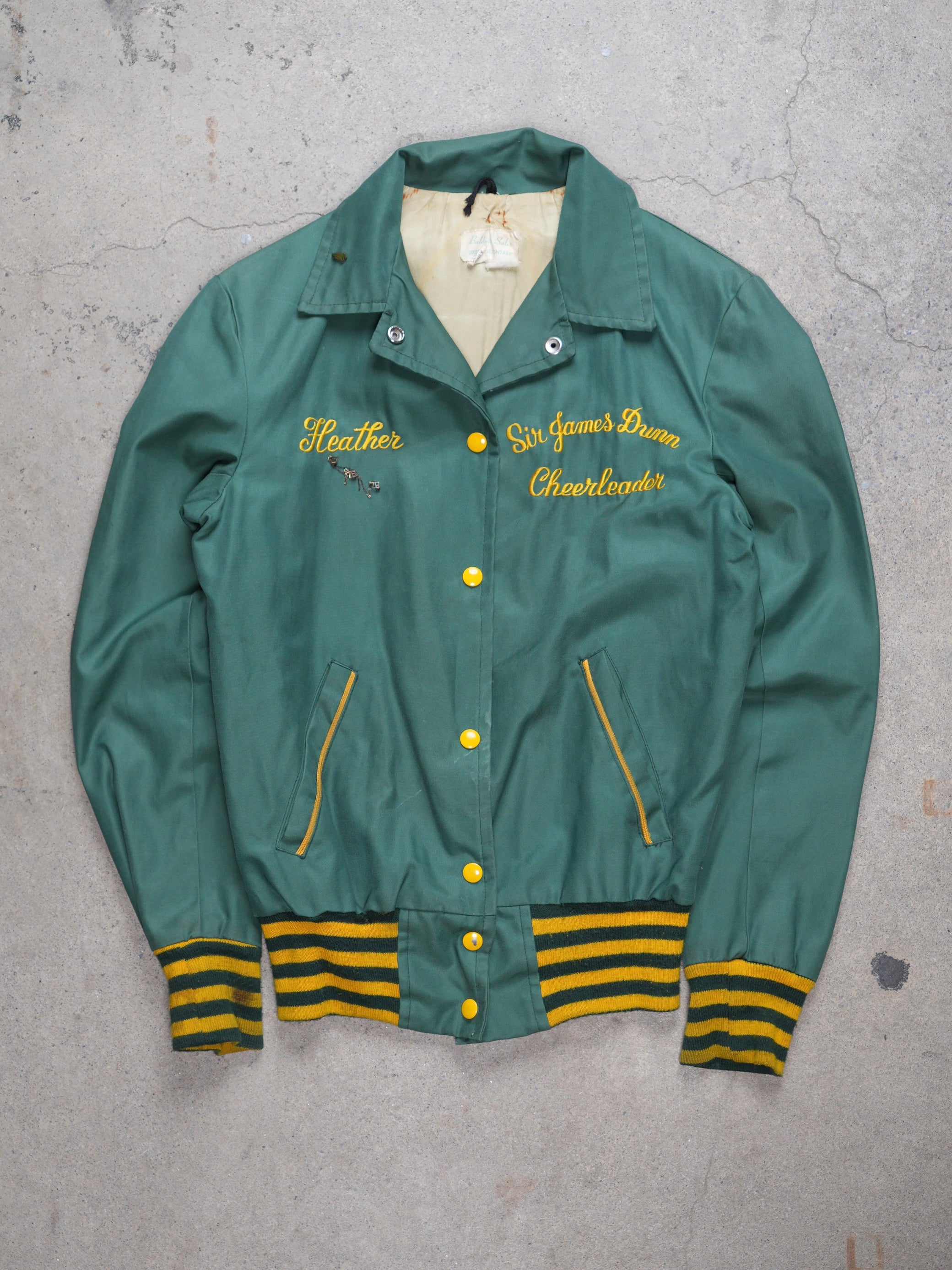 This Sir James Dunn Cheerleader Jacket from the 70s is a rare find. Made of synthetic materials in bright green and yellow, it features a casual fit, fastening, and a plain design with a logo and text. Perfect for any sports fan or vintage lover in a size medium.