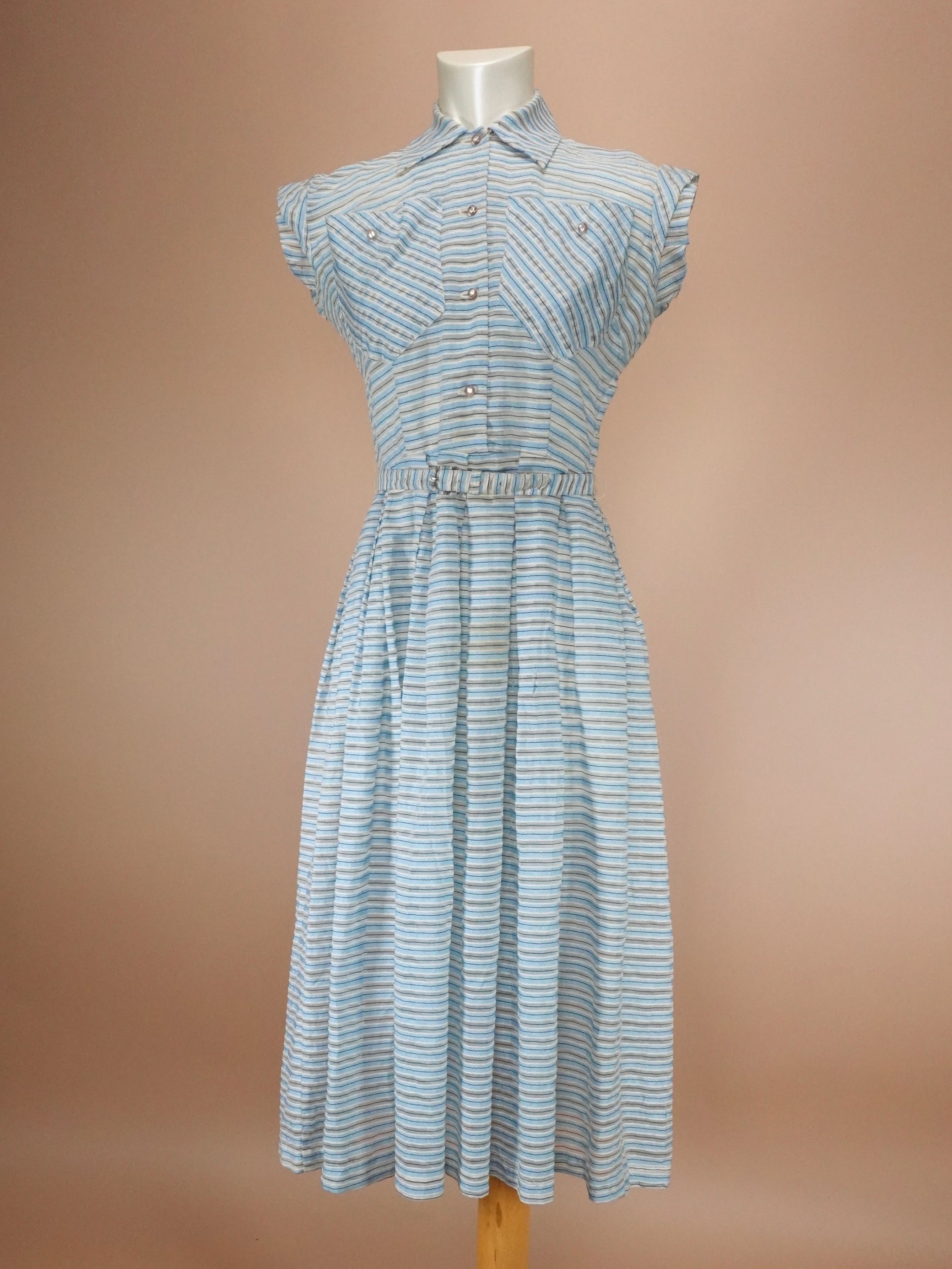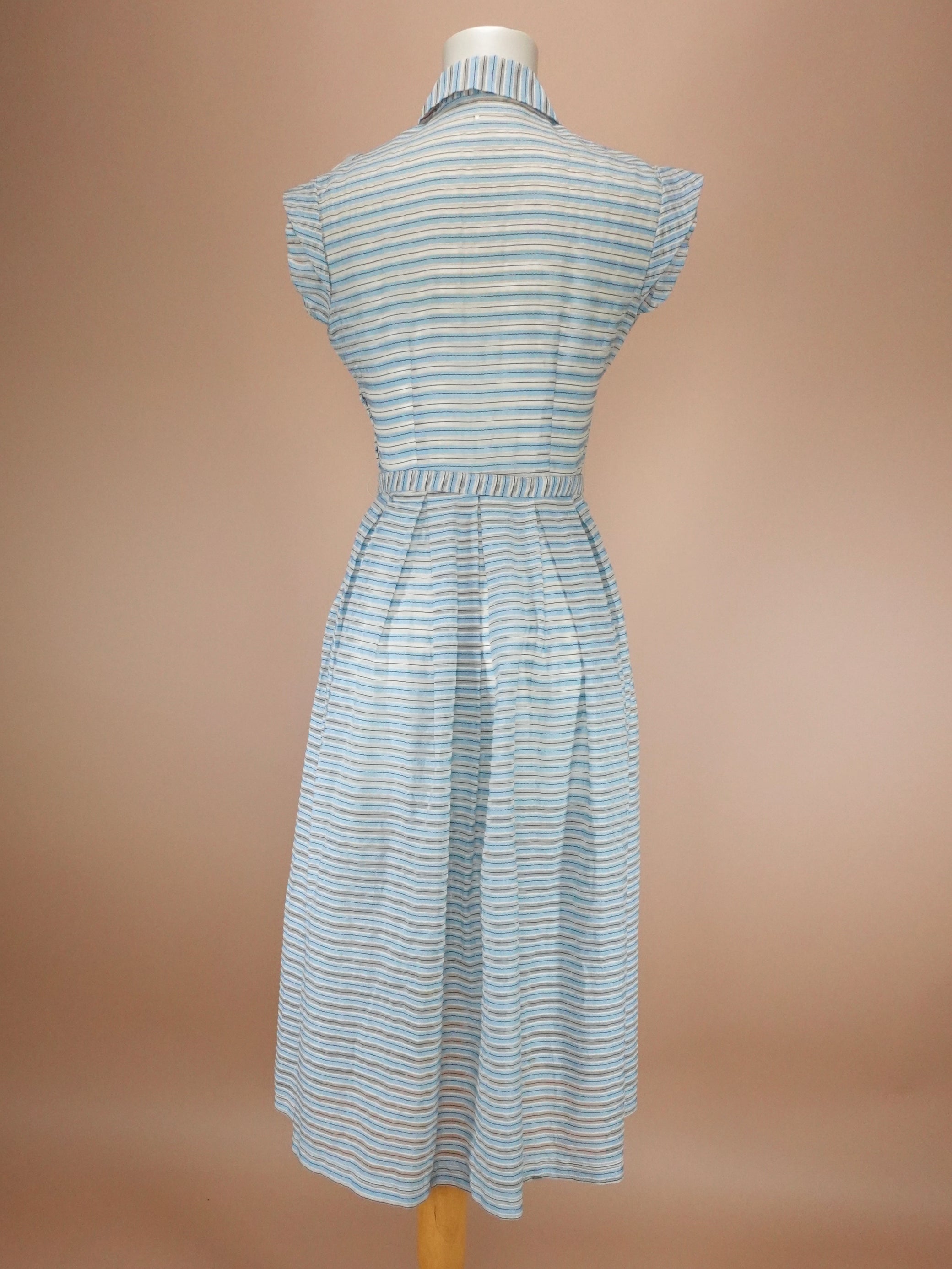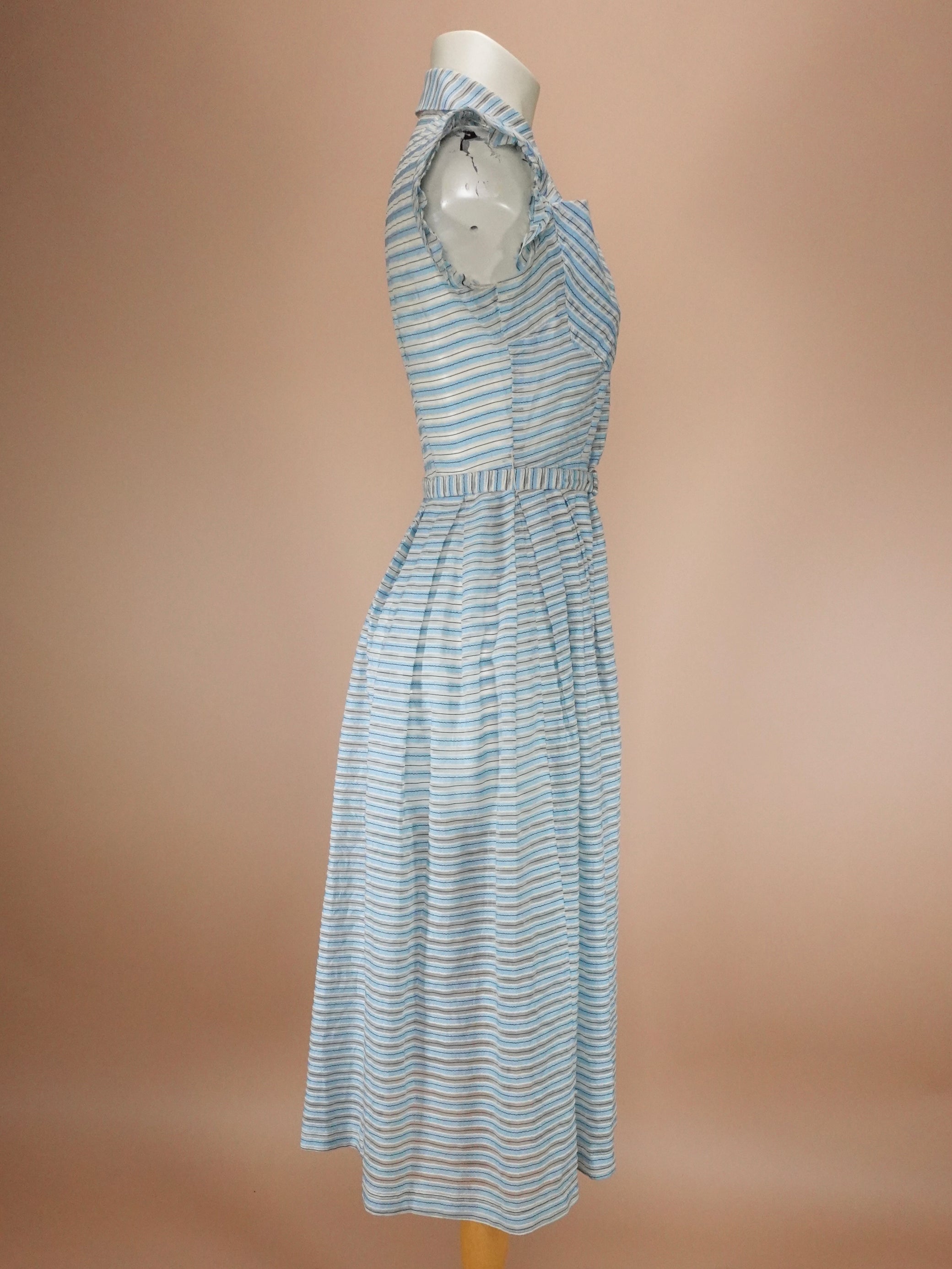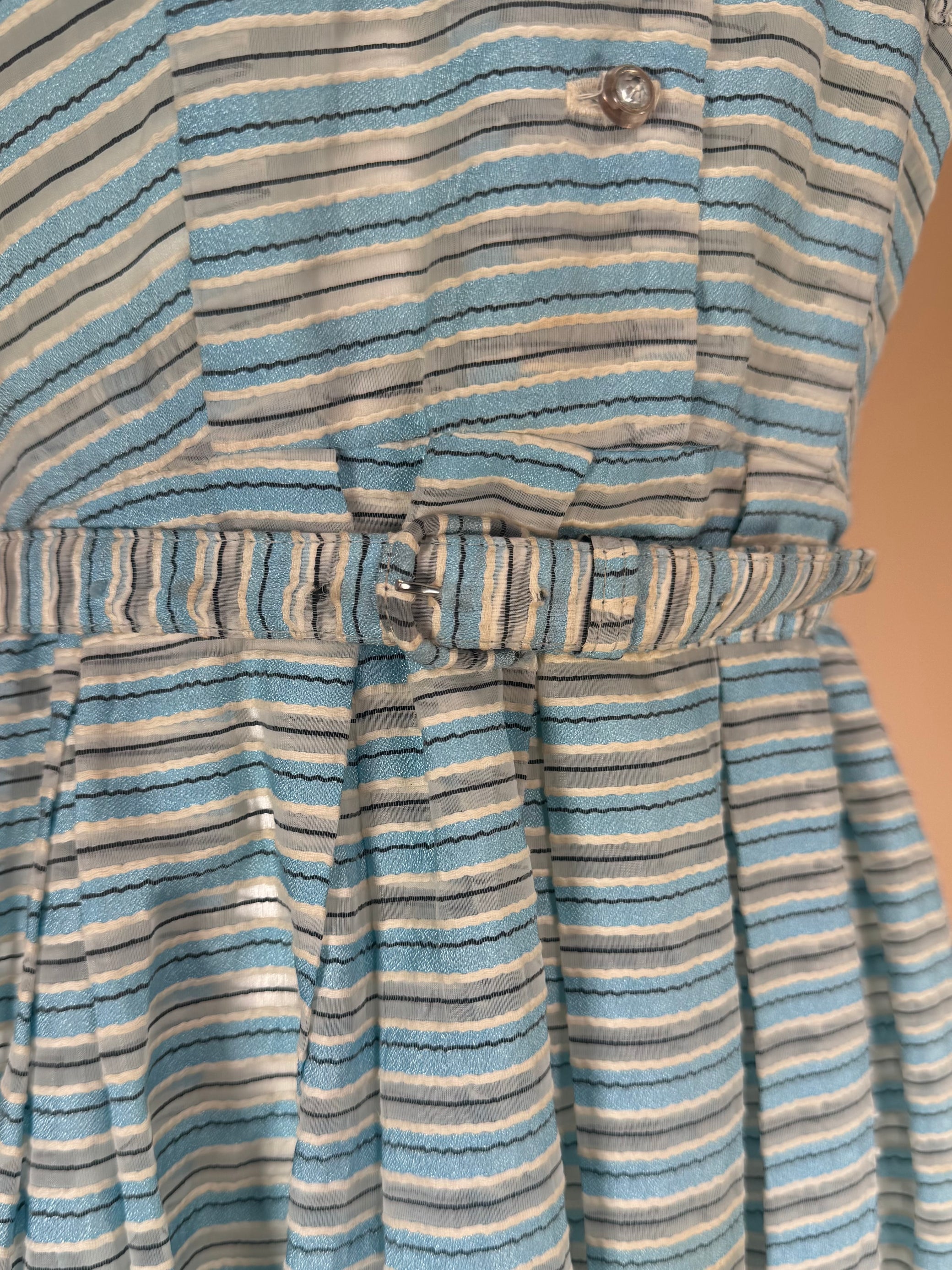 Vintage 1950s | Sky Blue & Stone Grey Striped Cotton Casual Shirtwaist Day Dress