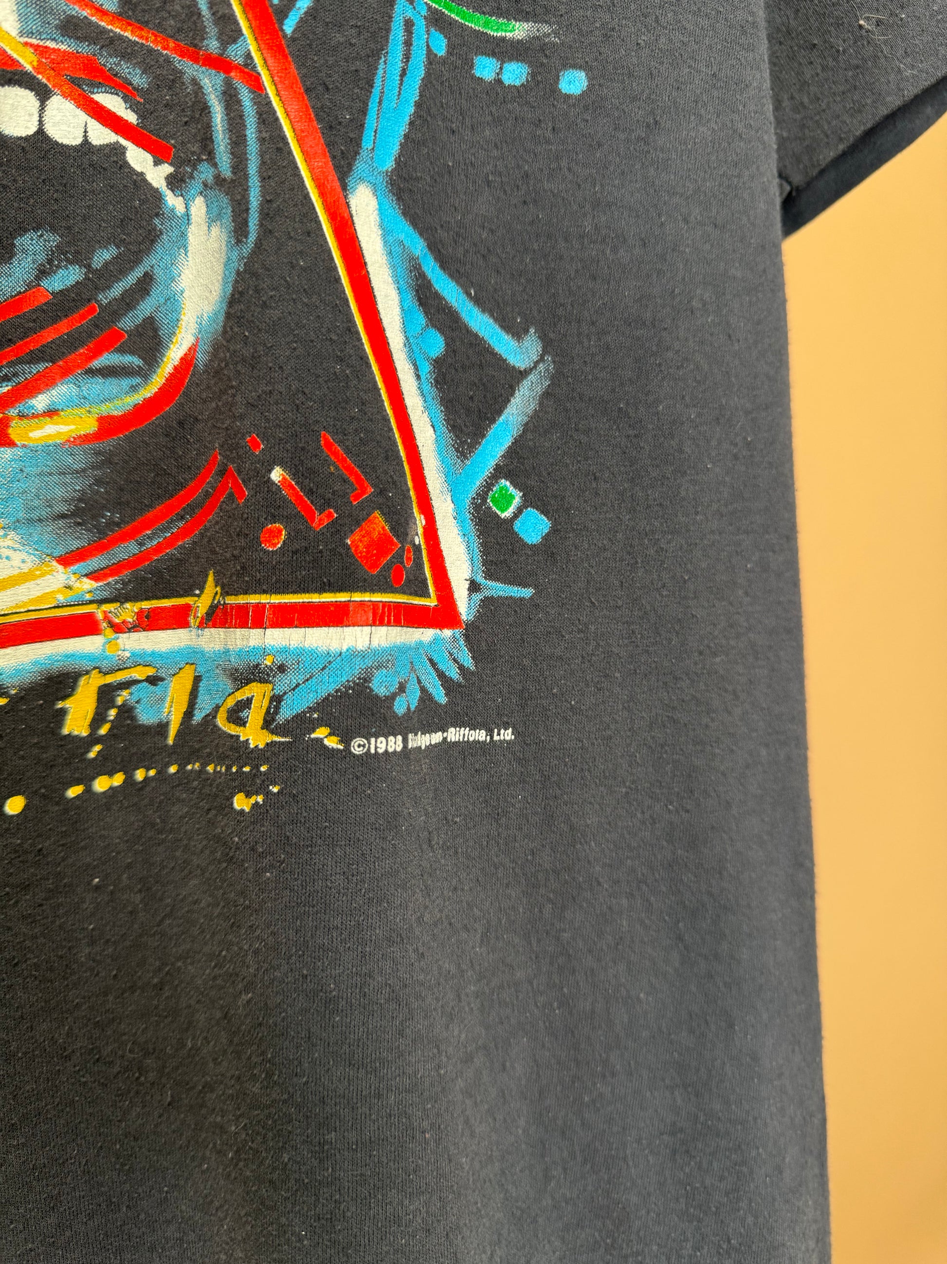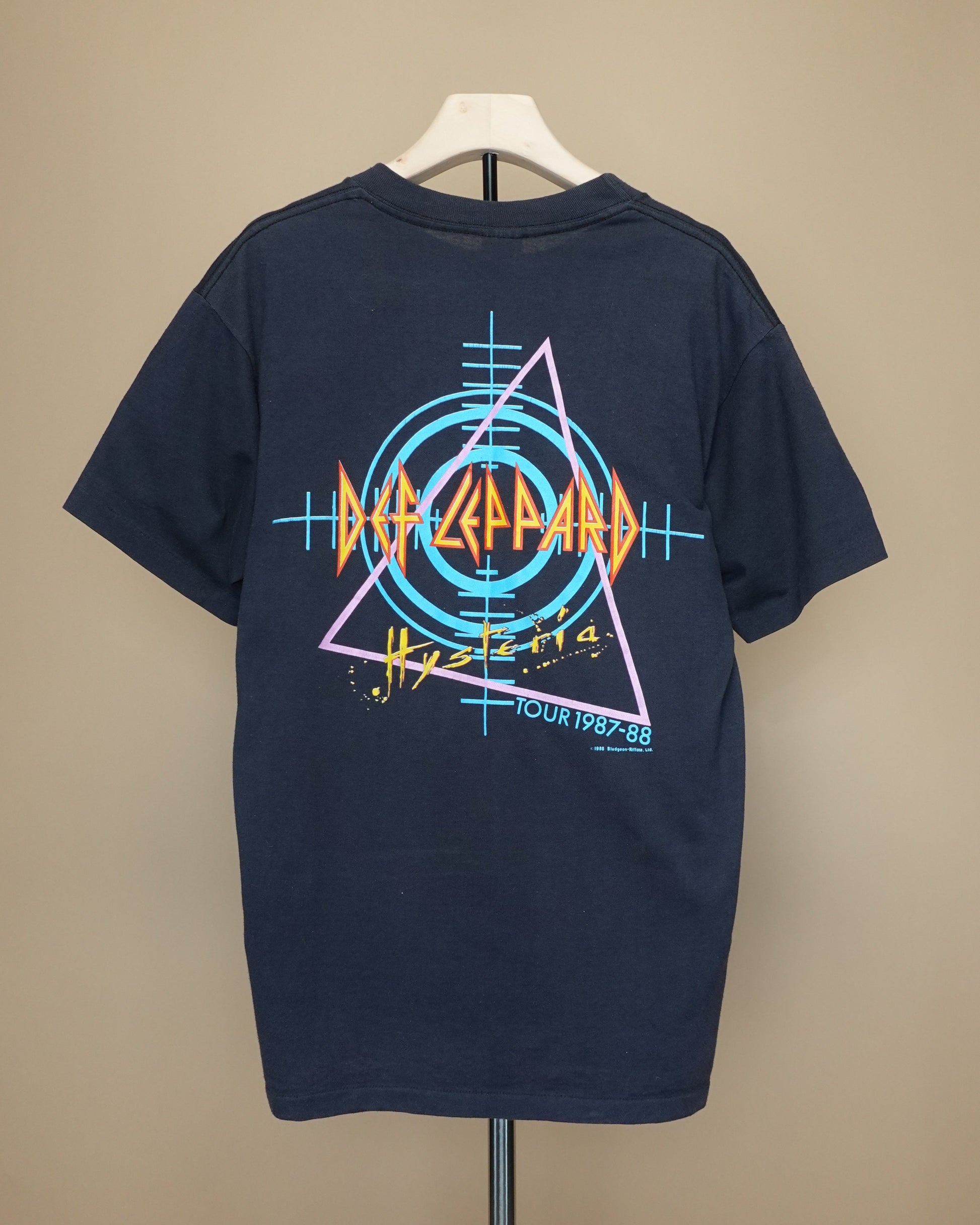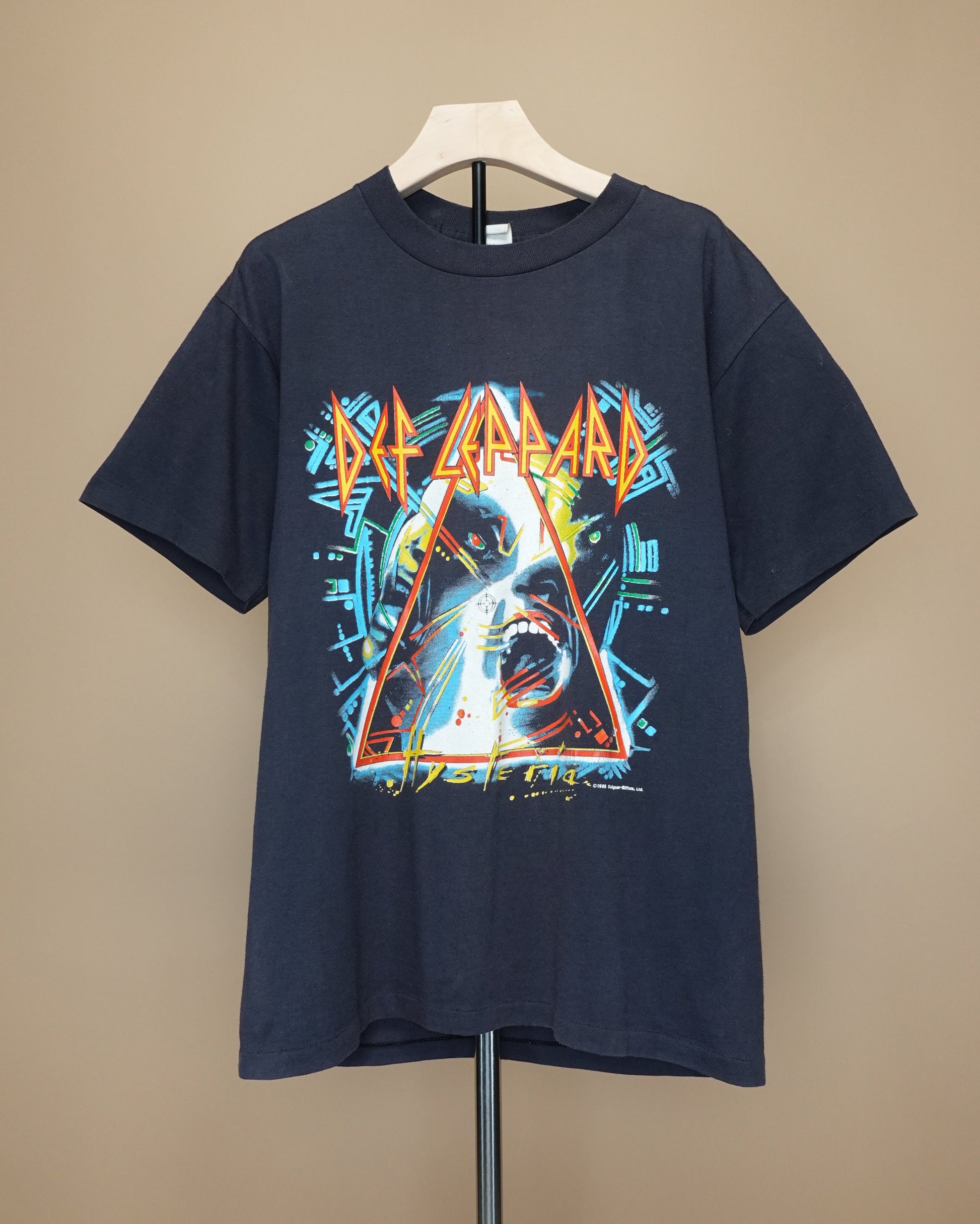 Authentic vintage 1980s Def Leppard Hysteria tour t-shirt featuring vibrant graphics and a classic fit, perfect for rock music enthusiasts and vintage collectors.