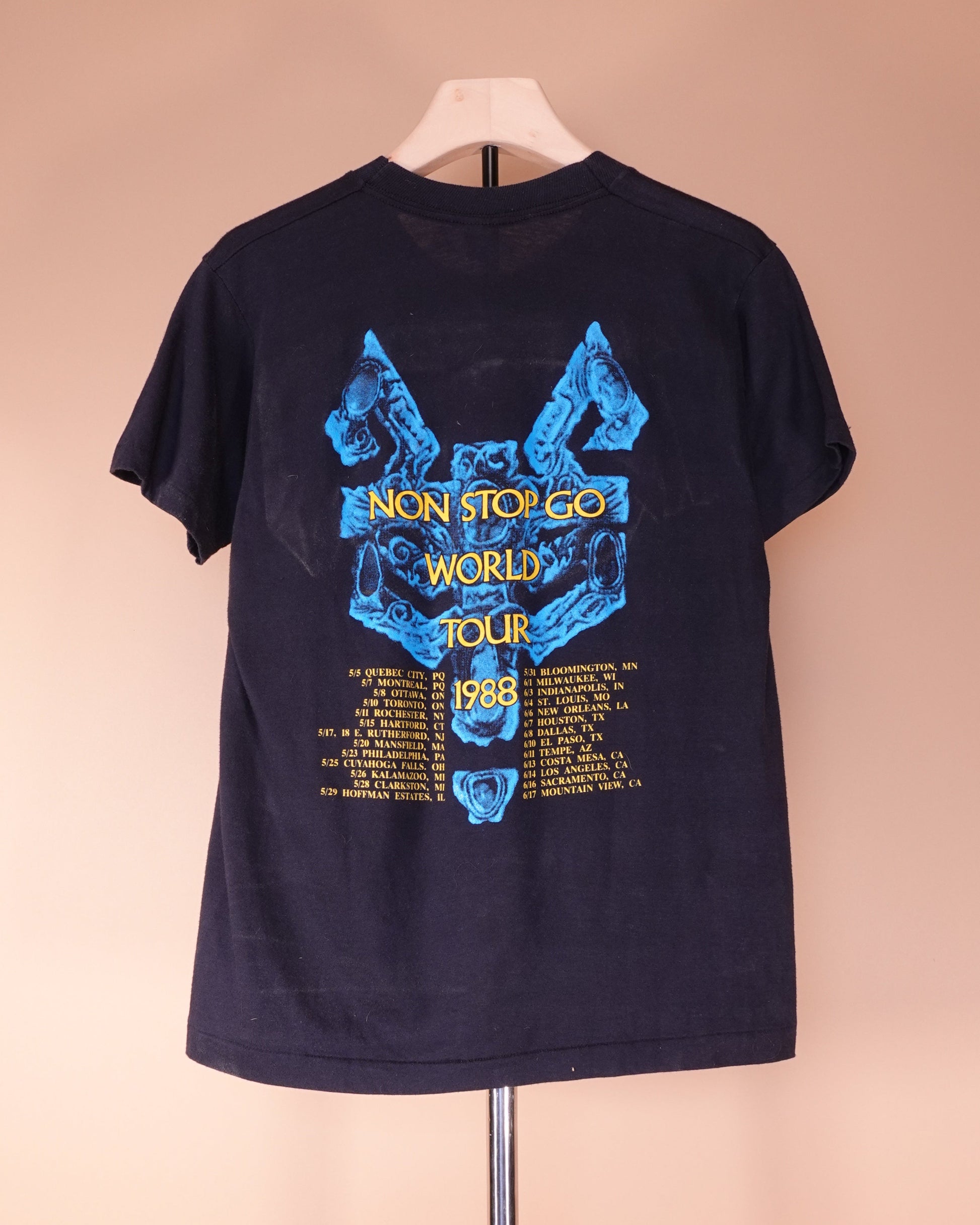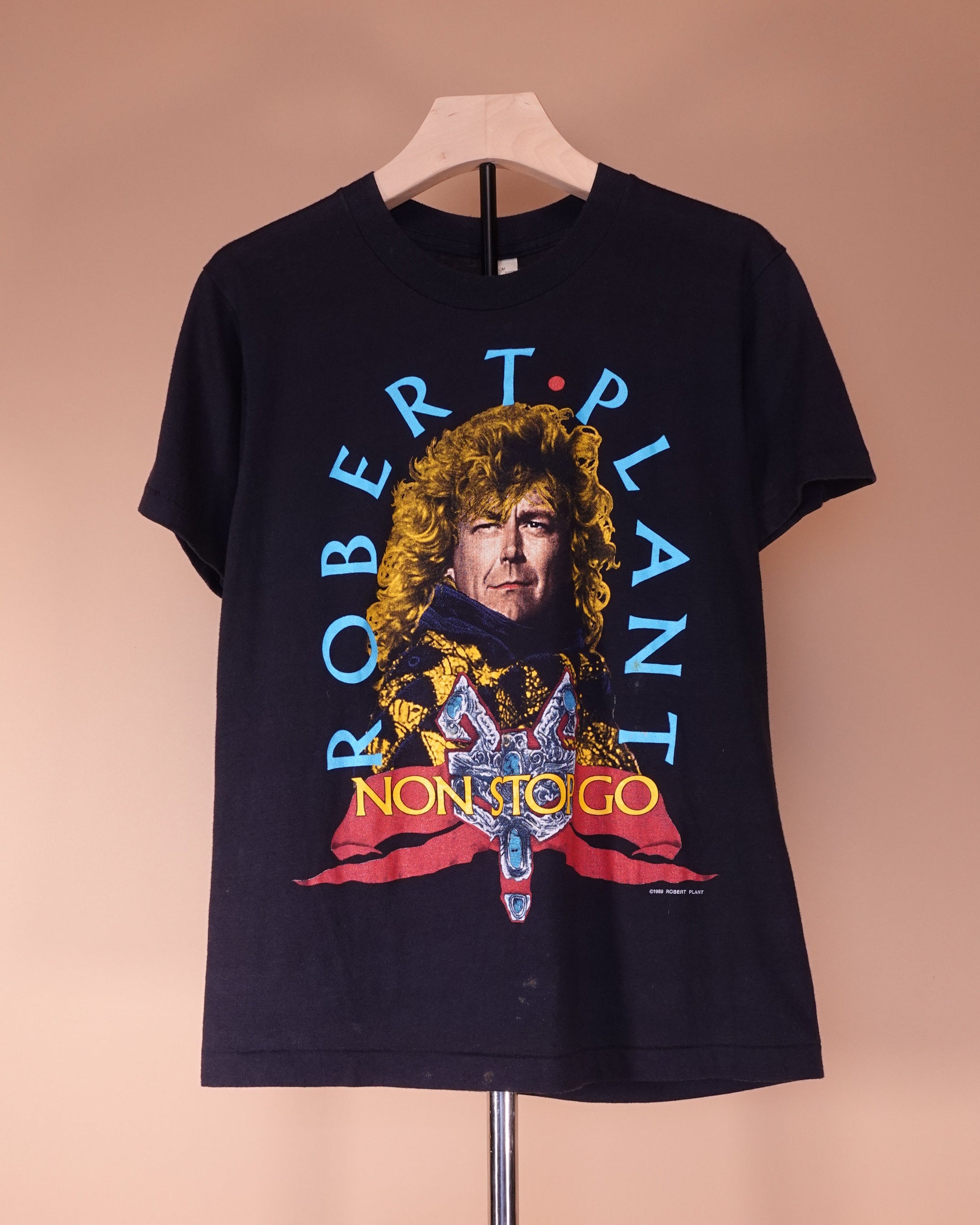Authentic 1980s Robert Plant Non Stop Go World Tour t-shirt, featuring a striking graphic of the iconic musician, perfect for rock music enthusiasts and vintage collectors alike.