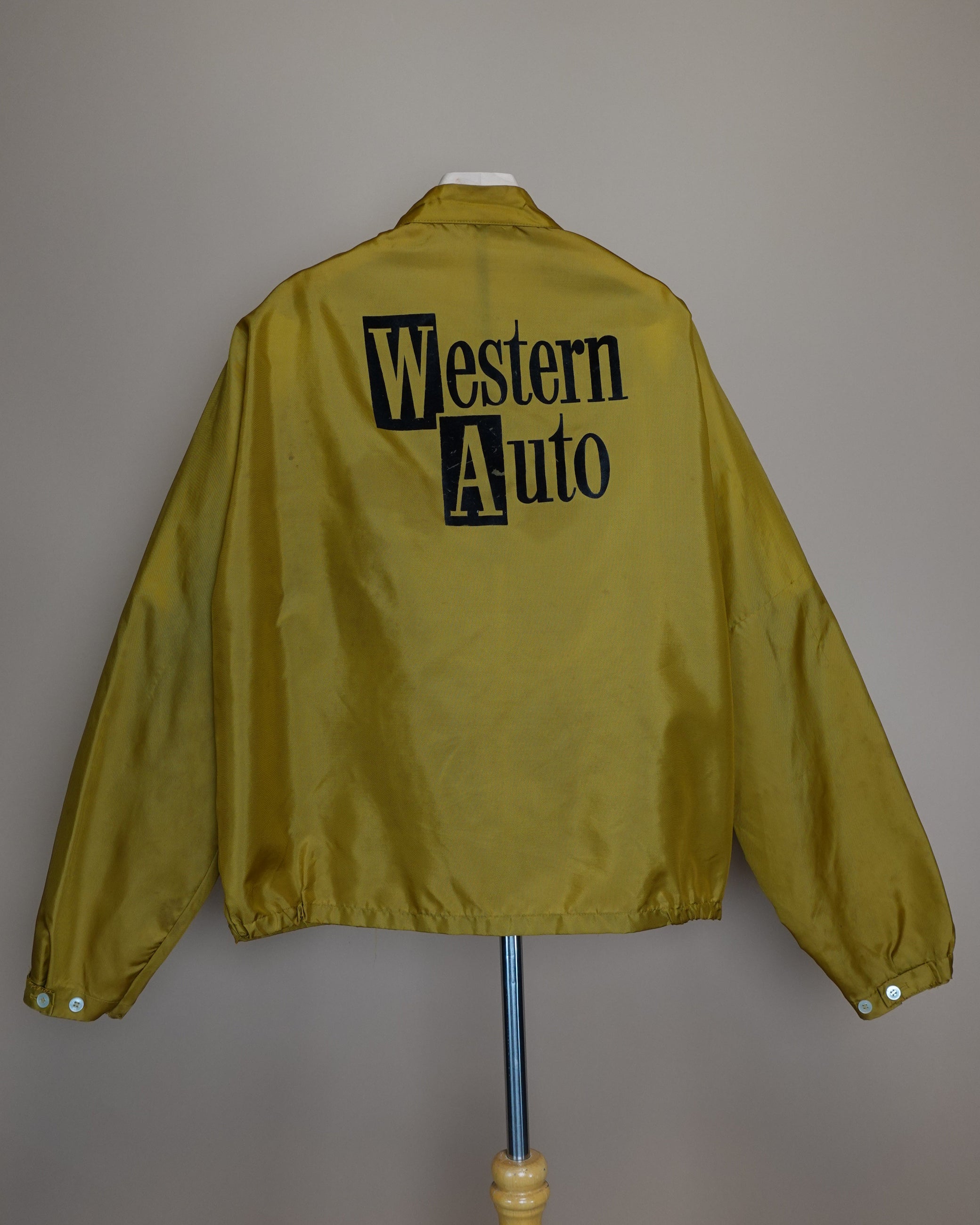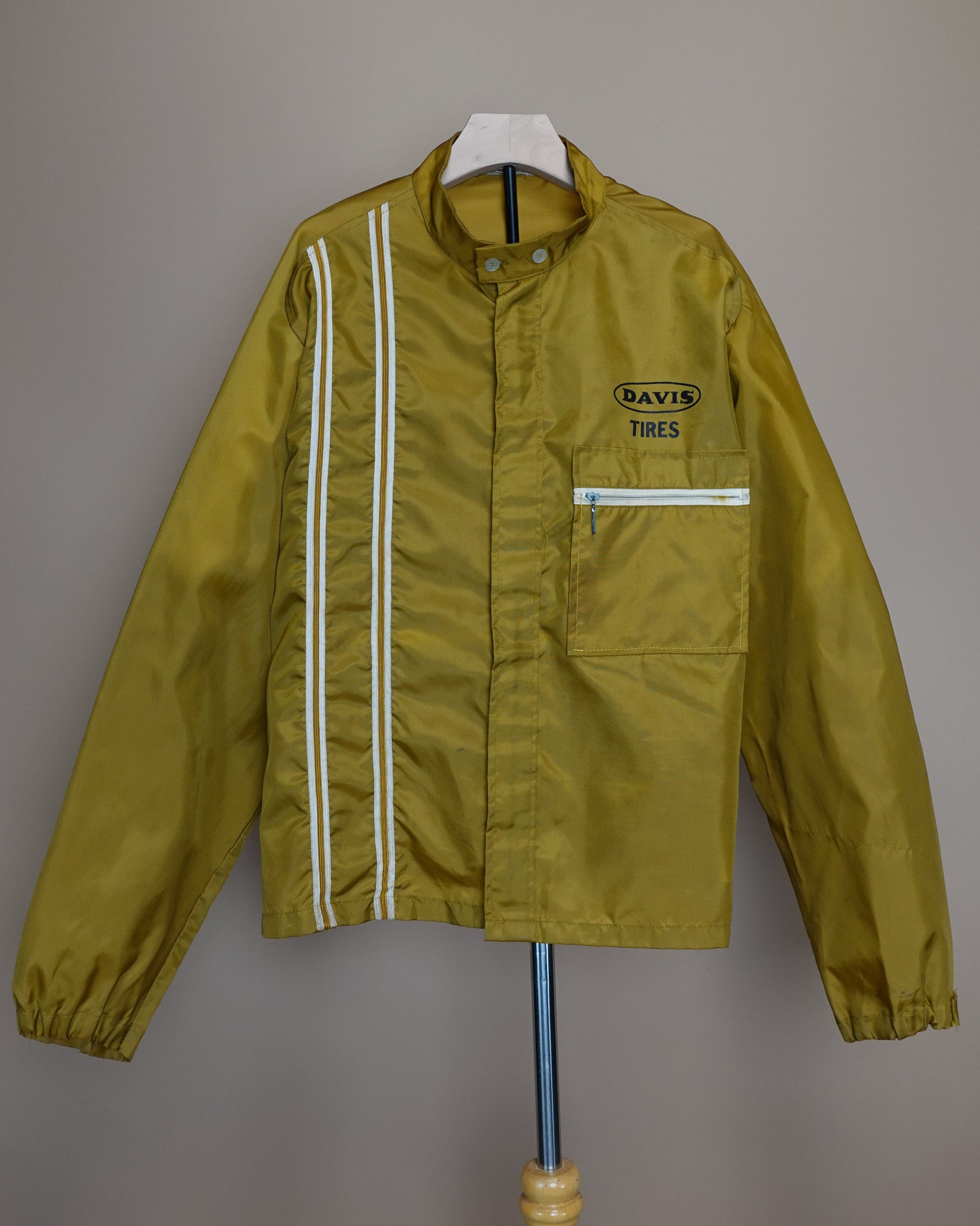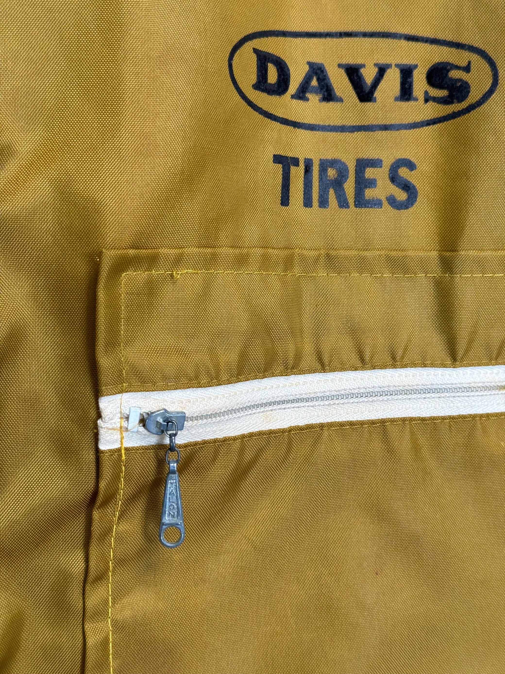 Authentic 1990s Davis Tires work jacket featuring a bold logo and contrasting stripes, perfect for adding a vintage touch to your casual wardrobe.