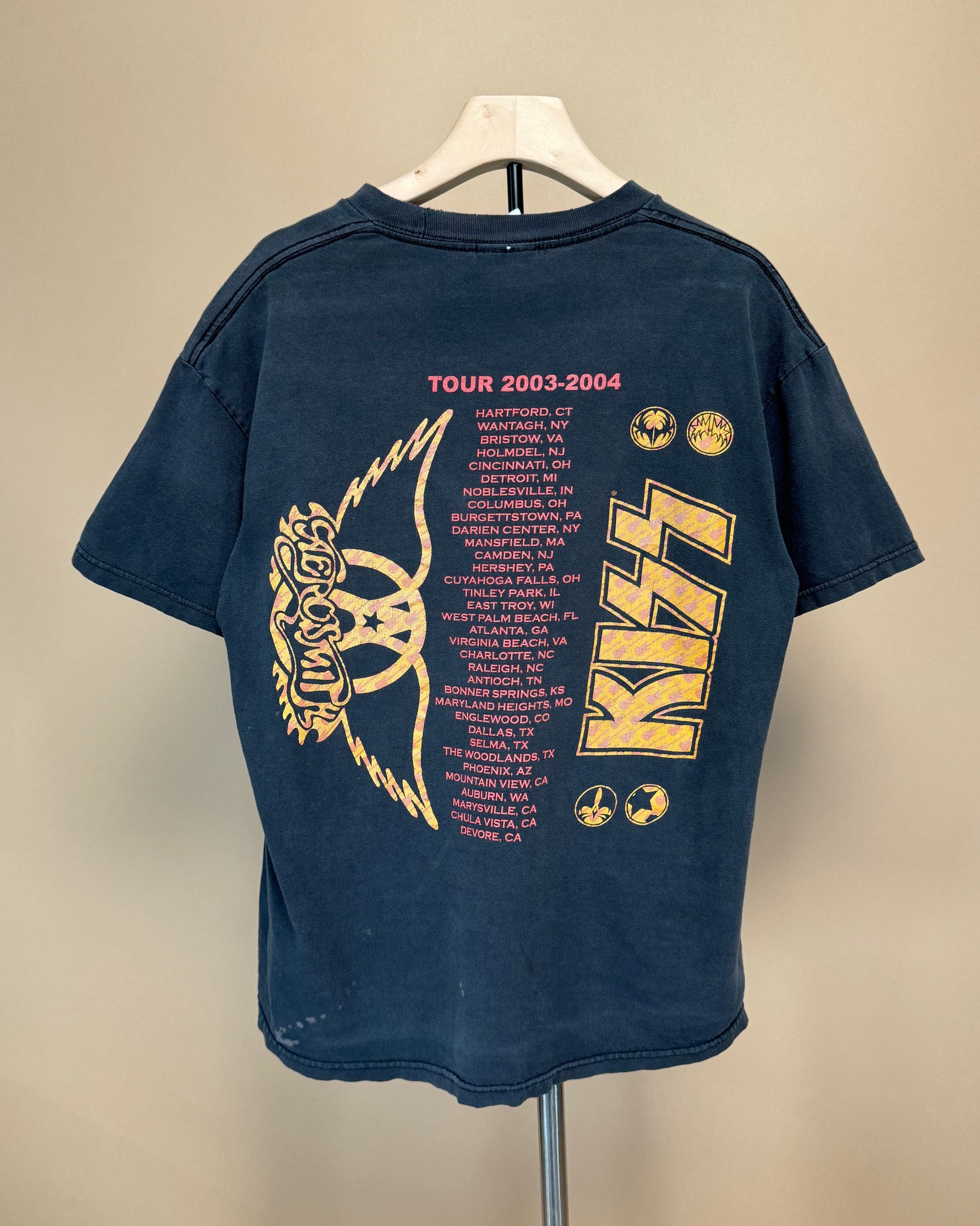 Authentic vintage KISS Aerosmith tour t-shirt from 2003-2004, featuring iconic band graphics and a relaxed fit, perfect for rock music enthusiasts and vintage collectors.