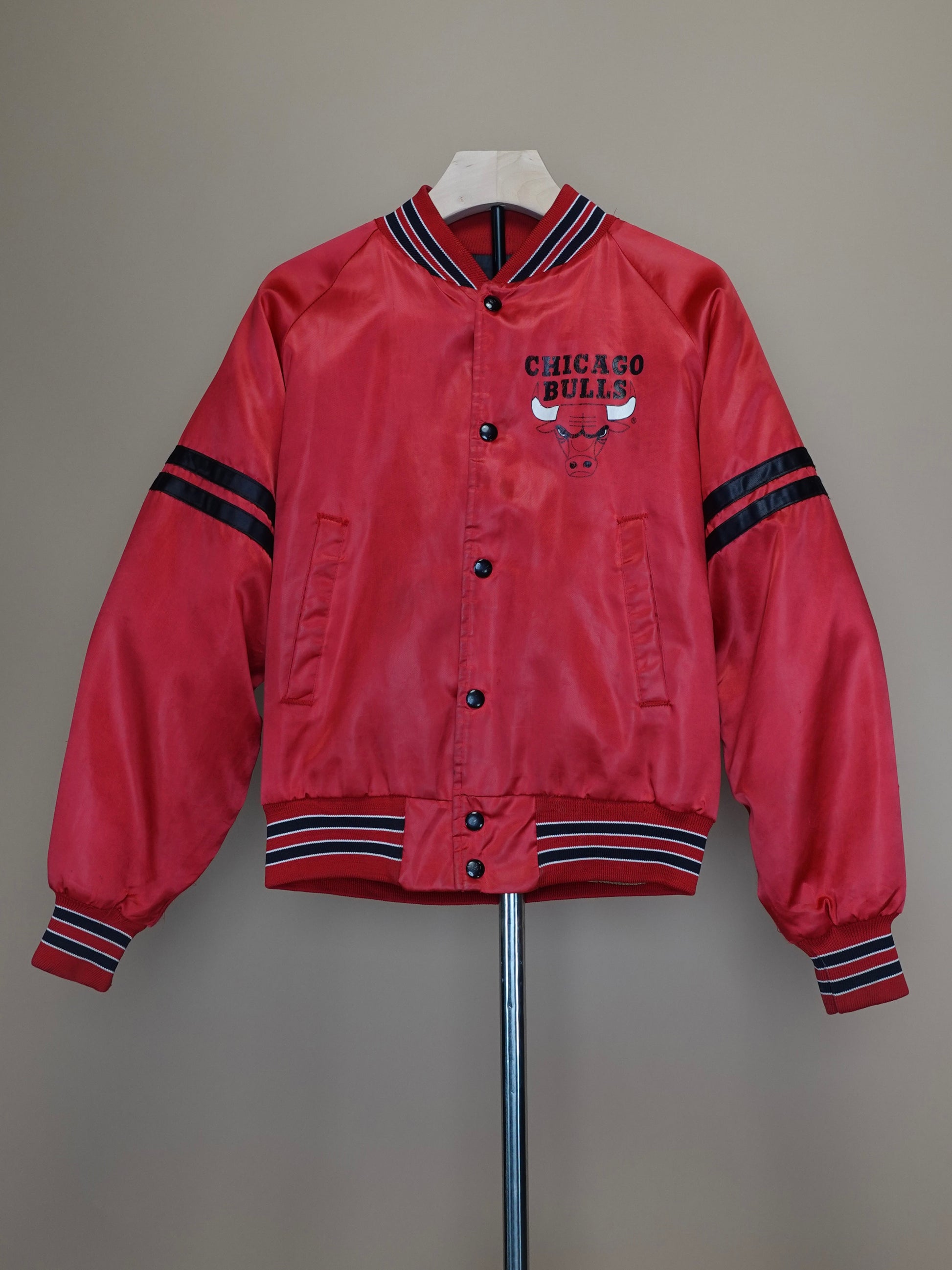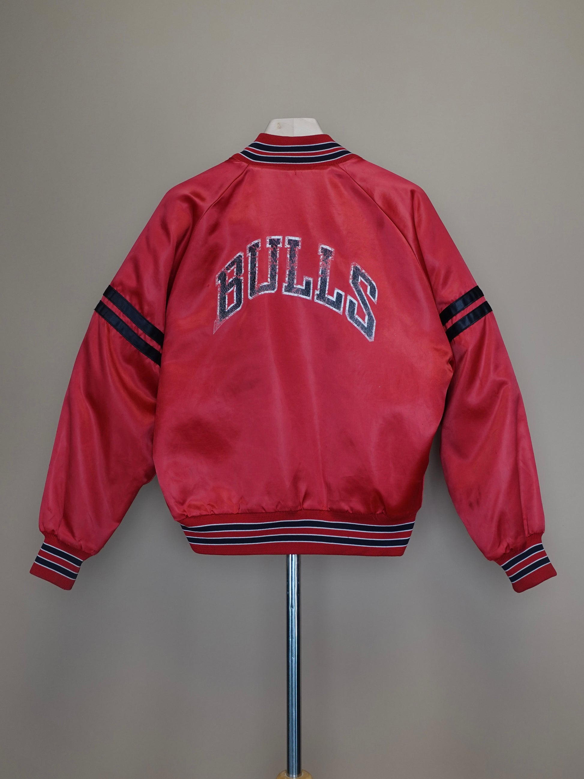 Classic vintage Chicago Bulls satin jacket featuring bold red color, embroidered logo, and striped detailing, perfect for sports enthusiasts and retro fashion lovers.
